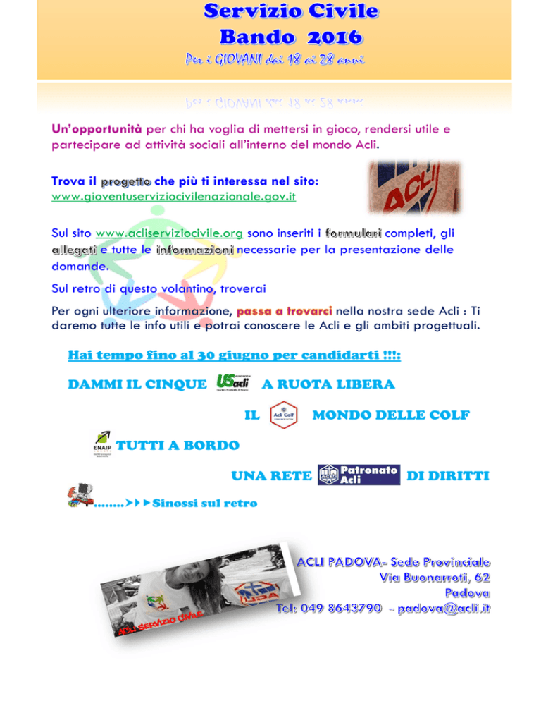 Un’opportunità per chi ha voglia di mettersi in gioco, rendersi utile e partecipare ad attività sociali all’interno del mondo Acli. Trova il che più ti interessa nel sito: www.gioventuserviziocivilenazionale.gov.it Sul sito www.acliserviziocivile.org sono inseriti i completi, gli e tutte le necessarie per la presentazione delle domande. Sul retro di questo volantino, troverai Per ogni ulteriore informazione, nella nostra sede Acli : Ti daremo tutte le info utili e potrai conoscere le Acli e gli ambiti progettuali. Hai tempo fino al 30 giugno per candidarti !!!: DAMMI IL CINQUE A RUOTA LIBERA IL MONDO DELLE COLF TUTTI A BORDO UNA RETE ……..Sinossi sul retro DI DIRITTI IL MONDO DELLE COLF Il progetto intende sostenere le donne italiane e straniere, impiegate nel settore del lavoro domestico e di cura, che hanno bisogno di accompagnamento temporaneo o permanente per la conciliazione dei tempi di lavoro e della vita privata. I volontari in Servizio Civile potranno essere impegnati in: creazione dei punti di ascolto e di aggregazione e gruppi di mutuo aiuto; organizzazione di momenti di socializzazione presso le Acli Colf ; promuovere e facilitare la comunicazione a distanza tra le colf e i loro paesi di origine, istituire servizi di animazione e sostegno extrascolastico per figli delle donne impiegate nel lavoro di cura. DISPERSIONE SCOLASTICA: TUTTI A BORDO Il progetto si pone l’obiettivo di ridurre la dispersione scolastica, in particolare sostenendo il percorso educativo di ragazzi e ragazze dagli 11 ai 18 anni. Le attività prevedono la progettazione, la realizzazione e l’attivazione di laboratori didattici e creativi (laboratori di lingua, di competenze di base, di riciclaggio, di informatica e di arte…..) nei quali si condurranno gli allievi a livello cognitivo, metacognitivo e motivazionale rendendo i percorsi di “recupero” personali ed adattabili in base alle scelte dei tutor, dei volontari impiegati e degli utenti intercettati. PATRONATO LAV. UNA RETE DI DIRITTI Il progetto vuole essere una parziale risposta alle nuove povertà che emergono dalla crisi economica degli ultimi anni. I servizi ACLI incontrano quotidianamente italiani e immigrati, singoli e famiglie dai quali emergono situazioni di povertà, impoverimento e il conseguente rischio di emarginazione sociale. Attraverso il coinvolgimento dei volontari si cercherà quindi di contrastare l’emarginazione sociale delle famiglie e dei singoli in difficoltà, sviluppando sinergie con la rete dei soggetti istituzionali e privati, per promuovere percorsi di cittadinanza e partecipazione. I volontari potranno collaborare alla realizzazione e gestione di uno sportello informativo, alla realizzazione di incontri di gruppo, allo sviluppo della rete di attori impegnati nel settore e alla realizzazione di una guida informativa. US ACLI DISABILITÀ: A RUOTA LIBERA Il progetto ha lo scopo di incentivare la diffusione dell'attività motoria per persone con disabilità su tutto il territorio nazionale, affinché sia maggiormente agevole l'accesso di quest'ultimi alle attività sportive adattate o integrate. Il progetto si pone quindi l’obiettivo di strutturare un percorso tecnico e culturale finalizzato alla diffusione sul territorio italiano delle pratiche sportive dedicate ai disabili, elaborato in modo tale da permettere l’incontro anche con ragazzi e ragazze provenienti da provincie diverse da quelle di appartenenza. I volontari saranno coinvolti nell'organizzazione delle attività ludiche ricreative. US ACLI DISPERSIONE SPORT: DAMMI IL CINQUE Il progetto si prefigge di proporre un programma su scala nazionale di contrasto e prevenzione al fenomeno dell’abbandono sportivo precoce. La finalità è il miglioramento della condizione giovanile, intervenendo sui fattori sociali e relazionali tramite il canale piacevole e aggregante dell’attività sportiva. I volontari collaboreranno alla realizzazione delle seguenti azioni: organizzazione di attività ludico sportive appartenenti a diverse discipline; informazione e sensibilizzazione sul ruolo dell'attività fisica per il benessere soggettivo e sul suo valore sociale nei termini di formazione dei cittadini attivi rivolte sia alle famiglie dei destinatari, sia al pubblico più vasto; creazione di reti territoriali di associazioni che lavorano sui temi di sport giovanile, le scuole e servizi giovanili per la condivisione di esperienze e competenze.