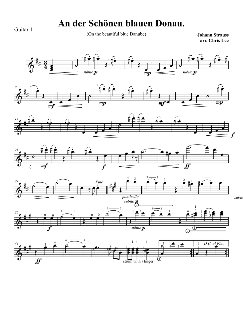 An der Schönen blauen Donau. Guitar 1 (On the beautiful blue Danube) ## 3 & 4 œœœ # # œ. Œ & 7 ˙ 21 & 29 & œ R ## ˙ ## ˙ œ R œ R œ. œR œ. F œ Œ ˙ ### Œ & ƒ 44 subito œ œ R p 3 ˙ œ R1 ˙ 4 . œ Œ 1 2 ˙ œ œ œ œ. Œ œ f 0 œ Œ P œ ‰ œ œ. J 4 œ R œ. œR œ. Fine 1 0 4 œ œ 1 œ. œR œ. œ Œ œ œ 1 1 œ. œ # # # Œ œ œ0 ˙ & f 36 œ. Œ œ R œ R œ œ œ œ F . # # œ Œ œR œ. & 14 3 0 œ. 3 œ R œ. Œ œ R œ. œ R œ. œR œ. Johann Strauss arr. Chris Lee œ P œ R œ. Œ ### ˙ Œ œ 1 Œ Fœ œ R œ. Œ subito œ. Œ ˙. œ œ3 œ3 3 p i 1 2 3 strum with i finger 1 4 1. œ p 4 œ. œ R œ R œ ˙ œ œ œ #œ œ œœœ 0 1 œ œm i J2 3 œ œœ œœ œœ 23œœœ i i i a œ R p2 3 4 œ 3œ œ œ3 œ3 ponticello subito 1 .. Œ œ ˙ œ œ subito p œ ˙ œ œ J‰ . œ4 œ3 œ œR œ. œ R œ R œ. P œ œ œ f œ œ œ ƒ œ œ2 # œ1 # œ œ œ Œ Œ œ 3œ 1 1 subito œ # œœ 13 œœ 13 œœ œœ 4 2 1 3 1 .. 1œ Œ 2. œ D.C. al Fine ..
