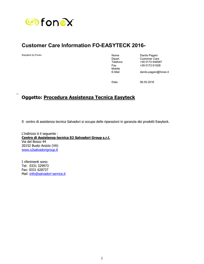 Customer Care Information FO-EASYTECK 2016Easyteck by Fonex Nome Dipart. Telefono Fax Mobile E-Mail Danilo Pagani Customer Care +39 0172 646587 +39 0172 61028 Data 06.05.2016 [email protected] _ Oggetto: Procedura Assistenza Tecnica Easyteck Il centro di assistenza tecnica Salvadori si occupa delle riparazioni in garanzia dei prodotti Easyteck. L’indirizzo è il seguente : Centro di Assistenza tecnica S2 Salvadori Group s.r.l. Via del Bosco 44 20152 Busto Arsizio (VA) www.s2salvadorigroup.it I riferimenti sono: Tel: 0331 329973 Fax: 0331 628727 Mail :[email protected] 1 GESTIONE TELEFONI CELLULARI (GARANZIA) 1. AZIONI AL RICEVIMENTO DEL PRODOTTO DAL CLIENTE Il negozio al momento del ricevimento di un prodotto difettoso da parte del cliente, svolge le seguenti azioni: 1.1 1.2 1.3 1.4 verifica ammissibilità dei documenti (solo per prodotti in garanzia) verifica ammissibilità dell’apparato (solo per prodotti in garanzia) compilazione modulo “Modulo per richiesta assistenza tecnica” (on line) preparazione prodotti per la spedizione 1.1 VERIFICA AMMISSIBILITÀ DEI DOCUMENTI (solo per prodotti in garanzia) Il negozio verifica per prima cosa che il prodotto ricevuto dal cliente sia effettivamente riparabile I prodotti RIPARABILI IN GARANZIA e Fuori GARANZIA sono i prodotti CELLULARI Easyteck e relativi ACCESSORI Originali. Tutti i prodotti sono coperti dalla garanzia del costruttore per un periodo di 24 mesi dalla data di acquisto. Tutti gli accessori godono di un periodo di garanzia di 06 mesi dalla data di acquisto. Pertanto è INDISPENSABILE che il negozio invii, allegato ad ogni singolo terminale, la FOTOCOPIA dello scontrino fiscale (o fattura). Il prodotto deve essere sempre inviato in assistenza completo di tutti gli accessori a corredo del prodotto . Importante: l’apparecchio gode di 24 mesi di garanzia se accompagnato da scontrino fiscale, se con fattura a P.IVA il prodotto avrà una garanzia limitata a 12 mesi. Gli scontrini che dovessero arrivare come manomessi, ovvero contenenti cancellazioni di prezzi o prodotti, con importi non corrispondenti con il reale prezzo di mercato, non saranno ritenuti validi. Il negozio, infine, farà la fotocopia dello scontrino originale restituendolo al cliente. Importante: in caso di rientro dello stesso apparato, qualora la data scontrino sia diversa dalla data scontrino della riparazione precedente, l’assistenza Fonex provvederà ad emettere un preventivo per la riparazione Fuori Garanzia. 2 1.2 VERIFICA AMMISSIBILITÀ DELL’APPARATO (solo per prodotti in garanzia) Ogni cellulare ed ogni accessorio inviato all’assistenza Fonex per la riparazione in garanzia dovrà rispettare, oltre a quanto già indicato, anche le seguenti condizioni: 1. Non deve presentare danni meccanici quali, ad esempio, display rotto, connettori deformati, antenna spezzata, parti estetiche incrinate o deformate. 2. Non deve presentare ossidazioni od infiltrazioni di liquidi, rilevabili in particolare nella zona dei contatti batteria, del lettore SIM e della presa servizi. 3. Non deve presentare danni dovuti a fulminazioni, rilevabili in particolare nella zona dei contatti batteria e della presa servizi che risulterebbero in questo caso anneriti. Se viene rilevata una di queste condizioni il prodotto viene considerato Fuori Garanzia e pertanto verrà inviato apposito preventivo per la riparazione dello stesso. L’assistenza Fonex si riserva comunque di verificare la riparabilità del prodotto inviato sia in garanzia sia fuori garanzia. FONEX NON RISPONDE DI EVENTUALI PERDITE DI DATI PERSONALI, PERTANTO SI CONSIGLIA UN BACK UP DEI DATI PRIMA DELL’INVIO IN ASSISTENZA. 3 La tabella sotto è indicativa e d’aiuto per gestire i casi più frequenti: VERIFICA Ossidazione 1 (Verifica connettore servizi/ presa RF/ contatti batteria/ simcard) 2 3 4 5 6 7 8 9 10 11 12 13 14 15 16 17 18 STATO AZIONE APPARATO Inviare a SALVADORI NON per controllo CONFORME APPARATO Inviare a SALVADORI Garanzia Fabbricante scaduta NON per riparaz. fuori CONFORME garanzia APPARATO Inviare a SALVADORI Sigillo di garanzia scolorito per contatto con liquido NON per controllo CONFORME Inviare a a Segni di caduta o manomissione (DISPLAY ROTTO, ESTETICA APPARATO SALVADORI per DANNEGGIATA, CONTATTI BATT/SIM ROTTI, ANTENNE NON riparaz. fuori ROTTE) CONFORME garanzia Inviare a a APPARATO SALVADORI per Sigillo di garanzia violato (se presente) NON riparaz. fuori CONFORME garanzia Inviare a a APPARATO Non si accende SALVADORI per CONFORME ripar.in garanzia Inviare a a APPARATO Display e led difettosi SALVADORI per CONFORME ripar.in garanzia Inviare a a APPARATO Funzione vibrazione SALVADORI per CONFORME ripar.in garanzia Inviare a a APPARATO Tastiera difettosa SALVADORI per CONFORME ripar.in garanzia APPARATO Inviare a SALVADORI Non funziona audio CONFORME per ripar.in garanzia Inviare a a APPARATO Non funziona la suoneria SALVADORI per CONFORME ripar.in garanzia APPARATO Inviare a SALVADORI Non funziona presa servizi CONFORME per ripar.in garanzia Inviare a a APPARATO No rete SALVADORI per CONFORME ripar.in garanzia Inviare a a APPARATO Interferenze in conversazione (cade linea/difficoltà nel collegamento) SALVADORI per CONFORME ripar.in garanzia Inviare a a APPARATO Non carica SALVADORI per CONFORME ripar.in garanzia Inviare a a APPARATO Funzionalità (Flip/tasti volume/Roller/...) SALVADORI per CONFORME ripar.in garanzia APPARATO Inviare a SALVADORI Problemi SW (Menù/Impostazioni/applicazioni) CONFORME per ripar.in garanzia APPARATO Inviare a a No SIM CARD CONFORME SALVADORI per 4 19 Connettività (GPRS\BLUETOOTH\MMS\...) APPARATO CONFORME 20 Non si connette agli accessori APPARATO CONFORME 21 Altri difetti non dovuti ad incuria o uso improprio APPARATO CONFORME ripar.in garanzia Inviare a a SALVADORI per ripar.in garanzia Inviare a a SALVADORI per ripar.in garanzia Inviare a a SALVADORI per ripar.in garanzia 1.3 COMPILAZIONE MODULO Fare riferimento al modulo on line del centro di assistenza tec