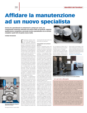 38 Identikit dei fornitori Affidare la manutenzione ad un nuovo specialista Service Air, specializzata in compressori e pompe per vuoto, sta conquistando numerose referenze nel settore delle arti grafiche: rapporto qualità-prezzo competitivo, personale tecnico specializzato ed un servizio completo i punti forti di questa nuova realtà. Cristian Parravicini E Ogni pompa riparata viene sottoposta a rigorosi test di collaudo Rassegna Grafica 6 • aprile 2009 sperienza, serietà e volontà di farsi apprezzare come operatore qualificato nel campo della manutenzione di pompe e compressori: questi gli ingredienti di ServiceAir, una nuova realtà con sede a Cesano Maderno (MI) che con l’umiltà e la grinta che caratterizzano le imprese giovani, ma con le idee chiare, ha già conquistato numerose referenze nel settore grafico e cartotecnico. Tutto ha inizio dall’intraprendenza di Romeo Moscariello: dopo anni di esperienza nella divisione service e ricambi di una nota multinazionale specializzata nella produzione di pompe per vuoto, pompe combinate, compressori e soffianti a canali laterali, Moscariello decide di intraprendere una nuova avventura. Nasce così a fine 2007 ServiceAir, società specializzata nella consulenza e servizi tecnici: in particolare l’azienda propone pacchetti di assistenza tecnica flessibili e personalizzati in relazione alle esigenze del cliente. “Fin dall’inizio – ci spiega Moscariello –abbiamo investito nell’allestimento di una struttura tecnica, un’officina completa con nuove strumentazioni di condition monitoring ed in comunicazione. Siamo partiti offrendo un servizio allineato agli standard delle case costruttrici, ovviamente a prezzi più competitivi, una maggiore presenza e flessibilità. Il nostro primo sforzo è stato perciò quello di fornire un servizio ed un’immagine che facesse percepire il nostro livello di competenza ed organizzazione”. E i risultati non si sono fatti attendere. Una delle caratteristiche più apprezzate è senza dubbio la serietà e competenza tecnica degli interventi: “Utilizziamo solo ricambi originali: questa filosofia aziendale ci ha permesso nel corso dei mesi di acquisire una stima non solo da parte dei nostri clienti, ma anche dai vari costruttori”. Specialisti nel settore grafico Quanto è importante avere una pompa in perfetta efficienza? La risposta non sempre è conosciuta da tutti gli operatori: “Nel mondo delle arti grafiche – continua Moscariello - c’è una grande consapevolezza sull’importanza della pompa all’interno di una macchina da stampa. Si tratta forse di uno dei settori più maturi, in quanto gli operatori sanno benissimo che ad una pompa rotta corrisponde un fermo macchina». Ovviamente esistono diversi atteggiamenti da parte delle aziende grafiche: «Nonostante esistano alcune aziende che preferiscono interfacciarsi con il produttore della macchina, ad oggi abbiamo siglato contratti di assistenza con numerose società grafiche e cartotecniche italiane. Inoltre costruttori importanti quali Mueller Martini, KBA Italia, Ass. Graf., Macchingraf, in caso di malfunzionamenti di pompe montate sulle proprie macchine sanno che possono rivolgersi a noi”. La domanda, a questo punto, nasce quasi spontanea: perché scegliere ServiceAir? “Un cliente deve rivolgersi a noi in quanto trova un rapporto qualità-prezzo più vantaggioso, assicurato da una competenza di alto livello ed un servizio completo. Ciò per noi significa essere attenti e presenti con un servizio allargato, che si traduce in un helpline h24, ma anche nella possibilità di noleggio di pompe in pronta consegna, oltre alla flessibilità e tempestività di intervento che siamo sempre in grado di garantire. Per tale motivo ci presentiamo ai nuovi clienti con i nostri servizi di manutenzione, ma nel corso del tempo spesso instauria- mo un rapporto di fiducia che si sviluppa nella fornitura di ricambi, di pompe nuove o di impianti”. Il settore grafico è, secondo Moscariello, più consapevole rispetto ad altri comparti: “Quello che noi stiamo cercando di comunicare ai diversi settori merceologici è che, nella complessità di una linea produttiva, la perfetta efficienza di una pompa risulta fondamentale al fine di garantire la massima produttività ed evitare fermi macchina”. SERVICE AIR – Cesano Maderno MI Intervento di assistenza su pompe in dotazione ad una macchina Heidelberg Un servizio allargato ServiceAir opera su tutto il territorio nazionale, con la vendita di prodotti nuovi, ricambi ed interventi di riparazione: il servizio assistenza opera principalmente in tutte le regioni del nord e centro Italia, ma attraverso collaborazioni con altre società del settore si può garantire il servizio in tutta Italia. L’organico attualmente è composto da cinque persone, tutti con esperienza pluridecennale nel settore: due operano sul territorio per i servizi di manutenzione e tre in officina. In questo inizio 2009 l’azienda ha registrato una crescita significativa: “Rispetto al 2008 – conclude Moscariello - anno del vero avvio, abbiamo ovviamente aumentato il fatturato anche se da Settembre 2008 ad oggi è percepibile un rallentamento nella crescita, dovuto alla situazione economica di mercato. Il motivo è semplice: se le aziende producono di meno, ne consegue una minore usura dei componenti”. ServiceAir ha tuttavia deciso di bloccare i prezzi per tutto il 2009, in una situazione di mercato in cui alcuni produttori hanno invece ritoccato il proprio listino. “Si tratta secondo noi di un segnale importante verso il mercato che testimonia la nostra volontà di venire incontro alle esigenze delle aziende anche in un momento difficile come quello attuale”.