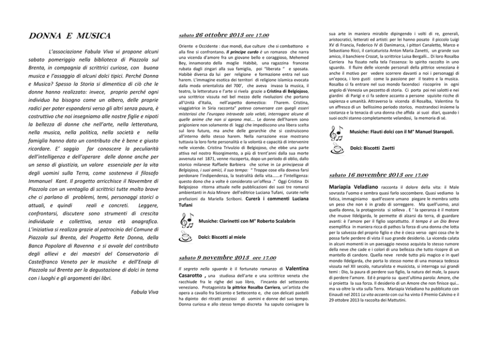 sabato 26 DONNA E MUSICA L’associazione Fabula Viva vi propone alcuni sabato pomeriggio nella biblioteca di Piazzola sul Brenta, in compagnia di scrittrici curiose, con buona musica e l’assaggio di alcuni dolci tipici. Perché Donna e Musica? Spesso la Storia si dimentica di ciò che le donne hanno realizzato: invece, proprio perché ogni individuo ha bisogno come un albero, delle proprie radici per poter espandersi verso gli altri senza paura, è costruttivo che noi insegniamo alle nostre figlie e nipoti la bellezza di donne che nell’arte, nella letteratura, nella musica, nella politica, nella società e nella famiglia hanno dato un contributo che è bene e giusto ricordare. E’ saggio far conoscere la peculiarità dell’intelligenza e dell’operare delle donne anche per un senso di giustizia, un valore essenziale per la vita degli uomini sulla Terra, come sosteneva il filosofo Immanuel Kant. Il progetto arricchisce il Novembre di Piazzola con un ventaglio di scrittrici tutte molto brave che ci parlano di problemi, temi, personaggi storici o attuali, e quindi reali e concreti. Leggere, confrontarsi, discutere sono strumenti di crescita individuale e collettiva, senza età anagrafica. L’iniziativa si realizza grazie al patrocinio del Comune di Piazzola sul Brenta, del Progetto Rete Donna, della Banca Popolare di Ravenna e si avvale del contributo degli allievi e dei maestri del Conservatorio di Castelfranco Veneto per le musiche e dell’Enaip di Piazzola sul Brenta per la degustazione di dolci in tema con i luoghi e gli argomenti dei libri. Fabula Viva ottobre 2013 ore 17.00 Oriente e Occidente : due mondi, due culture che si combattono e alla fine si confrontano. Il principe curdo è un romanzo che narra una vicenda d’amore fra un giovane bello e coraggioso, Mehemed Bey, innamorato della moglie Habibè, una ragazzina francese rubata dagli zingari alla sua famiglia, poi “liberata “ e sposata. Habibè diversa da lui per religione e formazione entra nel suo harem. L’immagine esotica dei territori di religione islamica evocata dalla moda orientalista del 700’, che aveva invaso la musica, il teatro, la letteratura e l’arte si rivela grazie a Cristina di Belgiojoso, una scrittrice vissuta nel bel mezzo delle rivoluzioni che portano all’Unità d’Italia, nell’aspetto domestico: l’harem. Cristina, viaggiatrice in Siria racconta” potevo conversare con quegli esseri misteriosi che l’europeo intravede solo velati, interrogare alcune di quelle anime che non si aprono mai…. Le donne dell’harem sono prigioniere non solamente di leggi che impediscono una libera scelta sul loro futuro, ma anche delle gerarchie che si costruiscono all’interno dello stesso harem. Nella narrazione esse mostrano tuttavia la loro forte personalità e la volontà e capacità di intervenire nelle vicende. Cristina Trivulzio di Belgiojoso, che ebbe una parte attiva nel nostro Risorgimento, a più di trent’anni dalla sua morte avvenuta nel 1871, venne riscoperta, dopo un periodo di oblio, dallo storico milanese Raffaele Barbiera che scrive in La principessa di Belgiojoso, i suoi amici, il suo tempo: “ Troppe cose ella doveva farsi perdonare l’indipendenza, la teatralità della vita…….e l’intelligenza: questo dono che a volte è considerato un’offesa .” Oggi Cristina Di Belgiojoso ritorna attuale nelle pubblicazioni dei suoi tre romanzi ambientanti in Asia Minore dell’editrice Luciana Tufani, curate nelle prefazioni da Mariella Scriboni. Curerà i commenti Luciana Tufani Musiche: Clarinetti con M° Roberto Scalabrin Dolci: Biscotti al miele sabato 9 novembre 2013 ore 17.00 Il segreto nello sguardo è il fortunato romanzo di Valentina Casarotto , una studiosa dell’arte e una scrittrice veneta che racchiude fra le righe del suo libro, l’incanto del settecento veneziano. Protagonista la pittrice Rosalba Carriera, un’artista che opera a cavallo fra Seicento e Settecento e, che con delicati pastelli ha dipinto dei ritratti preziosi di uomini e donne del suo tempo. Donna curiosa e allo stesso tempo discreta ha saputo coniugare la sua arte in maniera mirabile dipingendo i volti di re, generali, aristocratici, letterati ed artisti: per lei hanno posato il piccolo Luigi XV di Francia, Federico IV di Danimarca, i pittori Canaletto, Marco e Sebastiano Ricci, il caricaturista Anton Maria Zanetti, un grande suo amico, il banchiere Crozat, la scrittrice Luisa Bergalli… Di loro Rosalba Carriera ha fissato nella tela l’essenza: lo spirito raccolto in uno sguardo. Il fluire delle vicende personali della pittrice veneziana è anche il motivo per vedere scorrere davanti a noi i personaggi di un’epoca, i loro gusti come la passione per il teatro e la musica. Rosalba ci fa entrare nel suo mondo facendoci riscoprire in ogni angolo di Venezia un pezzetto di storia. Ci porta poi nei salotti e nei giardini di Parigi e ci fa sedere accanto a persone squisite ricche di sapienza e umanità. Attraverso la vicenda di Rosalba, Valentina fa un affresco di un bellissimo periodo storico, mostrandoci insieme la costanza e la tenacia di una donna che affida ai suoi diari, quando i suoi occhi stanno completamente velandosi, la memoria di sé. Musiche: Flauti dolci con il M° Manuel Staropoli. Dolci: Biscotti Zaetti sabato 16 novembre 2013 ore 17.00 Mariapia Veladiano racconta il dolore della vita: il Male sovrasta l’uomo e sembra quasi farlo soccombere. Quasi vediamo la fatica, immaginiamo quell’essere umano piegare le membra sotto un peso che non è in grado di sorreggere. Ma quell’uomo, anzi quella donna, la protagonista si solleva . E ‘ la speranza è il motore che muove Ildelgarda, le permette di alzarsi da terra, di guardare avanti: è l’amore per il figlio soprattutto. Il tempo è un Dio Breve esemplifica in maniera ricca di pathos la forza di una donna che lotta per la salvezza del proprio figlio e che è cieca verso ogni cosa che le possa farle perdere di vista il suo grande de