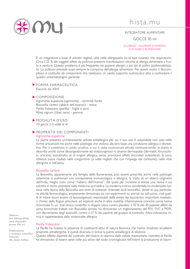 hist a .mu INTEGRATORE ALIMENTARE GOCCE 30 ml ALLERGIE - ALLERGIE STAMINALI CUTANEE E ALIMENTARI è un integratore a base di estratti vegetali utile nelle allergopatie sia di tipo cutaneo che respiratorio. Circa il 25 % dei soggetti affetti da pollinosi presenta manifestazioni cliniche di allergia alimentare a frutta e verdura. Questo problema è più frequente nei pazienti allergici a più tipi di pollini (polisensibilizzati). La pollinosi precede quasi sempre la comparsa dell’allergia alimentare. Per questi motivi il fitocomplesso è costituito da componenti che realizzano un valido supporto nutriceutico atto a contrastare il quadro sintomatologico generale. s FORMA FARMACEUTICA Flacone da 30ml s COMPOSIZIONE Agrimonia eupatoria (agrimonia) - sommità fiorite Boswellia carterii (albero dell’incenso) - resina Perilla frutescens (perilla) - foglie e semi Ribes nigrum (ribes nero) - gemme s MODALITà D'USO 10 gocce 2-3 volte al dì s PROPRIETà DEI COMPONENTI Agrimonia eupatoria: La pianta presenta un’interessante attività antiallergica per cui il suo uso è auspicabile non solo nelle forme orticarioidi ma anche nelle patologie che vedono alla loro base una condizione allergica o disreattiva. Per il contenuto in acido ursolico, a cui è stata riconosciuta attività cortisone-simile, la pianta è descritta anche come decongestionante ed antipruriginoso in diverse dermopatie (dermatiti, foruncolosi, urticaria) soprattutto se di origine allergica, senza provocare effetti secondari indesiderati. Si sono ottenuti buoni risultati nelle congiuntiviti (a volte migliori che con l’impiego del cortisone), nelle riniti allergiche e nell’asma. Ulteriori voci bibliografiche sono disponibili presso MU srl. Pubblicazione a carattere scientifico riservata alla classe medica. Boswellia carterii: La Boswellia, appartenente alla famiglia delle Burseraceae, può essere prescritta anche nelle patologie sistemiche o polmonari con componente immunologica o allergica. Si tratta di un albero originario dell’India, meglio noto come “l’albero dell’incenso”, dal quale per incisione si estrae una resina il cui estratto è molto popolare nella medicina ayurvedica. La moderna ricerca occidentale ha evidenziato tuttavia nella resina della Boswellia una serie di sostanze, chiamate acidi boswellici, dotati di una particolare attività farmacologica, ampiamente dimostrata sia con esperimenti su animali sia sull’uomo, cioè quella di inibire alcuni enzimi (5-lipoossigenasi) responsabili della sintesi dei leucotrieni, importanti mediatori chimici della flogosi articolare, ed implicati anche in altre malattie infiammatorie croniche come l’asma bronchiale. In un trial clinico condotto in doppio cieco contro placebo, il 70 % dei 40 pazienti affetti da asma bronchiale trattati con Boswellia serrata, ha dimostrato un miglioramento del FEV, FVC e PEFR, con decremento degli eosinofili, contro il 27 % dei pazienti del gruppo di controllo. Altra indicazione clinica è rappresentata dalla rinosinusite allergica. Perilla frutescens: La Perilla ha rivelato la presenza di costituenti attivi di natura flavonica che hanno mostrato eccellenti proprietà antiallergiche, è quindi divenuta in breve la pianta antiallergica di elezione. Questo effetto dipende dal controllo del rilascio di istamina dalle cellule mastocitarie: l’estratto di Perilla ha dimostrato di essere sette volte più attivo del sodio cromoglicato nell’inibire la produzione di istami- his ta . mu na. I componenti ritenuti funzionali per l’attività antiallergica della Perilla sono i flavonoidi in forma agliconica anziché glucosidica, fatto eccezionale in natura ma che può ben spiegare la superiore attività antiallergica della Perilla rispetto ad altre piante. Infatti è stato confermato che l’attività inibitoria dei flavonoidi in forma agliconica sull’enzima lipossigenasi nel meccanismo antiallergico è nettamente superiore a quella dei corrispondenti derivati glucosidi. Numerosi sono ad oggi i protocolli clinici disponibili, in cui sono stati coinvolti soggetti affetti da allergie di varia natura quali riniti, asma, dermatiti atopiche, disturbi allergici. Gli studi hanno considerato sia parametri serici, come i livelli delle immunoglobuline, sia parametri sintomatici, come la desquamazione cutanea, la lacrimazione, la rinorrea e la frequenza degli starnuti. In tutti i casi, il gruppo trattato con estratto di Perilla ha mostrato miglioramento significativo rispetto al gruppo di controllo. La Perilla produce un abbassamento dei livelli serici di IGE, cui consegue un miglioramento nelle riniti allergiche, febbre da fieno e orticarie La Perilla è anche un inibitore selettivo dell’enzima 5-lipossigenasi, con conseguente inibizione della produzione di leucotrieni, mediatori delle forme allergiche e in particolare della bronco-costrizione asmatica. Ha dimostrato, infine, di essere attiva nelle allergie non IGE mediate, come la dermatite da contatto o eczema da contatto, o mediate dai macrofagi, come nelle reazioni di ipersensibilità ritardata tipiche di alcune infezioni virali. è stata inoltre riscontrata un’attività immunomodulatoria. Ribes nigrum: Le gemme, soprattutto preparate come macerato glicerinato, vengono utilizzate per contrastare tutte le forme infiammatorie generali e locali, sia di origine infettiva che immunologica, a livello cutaneo o respiratorio. Il Ribes nigrum macerato glicerinato è considerato il fitoterapico dell’allergia per eccellenza. Si ritiene che il fitocomplesso delle foglie esplichi la propria attività stimolando in modo selettivo la corteccia surrenalica, attivando i meccanismi antinfiammatori. Le proprietà antinfiammatorie del Ribes nero sono associate a quelle antiallergiche, sulla base di un’azione desensibilizzante, simile a quella del cortisone, e immunomodulante. Il Ribes nero è considerato uno dei migliori antinfiammatori e antiallergici utilizzati in fitoterapia, tanto da essere paragonato 