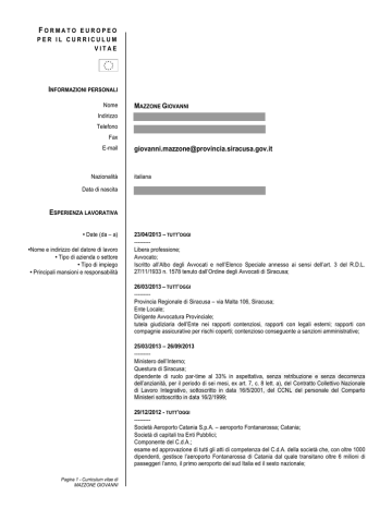 FORMATO EUROPEO PER IL CURRICULUM VITAE INFORMAZIONI PERSONALI Nome Indirizzo Telefono MAZZONE GIOVANNI CONTRADA BORGELLUSA – 96012 AVOLA (SR) 3316360491 - 3358381427 Fax E-mail Nazionalità Data di nascita [email protected] italiana 24 GENNAIO 1961 ESPERIENZA LAVORATIVA • Date (da – a) •Nome e indirizzo del datore di lavoro • Tipo di azienda o settore • Tipo di impiego • Principali mansioni e responsabilità 23/04/2013 – TUTT’OGGI --------Libera professione; Avvocato; Iscritto all’Albo degli Avvocati e nell’Elenco Speciale annesso ai sensi dell’art. 3 del R.D.L. 27/11/1933 n. 1578 tenuto dall’Ordine degli Avvocati di Siracusa; 26/03/2013 – TUTT’OGGI --------Provincia Regionale di Siracusa – via Malta 106, Siracusa; Ente Locale; Dirigente Avvocatura Provinciale; tutela giudiziaria dell’Ente nei rapporti contenziosi, rapporti con legali esterni; rapporti con compagnie assicurative per rischi coperti; contenzioso conseguente a sanzioni amministrative; 25/03/2013 – 26/09/2013 --------Ministero dell’Interno; Questura di Siracusa; dipendente di ruolo par-time al 33% in aspettativa, senza retribuzione e senza decorrenza dell’anzianità, per il periodo di sei mesi, ex art. 7, c. 8 lett. a), del Contratto Collettivo Nazionale di Lavoro Integrativo, sottoscritto in data 16/5/2001, del CCNL del personale del Comparto Ministeri sottoscritto in data 16/2/1999; 29/12/2012 - TUTT’OGGI --------Società Aeroporto Catania S.p.A. – aeroporto Fontanarossa; Catania; Società di capitali tra Enti Pubblici; Componente del C.d.A.; esame ed approvazione di tutti gli atti di competenza del C.d.A. della società che, con oltre 1000 dipendenti, gestisce l’aeroporto Fontanarossa di Catania dal quale transitano oltre 6 milioni di passeggeri l’anno, il primo aeroporto del sud Italia ed il sesto nazionale; Pagina 1 - Curriculum vitae di MAZZONE GIOVANNI 24/09/2012 - TUTT’OGGI --------Fondazione Siracusa è Giustizia – via Logoteta 27; Siracusa; Fondazione tra Enti Pubblici e Privati; Componente del C.d.A.; esame ed approvazione di tutti gli atti di competenza del C.d.A. della Fondazione che si propone di attuare ogni azione utile ad incrementare i livelli di efficienza nell’erogazione del servizio Giustizia da parte dei relativi competenti uffici; 09/03/2011 - TUTT’OGGI --------Fondo per l’inserimento lavorativo dei soggetti disabili presso l’Assessorato Regionale della Famiglia, delle Politiche Sociali e del Lavoro – Dipartimento Regionale Lavoro, dell’Impiego, dell’Orientamento, dei Servizi e delle Attività Formative – via Imperatore Federico, 70; Palermo; Ente Pubblico; Componente del Comitato Regionale di Gestione in rappresentanza dell’U.R.P.S.; gestione del Fondo Regionale per l’occupazione dei disabili di cui alla L. 68/1999; 04/12/2012 – 21/12/2012 --------GAL Eloro soc. consortile mista a r.l. – via Ruggero Settimo 9; Noto; Società consortile mista a r.l. tra Enti Pubblici e Privati; Componente del C.d.A.; esame ed approvazione di tutti gli atti di competenza del C.d.A. della società che gestisce i Piani Leader della zona sud della Provincia di Siracusa; 22/01/2011 – 25/03/2011 --------Libera professione; Avvocato; Iscritto all’Albo Speciale degli Avvocati Cassazionisti tenuto dal Consiglio Nazionale Forense cancellato a domanda; 12/10/2010 – 08/03/2011I --------Libera professione; Avvocato; Iscritto all’Albo degli Avvocati e nell’Elenco Speciale annesso ai sensi dell’art. 3 del R.D.L. 27/11/1933 N. 1578 tenuto dall’Ordine degli Avvocati di Siracusa; in data 15/02/2011 ha presentato istanza di cancellazione deliberata dal Consiglio dell’Ordine degli Avvocati di Siracusa in data 08/03/2011; 04/10/2010 – 17/04/2013 --------Consorzio A.T.O. Idrico Siracusa - via Malta 106, Siracusa; Consorzio Obbligatorio di Enti Locali; Incarico di Alta Collaborazione Amministrativa; supporto amministrativo dell’attività del Presidente, del C.d.A. e dell’Assemblea; responsabile del servizio legale; 19/07/2010 - 31/10/2011 --------Consorzio per le Autostrade Siciliane; Consorzio tra Enti Pubblici; Componente dell’Assemblea dei soci; esame ed approvazione di tutti gli atti di competenza dell’Assemblea del Consorzio che, con oltre 1000 dipendenti, gestisce tutte le autostrade siciliane; Pagina 2 - Curriculum vitae di MAZZONE GIOVANNI 12/04/2010 – 14/06/2012 --------Provincia Regionale di Siracusa – via Malta 106, Siracusa; Ente Locale; Dirigente ad interim Avvocatura Provinciale; difesa giudiziale dell’Ente in giudizio dal 12/10/2010 al 08/03/2011; istruttoria contenzioso dell’Ente; rapporti con legali esterni; rapporti con compagnie assicurative per rischi coperti; contenzioso conseguente a sanzioni amministrative; 26/02/2010 - 12/11/2010 --------Libera professione; Avvocato; Iscritto all’Albo Speciale degli Avvocati Cassazionisti tenuto dal Consiglio Nazionale Forense; cancellato a domanda retroattiva; 18/03/2009 - 28/01/2011 --------Provincia Regionale di Siracusa – via Malta 106, Siracusa; Ente Locale; Vice Segretario Generale; sostituzione del Segretario Generale, in caso di sua assenza o impedimento, nelle funzioni di assistenza nelle riunioni della Giunta e del Consiglio Provinciale, di certificazione e di rogito dei contratti; 04/02/2009 – 25/03/2013 --------Ministero dell’Interno; Questura di Siracusa; dipendente di ruolo par-time al 33% in aspettativa, senza retribuzione e con decorrenza dell’anzianità, ex art. 19, c. 6, del D. Lgs. n. 165/2001; 10/09/2008 – 12/04/2013 --------Fondazione Teatro Vittorio Emanuele di Noto – piazza XVI maggio 1, Noto; Fondazione tra Enti Pubblici; Componente del C.d.A e Vice Presidente; esame ed approvazione di tutti gli atti di competenza del C.d.A. della Fondazione che gestisce il Teatro Vittorio Emanuele di Noto; 04/08/2008 – 26/03/2013 --------Provincia Regionale di Siracusa – via Malta 106, Siracusa; Ente Locale; Dirigente – Capo dell’Ufficio di Gabin