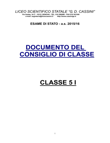 LICEO SCIENTIFICO STATALE “G. D. CASSINI” Via Galata, 34 C - 16121 GENOVA - TEL. 010 580686 - FAX 010 541549 e-mail: [email protected] http://www.cassinige.it ESAME DI STATO - a.s. 2015/16 DOCUMENTO DEL CONSIGLIO DI CLASSE CLASSE 5 I 1 INDICE I PREMESSA COMUNE (dal PTOF) - Finalità e compiti della scuola - Obiettivi formativi generali - Obiettivi trasversali Pag. Pag. Pag. Pag. 3 3 3 4 II DESCRIZIONE DELLA CLASSE - Profilo della classe - Andamento del numero di studenti nel triennio - Continuità didattica - Iniziative integrative e complementari - Interventi di recupero e sostegno - Simulazioni delle prove d'esame - Simulazione di terza prova Pag. Pag. Pag. Pag. Pag. Pag. Pag. Pag. 4 4 5 5 5 6 6 6 III OBIETTIVI DIDATTICI FORMATIVI DEL CONSIGLIO DI CLASSE Pag. 6 IV TEMPI E VERIFICHE DELL'ULTIMO ANNO FORMATIVO Pag. 7 V METODOLOGIA DIDATTICA COMUNE Pag. 7 VI CRITERI COMUNI DI VALUTAZIONE Pag. 7 VII CREDITO SCOLASTICO Pag. 8 VIII METODOLOGIA, MODALITA' DI VERIFICA E VALUTAZIONE DEGLI OBIETTIVI RAGGIUNTI PER MATERIA E NUCLEI Pag. 8 - Italiano: prof.ssa Maria Teresa Talice - Latino: prof.ssa Maria Teresa Talice - Inglese: prof.ssa Silvia Ricci - Storia: prof. Bruno Perata - Filosofia: prof. Bruno Perata - Matematica: prof.ssa Monica Medico - Fisica: prof.ssa Monica Medico - Scienze: prof.ssa Cristina Krawietz - Disegno e Storia dell'Arte: prof.ssa Marinella Di Fazio - Scienze Motorie: prof.ssa Rossana Brando - Religione: prof.ssa Adelina Palestini Pag. Pag. Pag. Pag. Pag. Pag. Pag. Pag. Pag. Pag. Pag. 8 9 10 11 12 13 14 15 16 16 18 ALLEGATI Pag. 19 DEL PERCORSO FONDAMENTALI DEI PERCORSI DIDATTICI IX 2 PREMESSA COMUNE (dal P.T.O.F.) Finalità e compiti della scuola Il Liceo Scientifico ha il compito istituzionale di formare giovani che mostrino spiccati interessi per le discipline scientifiche, ma che considerino basilare una formazione umanistica. Allo scopo di offrire una solida preparazione culturale il liceo assegna il primo posto all’insegnamento disciplinare che è l’unico vero elemento distintivo specifico su cui si fonda l’identità della scuola e i cui contenuti sono il risultato di una ricerca pedagogica condivisa. Educa, così, al pensiero critico, al rigore concettuale e logico, all'analisi dei problemi con adeguate metodologie di indagine. Il corpo docente si impegna a sostenere l’alunno nel suo sviluppo, nella sua maturazione, nella sua crescita culturale e anche nelle difficoltà, nell'esercizio delle sue capacità di scelta, nell'assunzione di responsabilità. I docenti sono consapevoli della centralità dell'alunno nella scuola, che è chiamata a porsi al servizio della sua educazione ed a rivolgere perciò particolare attenzione ad attuare le condizioni che favoriscono l'apprendimento (e quindi la conquista della cultura) e la relazione educativa. A concorrere all'azione didattico-formativa sono la valorizzazione e il potenziamento delle competenze nelle diverse aree disciplinari; lo sviluppo delle competenze in materia di cittadinanza attiva e democratica, ispirata al rispetto delle differenze ed al dialogo tra le culture; lo sviluppo delle competenze digitali, unite ad un utilizzo critico e consapevole delle tecniche della comunicazione; il potenziamento delle metodologie laboratoriali e delle attività di laboratorio; la prevenzione della dispersione scolastica, il contrasto di ogni forma di discriminazione e di bullismo anche con il supporto di esperti del settore, la didattica dell’inclusione; la valorizzazione della scuola intesa come comunità aperta al territorio e al rapporto con il mondo della cultura e del lavoro; la costruzione di percorsi formativi, tra cui l’alternanza scuola-lavoro, volti all’orientamento postdiploma; la valorizzazione del merito e dell’eccellenza. Obiettivi formativi generali La preparazione generale che la scuola propone attraverso gli insegnamenti curricolari è volta allo sviluppo e al consolidamento di conoscenze e competenze negli ambiti disciplinari ed è propedeutica a specializzazioni proprie di successivi ordini superiori di istruzione; oltre a ciò essa contribuisce alla formazione di cittadini responsabili e capaci di una visione critica della realtà, i cui comportamenti siano ispirati al rispetto della legalità. Nelle differenti aree disciplinari l'attività didattica sarà volta al conseguimento dei seguenti obiettivi: - area umanistica: potenziamento e valorizzazione della competenza logico — linguistica con riferimento sia all'italiano sia alle lingue straniere; potenziamento e valorizzazione della competenza di analisi ed interpretazione dei testi; consapevolezza della necessità di ricostruire un adeguato contesto storico per analizzare eventi, istituzioni, problemi, mentalità del passato e del presente e per istituire collegamenti; ricostruzione delle diverse problematiche filosofiche esposte in modo corretto a livello teorico, concettuale e terminologico. area scientifica: acquisizione di un uso corretto del lessico specifico; 3 analisi e schematizzazione di situazioni problematiche; descrizione di fenomeni attraverso modelli teorici esposizione sintetica e rigorosa di teorie scientifiche; applicazione di leggi e procedimenti adeguati nella risoluzione di esercizi e problemi; uso corretto degli strumenti e delle norme di rappresentazione grafico - bidimensionale e tridimensionale per il disegno geometrico e a mano libera. - area della psicomotricità e della salute: conoscenza e consapevolezza dei processi motori attraverso le pratiche sportive; acquisizione di uno stile di vita salutare. Obiettivi trasversali Si individuano i seguenti obiettivi trasversali alle aree disciplinari poiché riguardanti la formazione della persona oltre che dello studente: costruzione del sé e della relazione con gli altri; crescita dell'autonomia e del senso di responsabilità; potenziamento dell’attitudine alla formulazione e risoluzione di problemi; potenziamento della capacità di individuare collegamenti e relaz