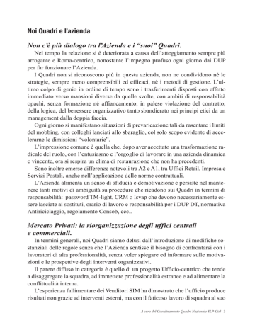 Noi Quadri e l’azienda Non c’è più dialogo tra l’Azienda e i “suoi” Quadri. Nel tempo la relazione si è deteriorata a causa dell’atteggiamento sempre più arrogante e Roma-centrico, nonostante l’impegno profuso ogni giorno dai DUP per far funzionare l’Azienda. I Quadri non si riconoscono più in questa azienda, non ne condividono né le strategie, sempre meno comprensibili ed efficaci, né i metodi di gestione. L’ultimo colpo di genio in ordine di tempo sono i trasferimenti disposti con effetto immediato verso mansioni diverse da quelle svolte, con ambiti di responsabilità opachi, senza formazione né affiancamento, in palese violazione del contratto, della logica, del benessere organizzativo tanto sbandierato nei principi etici da un management dalla doppia faccia. Ogni giorno si manifestano situazioni di prevaricazione tali da rasentare i limiti del mobbing, con colleghi lanciati allo sbaraglio, col solo scopo evidente di accelerarne le dimissioni “volontarie”. L’impressione comune è quella che, dopo aver accettato una trasformazione radicale del ruolo, con l’entusiasmo e l’orgoglio di lavorare in una azienda dinamica e vincente, ora si respira un clima di restaurazione che non ha precedenti. Sono inoltre emerse differenze notevoli tra A2 e A1, tra Uffici Retail, Impresa e Servizi Postali, anche nell’applicazione delle norme contrattuali. L’Azienda alimenta un senso di sfiducia e demotivazione e persiste nel mantenere tanti motivi di ambiguità su procedure che ricadono sui Quadri in termini di responsabilità: password TM-light, CRM o Isvap che devono necessariamente essere lasciate ai sostituti, orario di lavoro e responsabilità per i DUP DT, normativa Antiriciclaggio, regolamento Consob, ecc.. Mercato Privati: la riorganizzazione degli uffici centrali e commerciali. In termini generali, noi Quadri siamo delusi dall’introduzione di modifiche sostanziali delle regole senza che l’Azienda sentisse il bisogno di confrontarsi con i lavoratori di alta professionalità, senza voler spiegare ed informare sulle motivazioni e le prospettive degli interventi organizzativi. Il parere diffuso in categoria è quello di un progetto Ufficio-centrico che tende a disaggregare la squadra, ad immettere professionalità estranee e ad alimentare la conflittualità interna. L’esperienza fallimentare dei Venditori SIM ha dimostrato che l’ufficio produce risultati non grazie ad interventi esterni, ma con il faticoso lavoro di squadra al suo A cura del Coordinamento Quadri Nazionale SLP-Cisl 3 interno. Una squadra che va definita correttamente, formata, motivata ed alimentata con nuove giovani assunzioni. La riorganizzazione così come è stata impostata non ha niente a che vedere con il rinnovamento, perché dal 1997 ad oggi ogni atto di rinnovamento positivo ed efficiente è passato anche attraverso la condivisione con i lavoratori. Questa è la strada vera e non ci sono scorciatoie. La riorganizzazione aziendale sta contraendo l’attività produttiva e complicando l’attività gestionale di tutti quegli uffici centrali strategici che fino ad oggi hanno garantito la possibilità di ottenere degli apprezzabili volumi di ricavi. Un enorme passo indietro, rispetto all’organizzazione precedente. In pratica, si vanno a togliere risorse laddove viene richiesta la massima produzione e la più elevata attività commerciale, senza peraltro rivedere i budget assegnati. Non accetteremo mai di ridurre l’organico adibito a funzioni legate alla Conformità attraverso un complessivo “indirizzamento” del personale verso mansioni commerciali, senza l’adeguata formazione. È una soluzione che ricade sui Responsabili d’Ufficio, che vedranno contratta la “vocazione commerciale del ruolo” tanto sbandierata dalla stessa azienda. La manipolazione dell’azienda è evidente nella contraddizione tra l’intento dichiarato di far emergere la vocazione commerciale dei DUP e l’appesantimento reale delle procedure gestionali e amministrative a loro carico. Posteimpresa. A meno di due anni dalla nascita degli Uffici Impresa, a dicembre 2011 è stata nuovamente cambiata l’organizzazione. I venditori PAL ed Alto Spendenti passano alle dirette dipendenze dei Direttori di Filiale, mantenendo tuttavia l’attuale postazione di lavoro negli Uffici Impresa. Ai RUPI dovranno comunque riferirsi per questioni di carattere gestionale. Di fatto si aggiunge un livello in più di dipendenza e i “capi effettivi” passano così a sei (RUPI, COORD. VENDITORI, DF, Responsabile Venditori AT, Responsabile Commerciale Impresa AT, RAT, per restare al solo ambito regionale). Si è cancellata, in breve, la sinergia con l’UPI, costruita nel tempo e con fatica, fatta di obiettivi e budget comuni nonché di reciproco rispetto delle competenze e professionalità. Gli Uffici Impresa perdono, di fatto, la loro anima più spiccatamente commerciale. Non avendo più un budget e un pacchetto clienti condiviso con l’UPI, ma continuando di fatto a lavorare al suo interno, si creerà inevitabilmente un conflitto d’interesse relativo a quei clienti che finora erano in “condivisione”. 4 A cura del Coordinamento Quadri Nazionale SLP-Cisl Restano, inoltre, i soliti problemi di portafogli, mancanza di mezzi aziendali, aree di sovrapposizione, mancata formazione dei nuovi Specialisti, criticità di pre/ post vendita e quelli tutti interni, legati all’organizzazione della filiera di lavorazione. Ogni giorno il settore imprese perde commesse importanti di lavoro per la confusione che regna nei servizi postali: è quindi importante ridefinire gli ambiti di responsabilità e ricercare altrove le cause di obiettivi non raggiunti. Orario di lavoro. L’introduzione dei nuovi orari ha generato un forte malcontento fra i lavoratori ed ha dimostrato la scarsa sensibilità aziendale nei confronti delle persone e dei loro bisogni veri. I nuovi orari, inoltre, rappresentano un modello di apertura degli uffici