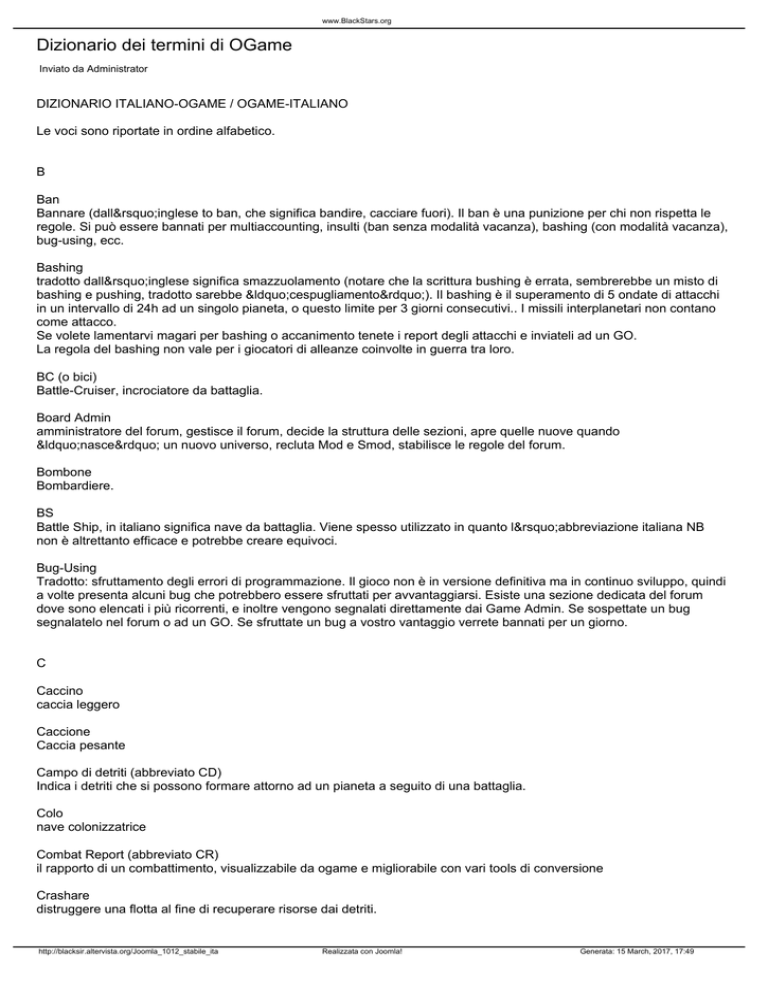www.BlackStars.org Dizionario dei termini di OGame Inviato da Administrator DIZIONARIO ITALIANO-OGAME / OGAME-ITALIANO Le voci sono riportate in ordine alfabetico. B Ban Bannare (dall’inglese to ban, che significa bandire, cacciare fuori). Il ban è una punizione per chi non rispetta le regole. Si può essere bannati per multiaccounting, insulti (ban senza modalità vacanza), bashing (con modalità vacanza), bug-using, ecc. Bashing tradotto dall’inglese significa smazzuolamento (notare che la scrittura bushing è errata, sembrerebbe un misto di bashing e pushing, tradotto sarebbe “cespugliamento”). Il bashing è il superamento di 5 ondate di attacchi in un intervallo di 24h ad un singolo pianeta, o questo limite per 3 giorni consecutivi.. I missili interplanetari non contano come attacco. Se volete lamentarvi magari per bashing o accanimento tenete i report degli attacchi e inviateli ad un GO. La regola del bashing non vale per i giocatori di alleanze coinvolte in guerra tra loro. BC (o bici) Battle-Cruiser, incrociatore da battaglia. Board Admin amministratore del forum, gestisce il forum, decide la struttura delle sezioni, apre quelle nuove quando “nasce” un nuovo universo, recluta Mod e Smod, stabilisce le regole del forum. Bombone Bombardiere. BS Battle Ship, in italiano significa nave da battaglia. Viene spesso utilizzato in quanto l’abbreviazione italiana NB non è altrettanto efficace e potrebbe creare equivoci. Bug-Using Tradotto: sfruttamento degli errori di programmazione. Il gioco non è in versione definitiva ma in continuo sviluppo, quindi a volte presenta alcuni bug che potrebbero essere sfruttati per avvantaggiarsi. Esiste una sezione dedicata del forum dove sono elencati i più ricorrenti, e inoltre vengono segnalati direttamente dai Game Admin. Se sospettate un bug segnalatelo nel forum o ad un GO. Se sfruttate un bug a vostro vantaggio verrete bannati per un giorno. C Caccino caccia leggero Caccione Caccia pesante Campo di detriti (abbreviato CD) Indica i detriti che si possono formare attorno ad un pianeta a seguito di una battaglia. Colo nave colonizzatrice Combat Report (abbreviato CR) il rapporto di un combattimento, visualizzabile da ogame e migliorabile con vari tools di conversione Crashare distruggere una flotta al fine di recuperare risorse dai detriti. http://blacksir.altervista.org/Joomla_1012_stabile_ita Realizzata con Joomla! Generata: 15 March, 2017, 17:49 www.BlackStars.org D Debris Field (abbreviato DF) Vedi CD Detriti Vedi CD DS (o MN, o RIP) Death Star, morte nera. F Falangiata Scansione di falange sensoriale. Esclusivo della luna. Fake target (o Fake) falsi bersagli. Cioè navi o difese di bassa qualità per evitare che il fuoco vada su quelle di alta qualità. Come navi fake si usano caccini, mentre come difese i laser leggeri o i lanciamissili. Farm Player che a seguito della sua scarsa abilità nel difendersi (causata da incapacità o da assenza prolungata dal gioco) diventa facile preda di altri giocatori, che ne rubano le risorse. Flame, Flammare flame significa fiammata. Indica le discussioni sul forum che degenerano in insulti o battibecchi che finiscono col non essere più in tema con l’argomento trattato. FleetCrash vedi crashare Fleet-Save (abbreviato FS) inviare la flotta con tempi di volo lunghi al fine di non farla rimanere a terra mentre non si è on-line, e in modo anche da non lasciare le risorse sul pianeta. Deve essere fatto in schieramento (o in riciclaggio se fatto dalla luna) G Game Admin amministratore del gioco, è il responsabile della sezione italiana di oGame, controlla l’operato di GO e SGO e ne nomina quando necessari. Game Operator (abbreviato GO) Sono gli arbitri, coloro che garantiscono che le regole vengano rispettate. Solitamente ce ne sono più di uno per ciascun universo. Potete trovare i loro indirizzi di posta elettronica in fondo alla sezione “Messaggi”. Ricordate che i GO sono dei volontari non retribuiti, siate cortesi, chiari e pazienti. H HoF, Hall Of Fame sala della celebrità. Sezione del forum in cui è possibile rendere pubbliche le proprie battaglie che hanno dato il 20% di possibilità di luna. In Game riferito ad azioni che si compiono all’interno di OGame. I IP è una fila di numeri (es 255.255.255.255) che identifica in modo univoco un computer su internet. esattamente come un numero di telefono. Iper tech tecnologia iperspaziale. http://blacksir.altervista.org/Joomla_1012_stabile_ita Realizzata con Joomla! Generata: 15 March, 2017, 17:49 www.BlackStars.org K k indica migliaia (di unità per risorse) kk indica milioni (di unità di risorse) L Light Fighter (abbreviato LF) Vedi caccino M Minatore giocatore che predilige svilupparsi attraverso il potenziamento della produttività delle miniere. Questa strategia di gioco è più lenta e difficile, ma più sicura in quanto il giocatore evita di crearsi scomodi nemici. Mod o Moderatori sono persone che gestiscono il forum, controllando che le discussioni si svolgano in modo civile e che ciascun partecipante al forum possa esprimersi liberamente, seguendo le regole vigenti nel forum stesso. Motore iper Motore iperspaziale. MN (o DS, o RIP) Death Star, morte nera. Multiaccounting in OGame potete avere un solo account per universo. Se utilizzate 2 account nello stesso universo questo viene definito multiaccounting, significa che state imbrogliando, quindi verrete bannati. Attenzione, i casi di giocatori in una stessa rete di computer con uguale IP può essere visto dai GO come multiacount, segnalate loro preventivamente queste situazioni. N Nani o Naniti Industrie nanotecnologiche (forse è più comodo abbreviare) NaP (Non-Aggression-Pact o Non-Attacking-Pact) Patto di Non Aggressione. Le alleanze che hanno stipulato un NaP non si attaccheranno tra di loro. Ninjata Schieramento in difesa di una flotta pochi secondi prima di un attacco avversario, al fine di distruggere la flotta attaccante. Niubbo italianizzazione dell'inglese newbie, 