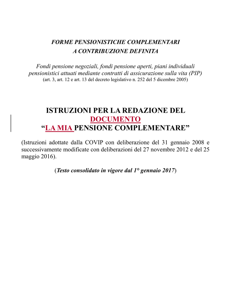 FORME PENSIONISTICHE COMPLEMENTARI A CONTRIBUZIONE DEFINITA Fondi pensione negoziali, fondi pensione aperti, piani individuali pensionistici attuati mediante contratti di assicurazione sulla vita (PIP) (art. 3, art. 12 e art. 13 del decreto legislativo n. 252 del 5 dicembre 2005) ISTRUZIONI PER LA REDAZIONE DEL DOCUMENTO “LA MIA PENSIONE COMPLEMENTARE” (Istruzioni adottate dalla COVIP con deliberazione del 31 gennaio 2008 e successivamente modificate con deliberazioni del 27 novembre 2012 e del 25 maggio 2016). (Testo consolidato in vigore dal 1° gennaio 2017) La mia pensione complementare1 (Schema di Nota informativa approvato dalla COVIP il 31 ottobre 2006, Sezione “Caratteristiche della forma pensionistica complementare”, par. H.4.) Premessa Il documento ‘La mia pensione complementare’ è volto a illustrare all’iscritto l’evoluzione prevista della posizione individuale nel corso del rapporto di partecipazione e l’importo della prestazione attesa al momento del pensionamento. Il documento illustra inoltre il valore della rendita corrispondente alla posizione individuale maturata. E’ tuttavia necessario tenere conto che si tratta di una mera proiezione fondata su ipotesi di calcolo che potrebbero non trovare conferma nel tempo. L’esemplificazione intende costituire uno strumento di ausilio all’aderente per la adozione o la modifica delle scelte relative al piano pensionistico (livello di contribuzione, profilo di investimento ecc..). In tal modo si intende accrescere la consapevolezza dell’iscritto circa le conseguenze che le scelte operate nel corso del rapporto possono determinare sulla prestazione finale attesa, contribuendo a favorire una maggiore attenzione dello stesso sia in sede di adesione sia nel corso del rapporto di partecipazione, attraverso un monitoraggio della evoluzione del piano previdenziale. A tal fine, è previsto che il documento venga predisposto fin dall’inizio del rapporto di partecipazione e sia oggetto di aggiornamento periodico. Ciò consente all’aderente di verificare nel tempo l’adeguatezza del piano in corso di costruzione rispetto agli obiettivi di copertura pensionistica che esso intende conseguire e di operare per tempo le modifiche che reputi opportune. L’esemplificazione è effettuata sulla base delle variabili di seguito indicate e di una metodologia di costruzione uniforme definita dalla COVIP e qui rappresentata. A) Modalità di diffusione e di aggiornamento del documento Nell’ambito delle operazioni relative all’adesione, contestualmente alle ‘Informazioni chiave per l’aderente’ (Sezione I della Nota informativa) viene consegnato agli aderenti il documento ‘La mia pensione complementare’, versione standardizzata, elaborato secondo le indicazioni di cui alla successiva sezione E).2 Il documento ‘La mia pensione complementare’ elaborato sulla base delle informazioni specifiche relative all’iscritto, nel rispetto delle indicazioni di cui alla sezione C), è trasmesso all’iscritto stesso unitamente alla prima comunicazione periodica annuale successiva all’adesione. Tale documento è quindi aggiornato con periodicità annuale e trasmesso con l’invio di ciascuna comunicazione periodica. La denominazione del documento è stata modificata dall’art. 1, comma 1, punto 2) della deliberazione COVIP del 25 maggio 2016. 2 Paragrafo modificato dall’art. 1, comma 1, punto 4, lett. b), c) e d) della deliberazione COVIP del 25 maggio 2016. 1 B) Variabili utilizzate per la costruzione del documento Per la costruzione del documento si considerano informazioni relative al singolo iscritto, informazioni proprie della forma pensionistica complementare e ipotesi definite dalla COVIP in modo uniforme per tutte le forme pensionistiche. Le variabili utilizzate sono le seguenti: Variabili 1. dati anagrafici dell’aderente (età e sesso) 2. misura della contribuzione 3. tasso atteso di crescita della contribuzione/retribuzione 4. tasso annuo atteso di inflazione 5. costi connessi alla partecipazione nella fase di accumulo 6. profilo di investimento 7. tasso atteso di rendimento della gestione 8. età prevista al pensionamento 9. basi tecniche per il calcolo della rendita 10. costo relativo alla trasformazione della posizione individuale in rendita Dati relativi all’iscritto Dati relativi alla forma pension. Ipotesi definite dalla COVIP X X X X X X X X X X X X Dati anagrafici: l’età e il sesso sono quelli relativi all’iscritto. Misura della contribuzione: la misura della contribuzione è quella risultante al fondo sulla base delle indicazioni dell’iscritto ovvero quella che risulti effettivamente versata con carattere di stabilità. La stessa è espressa su base annuale. Tasso atteso di crescita della contribuzione/retribuzione: la contribuzione è rivalutata annualmente. La rivalutazione avviene a un tasso reale dell’1%, qualora la contribuzione sia espressa in cifra fissa; qualora la stessa sia invece espressa in percentuale della retribuzione, si assume un tasso annuo atteso di crescita della retribuzione pari all’1% in termini reali. Tasso annuo atteso di inflazione: il tasso annuo atteso di inflazione è posto pari al 2%. Costi connessi alla partecipazione nella fase di accumulo: i costi relativi alla fase di accumulo sono quelli effettivamente applicati all’iscritto; gli stessi tengono pertanto conto delle eventuali agevolazioni commissionali praticate dalla forma pensionistica complementare. Con riferimento ai criteri di individuazione e di trattamento dei costi, si fa riferimento a quanto previsto nella Nota metodologica per il calcolo dell’indicatore sintetico dei costi da riportare nella Nota informativa, con esclusione del costo per il trasferimento della posizione individuale ad altra forma pensionistica complementare. Le variabili relative alla misura della contribuzione e alle ipotesi di rendimento atteso sono tuttavia individuate sulla base di quanto indicato nelle presenti Istruz
