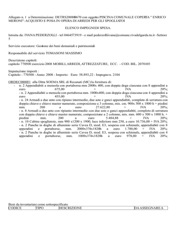 Allegato n. 1 a Determinazione: DETRS200800670 con oggetto:PISCINA COMUNALE COPERTA " ENRICO MERONI": ACQUISTO E POSA IN OPERA DI ARREDI PER GLI SPOGLIATOI ELENCO IMPEGNI DI SPESA. Istruita da: IVANA PEDERZOLLI - tel 0464573919 - e mail [email protected] - Settore 5 Servizio esecutore: Gestione dei beni demaniali e patrimoniali Responsabile del servizio: TOMASONI MASSIMO Descrizione capitoli: capitolo 770500 esercizio 2008 MOBILI, ARREDI, ATTREZZATURE, ECC. - COD. BIL. 2070105 Imputazione importi : Capitolo - 770500 - Anno: 2008 - Importo: Euro 58.893,22 - Impegno n. 2104 ORDEC080031 alla Ditta SOEMA SRL di Recanati (MC) la fornitura di: - n. 2 Appendiabiti a mensola con portaborsa mm 2000x 400, con doppia doga ciascuna con 8 appendini a euro 675,00 + IVA 20%; - n. 2 Appendiabiti a mensola con portaborsa mm. 1000x400, con doppia doga ciascuna con 4 appendini a euro 455,00 + IVA 20%; - n. 24 Armadi a due ante con ripiano intermedio, due aste e ganci appendiabiti, completo di serratura con doppia chiave e chiave master numerate, composizione a 3 colonne, mis. cm. 900x 500 x 1800 h + piedini mm. 200 a euro 27.622,80 + IVA 20%; - n. 8 Armadi a due ante con ripianto intermedio con due aste e ganci appendiabiti, completo di serratura con doppia chiave e chiave master numerate, composizione a 2 colonne, mis. mm. 600 x 500 x 1800 h. + piedini mm. 200 a euro 5.484,88 + IVA 20%; - n. 10 Cabine spogliatoio, mm 900 x1200 x 1900, luce inferiore mm 250, a euro 10.736,00 + IVA 20%; - n. 2 Panche in doghe di alluminio serie Cavea D, mod. E3, sospesa con schienale, appendiabiti con 8 appendini e portaborse, mm. 2000x374x1820h a euro 1.780,00 + IVA 20%; - n. 2 Panche in doghe in alluminio serie Cavea D, mod. E3, sospesa con schienale, appendiabiti con 4 appendini e portaborse, mm. 1000x374x1820h a euro 978,00 + IVA 20%; Beni da inventariare come sottospecificato CODICE TIPO DESCRIZIONE DA ASSEGNARE A PRENOTATO 723303024115 ACCESSORI 723303024114 ACCESSORI 723303024113 ACCESSORI 723303024112 ACCESSORI 723303024111 PANCA 723303024110 PANCA 723303024109 PANCA 723303024108 PANCA 723303023932 ARMADIO 723303023931 ARMADIO 723303023930 ARMADIO 723303023929 ARMADIO 723303023928 ARMADIO 723303023927 ARMADIO 723303023926 ARMADIO Appendiabiti a mensola con portaborsa mm. Piscine comunali 1000x400, con doppia doga ciascuna con 4 appendini Appendiabiti a mensola con portaborsa mm. Piscine comunali 1000x400, con doppia doga ciascuna con 4 appendini Appendiabiti a mensola con portaborsa mm 2000x Piscine comunali 400, con doppia doga ciascuna con 8 appendini Appendiabiti a mensola con portaborsa mm 2000x Piscine comunali 400, con doppia doga ciascuna con 8 appendini Panca in doghe di alluminio serie Cavea D, mod. E3, Piscine comunali sospesa con schienale, appendiabiti con 8 appendini e portaborse, mm. 2000x374x1820h Panca in doghe di alluminio serie Cavea D, mod. E3, Piscine comunali sospesa con schienale, appendiabiti con 8 appendini e portaborse, mm. 2000x374x1820h Panca in doghe in alluminio serie Cavea D, mod. E3, Piscine comunali sospesa con schienale, appendiabiti con 4 appendini e portaborse, mm. 1000x374x1820h Panca in doghe in alluminio serie Cavea D, mod. E3, Piscine comunali sospesa con schienale, appendiabiti con 4 appendini e portaborse, mm. 1000x374x1820h Armadio a due ante con ripianto intermedio con due Piscine comunali aste e ganci appendiabiti, completo di serratura con doppia chiave e chiave master numerate, composizione a 2 colonne, mis. mm. 600 x 500 x 1800 h. + piedini mm. 200 Armadio a due ante con ripianto intermedio con due Piscine comunali aste e ganci appendiabiti, completo di serratura con doppia chiave e chiave master numerate, composizione a 2 colonne, mis. mm. 600 x 500 x 1800 h. + piedini mm. 200 Armadio a due ante con ripianto intermedio con due Piscine comunali aste e ganci appendiabiti, completo di serratura con doppia chiave e chiave master numerate, composizione a 2 colonne, mis. mm. 600 x 500 x 1800 h. + piedini mm. 200 Armadio a due ante con ripianto intermedio con due Piscine comunali aste e ganci appendiabiti, completo di serratura con doppia chiave e chiave master numerate, composizione a 2 colonne, mis. mm. 600 x 500 x 1800 h. + piedini mm. 200 Armadio a due ante con ripiano intermedio, due aste ePiscine comunali ganci appendiabiti, completo di serratura con doppia chiave e chiave master numerate, composizione a 3 colonne, mis. cm. 900x 500 x 1800 h + piedini mm. 200 Armadio a due ante con ripiano intermedio, due aste ePiscine comunali ganci appendiabiti, completo di serratura con doppia chiave e chiave master numerate, composizione a 3 colonne, mis. cm. 900x 500 x 1800 h + piedini mm. 200 Armadio a due ante con ripiano intermedio, due aste ePiscine comunali ganci appendiabiti, completo di serratura con doppia chiave e chiave master numerate, composizione a 3 723303023925 ARMADIO 723303023924 ARMADIO 723303023923 ARMADIO 723303023922 ARMADIO 723303023921 ARMADIO 723303023920 ARMADIO 723303023919 ARMADIO 723303023918 ARMADIO 723303023917 ARMADIO 723303023916 ARMADIO 723303023915 ARMADIO colonne, mis. cm. 900x 500 x 1800 h + piedini mm. 200 Armadio a due ante con ripiano intermedio, due aste ePiscine comunali ganci appendiabiti, completo di serratura con doppia chiave e chiave master numerate, composizione a 3 colonne, mis. cm. 900x 500 x 1800 h + piedini mm. 200 Armadio a due ante con ripiano intermedio, due aste ePiscine comunali ganci appendiabiti, completo di serratura con doppia chiave e chiave master numerate, composizione a 3 colonne, mis. cm. 900x 500 x 1800 h + piedini mm. 200 Armadio a due ante con ripiano intermedio, due aste ePiscine comunali ganci appendiabiti, completo di serratura con doppia chiave e chiave master numerate, composizione a 3 colonne, mis. cm. 900x 500 x 1800 h + piedini mm. 200 Armadio a due ante con ripiano intermedio, due aste ePiscine comunali ganci appendiabiti, completo di serratura con doppia chiave e chiave master numerate, composizione a 3 c