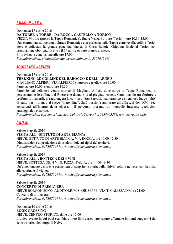 VEZZA D’ALBA: Domenica 17 aprile 2016 DA TORRE A TORRE - DA ROCCA CASTELLO A TORION VEZZA VILLA (presso la Tappa Romantica), fino a Vezza Borbore (Torion), ore 10,30-13.00 Una camminata sul percorso Strada Romantica con partenza dalla Tappa e arrivo alla collina Torion dove è collocata la grande panchina bianca di Chris Bangle. Grigliata finale al Torion con prenotazione obbligatoria entro il 14 aprile oppure pranzo al sacco. E’ prevista la conclusione alle ore 17.00. Per informazioni: [email protected], 3357059443 MAGLIANO ALFIERI Domenica 17 aprile 2016 TREKKING LE COLLINE DEL BAROCCO E DELL’ARNEIS MAGLIANO ALFIERI, VIA ALFIERI 6 (ingresso castello), ore 10.00. Partenza ore 10.00, rientro ore 16.30. Partendo dal delizioso centro storico di Magliano Alfieri, dove sorge la Tappa Romantica, si percorreranno le colline del Roero che danno vita al pregiato Arneis. Camminando tra fioriture e profumi primaverili, si raggiungerà la collina di San Servasio, panoramico e silenzioso luogo “alto” di culto per il pranzo al sacco-“merendina”. Sarà possibile ammirare gli affreschi del XVI sec. conservati all’interno della chiesa. Il percorso presenta un notevole interesse geologico, paesaggistico e storico. Per informazioni e prenotazioni: Ass. Culturale Terre Alte, 3334663388, www.terrealte.cn.it NEIVE: Sabato 9 aprile 2016 VISITA ALL’ ISTITUTO DI ARTE BIANCA NEIVE, ISTITUTO DI ARTE BIANCA, VIA ROCCA, ore 10.00-12.30 Dimostrazione di produzione di prodotti dolciari tipici del territorio. Per informazioni: 017367004 int. 4, [email protected] Sabato 9 aprile 2016 VISITA ALLA BOTTEGA DEI 4 VINI NEIVE, BOTTEGA DEI 4 VINI, P.ZZA ITALIA, ore 14.00-16.30 Un’emozionante visita che permetterà di scoprire la storia della vitivinicoltura neivese, con la visita alla cantina e al vigneto. Per informazioni: 017367004 int. 4, [email protected] Sabato 9 aprile 2016 CONCERTO DI PRIMAVERA NEIVE BORGONUOVO, AUDITORIUM S. GIUSEPPE, VIA T. CALISSANO, ore 21.00 Concerto di primavera. Per informazioni: 017367004 int. 4, [email protected] Domenica 10 aprile 2016 BOOK CROSSING NEIVE, CENTRO STORICO, dalle ore 15.00 L’unico evento in cui puoi scambiare i tuo libri e ascoltare letture effettuate in punti suggestivi del centro storico del borgo di Neive. Per informazioni: 017367004 int. 4, [email protected] TREISO: Sabato 9 aprile 2016 DEGUSTAZIONI DEL NUOVO DOLCETTO D’ALBA 2015 DI TREISO TREISO, PIAZZETTA BELVEDERE (in caso di maltempo Salone polifunzionale della Parrocchia), ore 17.00–22.00 Si degusteranno i nuovi Dolcetti d’Alba 2015 prodotti dalle cantine di Treiso, accompagnati da prelibatezze locali preparate dall’associazione turistica Pro Loco Treiso. Per informazioni: [email protected], 3397188217 Domenica 10 aprile 2016 DEGUSTAZIONI DEL NUOVO DOLCETTO D’ALBA 2015 DI TREISO TREISO, PIAZZETTA BELVEDERE (in caso di maltempo Salone polifunzionale della Parrocchia), ore 11.00 – 22.00 Si degusteranno i nuovi Dolcetti d’Alba 2015 prodotti dalle cantine di Treiso, accompagnati da prelibatezze locali preparate dall’associazione turistica Pro Loco Treiso. Per informazioni: [email protected], 3397188217 Domenica 10 aprile 2016 IL SENTIERO DEL BARBARESCO E DELLA STORIA TREISO, PIAZZA BARACCO 5, Partenza ore 10 – Rientro ore 16,30 Piacevole trekking primaverile sulle colline che danno vita al pregiato Barbaresco. Si attraversano siti geologici suggestivi e creste panoramiche. Il percorso presenta un notevole interesse geologico, paesaggistico e storico. Per informazioni e prenotazioni: Ass. Culturale Terre Alte - 3334663388 www.terrealte.cn.it Sabato 16 aprile 2016 DEGUSTAZIONI DEL NUOVO DOLCETTO D’ALBA 2015 DI TREISO TREISO, PIAZZETTA BELVEDERE (in caso di maltempo Salone polifunzionale della Parrocchia), ore 17.00–22.00 Si degusteranno i nuovi Dolcetti d’Alba 2015 prodotti dalle cantine di Treiso, accompagnati da prelibatezze locali preparate dall’associazione turistica Pro Loco Treiso. Per informazioni: [email protected], 3397188217 Domenica 17 aprile 2016 DEGUSTAZIONI DEL NUOVO DOLCETTO D’ALBA 2015 DI TREISO TREISO, PIAZZETTA BELVEDERE (in caso di maltempo Salone polifunzionale della Parrocchia), ore 11.00 – 22.00 Si degusteranno i nuovi Dolcetti d’Alba 2015 prodotti dalle cantine di Treiso, accompagnati da prelibatezze locali preparate dall’associazione turistica Pro Loco Treiso. Per informazioni: [email protected], 3397188217 TREZZO TINELLA: Domenica 17 aprile 2016 PASSEGGIANDO TRA LE ROMANTICHE DOLCEZZE DI TREZZO: MOSCATO E NOCCIOLA TREZZO TINELLA, PIAZZA DEL MUNICIPIO, ore 10.00 Ritrovo 10.00, Piazza del Municipio/Ritorno ore 16.30 Gli accompagnatori naturalistici locali guideranno tra i vigneti votati alla produzione dell’uva moscato e tra i noccioleti dove nasce la tonda gentile, rispondendo alle curiosità. Il percorso si svilupperà ad anello, toccando luoghi di rilevanza naturalistica. Sul percorso saranno previste soste presso alcuni produttori dove sarà possibile assaggiare le specialità locali. Per informazioni e prenotazioni: 3471324094 (Gianluca) BENEVELLO: Sabato 9, Domenica 10, Sabato 16, Domenica 17 aprile 2016 CHIESE APERTE BENEVELLO, CHIESA PARROCCHIALE SAN PIETRO IN VINCOLI IN PIAZZA CASTELLO E CHIESA MADONNA DI LANGA IN LOCALITÀ LANGA, ore 9-17 La Chiesa San Pietro in Vincoli era posta presso il vecchio cimitero, poi è stata demolita per essere spostata in cima alla collina. Adiacente al castello, presenta una semplice facciata in mattoni e pietre con rosone al centro. Pregevole è il campanile settecentesco. Posta a circa un chilometro dal paese, sulla provinciale 106 che sale verso Bossolasco (in direzione Lequio), sorge su una collinetta la chiesetta della Santissima Annunziata detta della Madonna di Langa. Demolita e ricostruita nel 1923, la leggenda vuole che vi abbia pregato San Francesco durante il suo viaggio verso la Liguria. Da qui si gode di uno degli scorci migliori sul Piemonte meridionale. Per informazioni: 0173529500 SINIO: D
