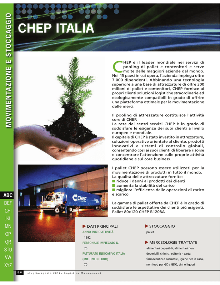 M OV I M E N TAZ I ON E E ST OC C A G GI O CHEP ITALIA C HEP è il leader mondiale nei servizi di pooling di pallet e contenitori e serve molte delle maggiori aziende del mondo. Nei 45 paesi in cui opera, l’azienda impiega oltre 7.000 dipendenti. Abbinando una tecnologia superiore a una base di attrezzature di oltre 300 milioni di pallet e contenitori, CHEP fornisce ai propri clienti soluzioni logistiche straordinarie ed ecologicamente compatibili in grado di offrire una piattaforma ottimale per la movimentazione delle merci. Il pooling di attrezzature costituisce l’attività core di CHEP. La rete dei centri servizi CHEP è in grado di soddisfare le esigenze dei suoi clienti a livello europeo e mondiale. Il capitale di CHEP è stato investito in attrezzature, soluzioni operative orientate al cliente, prodotti innovativi e sistemi di controllo globali, consentendo così ai suoi clienti di liberare risorse e concentrare l’attenzione sulle proprie attività quotidiane e sul core business. I pallet CHEP possono essere utilizzati per la movimentazione di prodotti in tutto il mondo. La qualità delle attrezzature fornite: riduce i danni ai prodotti dei clienti aumenta la stabilità del carico migliora l’efficienza delle operazioni di carico e scarico ABC DEF La gamma di pallet offerta da CHEP è in grado di soddisfare le aspettative dei clienti più esigenti. Pallet 80x120 CHEP B1208A GHI JKL MN DATI PRINCIPALI ANNO INIZIO ATTIVITÀ OP STOCCAGGIO pallet 1992 QR PERSONALE IMPIEGATO N. 70 STU VW XYZ alimentari deperibili, alimentari non FATTURATO INDICATIVO ITALIA deperibili, chimici, editoria - carta, (MILIONI DI EURO) farmaceutici e cosmetici, igiene per la casa, 70 86 MERCEOLOGIE TRATTATE >luglio/agosto 2012< Logistica Management non food per GD / GDO, vini e liquori w ww. c hep . c o m CHEP ITALIA SRL Pallet 100x120 CHEP B1210A Pallet 80x60 CHEP B0806A Pallet display 60x40 CHEP P0604A Il pooling di attrezzature consiste nell’utilizzo condiviso dei pallet e dei contenitori standard di alta qualità da parte di più clienti. Il pooling offre alle aziende un’opzione strategica in grado di ridurre i costi e migliorare l’efficienza della supply chain. CENTRO SERVIZI 1. CHEP invia ai produttori pallet e contenitori pronti all’uso. PRODUTTORE 2. I produttori caricano i propri prodotti sui pallet e contenitori CHEP e li spediscono ai loro clienti. Viale Fulvio Testi 280 20126 Milano Tel. 02 66154811 Fax 02 66154825 [email protected] www.chep.com CONTATTO Paola Monisso marketing Tel. 02 66154811 [email protected] GRUPPO Brambles sede Australia DISTRIBUTORE 3. Il distributore scarica le merci e rende disponibili i pallet e i contenitori per la raccolta da parte di CHEP, che li porta al più vicino centro servizi. CENTRO SERVIZI 4. CHEP ispeziona tutti i pallet e i contenitori raccolti e ne effettua la manutenzione per garantire che soddisfino i più elevati standard di qualità. Le attrezzature ispezionate e riparate sono di nuovo pronte all’uso. CHEP è impegnata nella sostenibilità ambientale: il nostro obiettivo è migliorare l’efficienza e la sostenibilità della supply chain attraverso servizi e prodotti mirati. SERVIZI OFFERTI consulenza, affitto / noleggio ASSISTENZA NELLE LOCALITÀ 14 centri servizi sparsi su tutto il territorio nazionale che raccolgono, ispezionano, riparano e ricondizionano i pallet per rimetterli a nuovo per i clienti Logistica Management >luglio/agosto 2012< 87