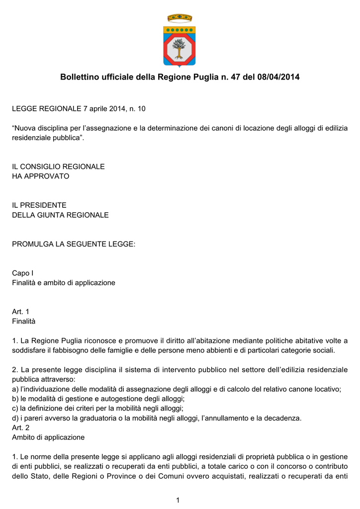 Bollettino ufficiale della Regione Puglia n. 47 del 08/04/2014 LEGGE REGIONALE 7 aprile 2014, n. 10 “Nuova disciplina per l’assegnazione e la determinazione dei canoni di locazione degli alloggi di edilizia residenziale pubblica”. IL CONSIGLIO REGIONALE HA APPROVATO IL PRESIDENTE DELLA GIUNTA REGIONALE PROMULGA LA SEGUENTE LEGGE: Capo I Finalità e ambito di applicazione Art. 1 Finalità 1. La Regione Puglia riconosce e promuove il diritto all’abitazione mediante politiche abitative volte a soddisfare il fabbisogno delle famiglie e delle persone meno abbienti e di particolari categorie sociali. 2. La presente legge disciplina il sistema di intervento pubblico nel settore dell’edilizia residenziale pubblica attraverso: a) l’individuazione delle modalità di assegnazione degli alloggi e di calcolo del relativo canone locativo; b) le modalità di gestione e autogestione degli alloggi; c) la definizione dei criteri per la mobilità negli alloggi; d) i pareri avverso la graduatoria o la mobilità negli alloggi, l’annullamento e la decadenza. Art. 2 Ambito di applicazione 1. Le norme della presente legge si applicano agli alloggi residenziali di proprietà pubblica o in gestione di enti pubblici, se realizzati o recuperati da enti pubblici, a totale carico o con il concorso o contributo dello Stato, delle Regioni o Province o dei Comuni ovvero acquistati, realizzati o recuperati da enti 1 pubblici non economici per le finalità sociali proprie dell’edilizia residenziale pubblica. Le norme della presente legge si applicano, altresì, agli alloggi residenziali di proprietà pubblica destinati all’uso provvisorio quali case parcheggio, ricoveri provvisori, non appena siano cessate le cause che ne hanno determinato l’uso provvisorio. 2. La presente legge non si applica agli alloggi: a) realizzati dalle cooperative edilizie per i propri soci; b) realizzati o recuperati con programmi di edilizia agevolata e convenzionata non attuati da enti pubblici; c) di servizio come definiti per legge; d) di proprietà degli enti pubblici previdenziali, purché non realizzati o recuperati a totale carico o con il concorso o contributo dello Stato o della Regione; e) ricevuti in eredità o donazione per la cui acquisizione siano previste clausole particolari. 3. Sono esclusi, a seguito di richiesta motivata dell’ente pubblico proprietario e previa autorizzazione della Giunta regionale, sentito il parere del Comune, gli alloggi che, per le modalità di acquisizione, per la destinazione funzionale, per le caratteristiche della tipologia costruttiva o della utenza insediata o per particolari caratteri di pregio storico-artistico, non siano utilizzati o utilizzabili per fini propri dell’edilizia residenziale pubblica. Per tali alloggi l’autorizzazione regionale stabilisce le modalità di destinazione nonché la misura del canone, che non può essere inferiore a quella determinata ai sensi della presente legge. Capo II Assegnazione alloggi Art. 3 Requisiti per l’assegnazione 1. Può conseguire l’assegnazione di un alloggio di edilizia residenziale pubblica: a) chi ha la cittadinanza italiana. Il cittadino straniero è ammesso in conformità a quanto previsto dall’articolo 40 del testo unico delle disposizioni concernenti la disciplina dell’immigrazione e norme sulla condizione dello straniero, emanato con decreto legislativo 25 luglio 1998, n. 286, come modificato dall’articolo 27, comma 1, della legge 30 luglio 2002, n. 189 (Modifica alla normativa in materia di immigrazione e di asilo); b) chi ha la residenza anagrafica o attività lavorativa esclusiva o principale nel comune o in uno dei comuni compresi nell’ambito territoriale cui si riferisce il bando di concorso, salvo che si tratti di lavoratori destinati a prestare servizio in nuovi insediamenti produttivi compresi in tale ambito o di lavoratori emigrati all’estero, per i quali è ammessa la partecipazione per un solo ambito territoriale; c) chi non è titolare di diritti di proprietà, usufrutto, uso e abitazione su alloggio adeguato alle esigenze del nucleo familiare ubicato in qualsiasi località; ai fini della valutazione dell’adeguatezza dell’alloggio si applicano gli standard di cui all’articolo 10, comma 2; d) chi non ha già ottenuto l’assegnazione immediata o futura di alloggio realizzato con contributi pubblici, o l’attribuzione di precedenti finanziamenti agevolati in qualunque forma concessi dallo Stato o da enti pubblici, sempreché l’alloggio non sia inutilizzabile o perito senza dar luogo al risarcimento del danno; e) chi fruisce di un reddito annuo complessivo, riferito al nucleo familiare, non superiore al limite, determinato ai sensi dell’articolo 21 della legge 5 agosto 1978, n. 457 (Norme per l’edilizia residenziale), vigente al momento della scadenza del bando di concorso. Il reddito di riferimento è quello imponibile relativo all’ultima dichiarazione fiscale, al lordo delle imposte e al netto dei contributi previdenziali e degli assegni per il nucleo famigliare. Oltre all’imponibile fiscale vanno computati tutti gli emolumenti, esclusi 2 quelli non continuativi, quali pensioni e sussidi a qualsiasi titolo percepiti nonché tutte le indennità, comprese quelle esentasse, fatta eccezione per l’indennità di accompagnamento; f) chi non ha ceduto in tutto o in parte, fuori dei casi previsti dalla legge, l’alloggio eventualmente assegnato in precedenza in locazione semplice. 2. La Giunta regionale determina i limiti di reddito per l’accesso all’edilizia residenziale pubblica di cui alla presente legge secondo l’andamento dei prezzi al consumo per le famiglie di operai e di impiegati, quale risulta dalle determinazioni ISTAT. 3. Per nucleo familiare si intende la famiglia costituita da coniugi, figli, affiliati e affidati con provvedimento del giudice con loro conviventi da almeno due anni. Rientrano nel nucleo familiare anche i soggetti di seguito elencati: a) conviventi mo