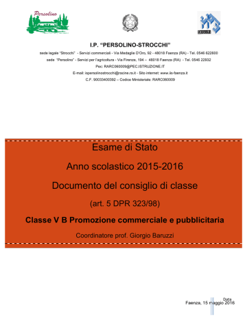 I.P. “PERSOLINO-STROCCHI” sede legale “Strocchi” - Servizi commerciali - Via Medaglie D’Oro, 92 - 48018 Faenza (RA) - Tel. 0546 622600 sede “Persolino” - Servizi per l’agricoltura - Via Firenze, 194 – 48018 Faenza (RA) - Tel. 0546 22932 Pec: [email protected] E-mail: [email protected] - Sito internet: www.iis-faenza.it C.F. 90033400392 – Codice Ministeriale: RARC060009 Esame di Stato Anno scolastico 2015-2016 Documento del consiglio di classe (art. 5 DPR 323/98) Classe V B Promozione commerciale e pubblicitaria Coordinatore prof. Giorgio Baruzzi Data Faenza, 15 maggio 2016 Documento del 15 maggio classe Quinta B Promozione commerciale e pubblicitaria 1 Indice Profilo e storia della classe.........................................2 Classe Quinta Promozione commerciale e pubblicitaria2 Docenti della classe.....................................................3 Caratteristiche e storia della classe..........................4 Progetti, visite guidate e viaggi d’istruzione.............5 Collegamenti disciplinari:............................................5 Credito scolastico.........................................................6 Simulazioni prove d'esame.........................................7 Programmazione didattica..........................................8 Profilo: S. c. - Promozione Commerciale e Pubblicitaria8 Competenze trasversali..............................................9 Programmazione per moduli didattici......................11 Alternanza scuola lavoro..........................................12 Relazioni e Programmi disciplinari svolti................14 Relazione finale di Lingua e letteratura italiana.....15 Programma svolto di Lingua e letteratura italiana.17 Relazione finale di Storia..........................................19 Programma svolto di Storia......................................20 Relazione finale di Inglese........................................22 Programma svolto di Inglese....................................23 Relazione finale di Matematica................................25 Programma svolto di Matematica............................26 Relazione finale di Scienze motorie e sportive......27 Programma svolto di Scienze Motorie e Sportive.28 Relazione finale di Tecniche Professionali............29 Programma svolto di Tecniche Professionali.........30 Relazione finale di Storia dell’arte...........................32 Programma svolto di Storia dell’arte.......................34 Relazione finale di Tecniche di comunicazione.....36 Programma svolto di Tecniche di comunicazione.38 Relazione finale di Economia aziendale.................40 Programma svolto di Economia aziendale.............42 Relazione finale di Francese....................................43 Programma svolto di Francese................................45 Valutazione delle prove dell'Esame di Stato..........48 Tabella dei criteri generali di valutazione...............49 Griglia di valutazione Prima prova - Tipologia A...50 Griglia di valutazione Prima prova - Tipologia B...51 Griglia di valutazione Prima prova - Tipologia C e D52 Griglia di valutazione della seconda prova............53 Griglia di valutazione della Terza prova.................54 Proposta di Griglia di valutazione della prova orale.55 Documenti allegati a disposizione della commissione. 56 Data Faenza, 15 maggio 2016 Documento del 15 maggio classe Quinta B Promozione commerciale e pubblicitaria 2 Profilo e storia della classe Classe Quinta Promozione commerciale e pubblicitaria Alunni 1. CALDERONI ALESSANDRO 2. CARAPIA GIACOMO 3. EMILIANI ERICA 4. FAZIANI ANDREA 5. FOLEGATTI MARIKA 6. GUALANDI ERICA 7. LIVERANI MARCO 8. MELELLA SABRINA 9. NATI ANDREA 10. PIAZZA SIMONE 11. SCACCHI MARTINA Data Faenza, 15 maggio 2016 Documento del 15 maggio classe Quinta B Promozione commerciale e pubblicitaria 3 Docenti della classe Docenti Materie Ore curricolari Area comune Baruzzi Giorgio Lingua e letteratura italiana 4 Baruzzi Giorgio Storia 2 Castagnoli Lorella Lingua Inglese 3 Rossi Elena Matematica 3 Bandini Emanuele Educazione fisica 2 Borghi Gilberto Religione 1 Area d’indirizzo D’Antonio Antonio Tecniche professionali 8 Neri Francesco Arti fotografiche 2* Casadei Caterina Storia delle arti visive 2 Golinelli Lucia Tecniche di comunicazione 2 Di Dio Gian Luca Economia aziendale 2 Catani Samantha Seconda lingua - Francese 2 * Compresenza con Tecniche professionali Coordinatore: Prof. Giorgio Baruzzi Data Faenza, 15 maggio 2016 Documento del 15 maggio classe Quinta B Promozione commerciale e pubblicitaria 4 Caratteristiche e storia della classe Composizione La classe si compone di 11 alunni, di cui 6 ragazzi e 5 ragazze. Due alunni della classe, che hanno frequentato durante il primo quadrimestre, si sono ritirati per motivi personali e si presenteranno a sostenere le prove di ammissione all’esame come candidati esterni. Comportamento Sul piano disciplinare la classe presenta un comportamento nel complesso corretto, pur non sempre maturo e consapevole da parte di alcuni alunni. Frequenza Numerose le assenze e i ritardi nel corso dell’anno, da parte di alcuni alunni, non sempre con motivazioni adeguatamente giustificate. In qualche caso alcuni di essi hanno effettivamente avuto problemi di salute, debitamente documentati. Continuità didattica Tra la classe Quarta e la classe Quinta sono cambiati gli insegnanti di Tecniche professionali (grafica), Matematica, Educazione fisica e Francese, mentre ulteriori discontinuità vi sono state tra la classe Terza e la classe Quarta. Impegno/partecipazione La classe ha mostrato nel complesso interesse, partecipazione e impegno più che sufficienti nella maggior parte delle discipline. Solo alcuni alunni si sono però applicati con assiduità nello studio, che invece è stato discontinuo da parte di molti. Più attivi sono stati l’impegno e la partecipazione all’attività didattica nell’area d’indirizzo, anche se alcuni studenti. Obiettivi conseguiti Alla data attual