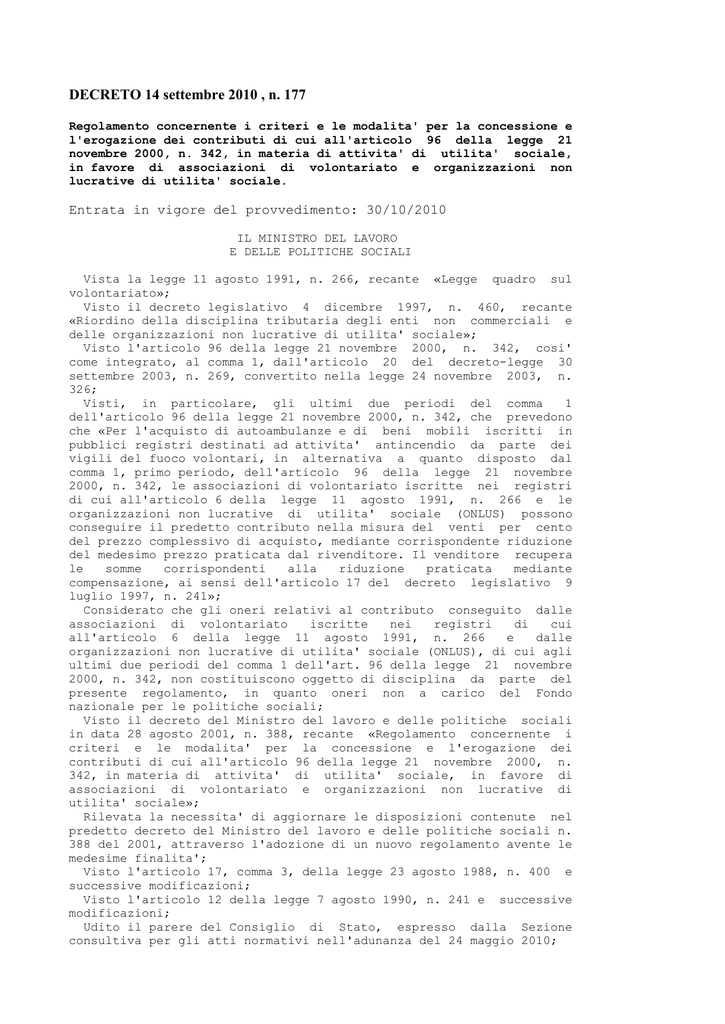DECRETO 14 settembre 2010 , n. 177 Regolamento concernente i criteri e le modalita' per la concessione e l'erogazione dei contributi di cui all'articolo 96 della legge 21 novembre 2000, n. 342, in materia di attivita' di utilita' sociale, in favore di associazioni di volontariato e organizzazioni non lucrative di utilita' sociale. Entrata in vigore del provvedimento: 30/10/2010 IL MINISTRO DEL LAVORO E DELLE POLITICHE SOCIALI Vista la legge 11 agosto 1991, n. 266, recante «Legge quadro sul volontariato»; Visto il decreto legislativo 4 dicembre 1997, n. 460, recante «Riordino della disciplina tributaria degli enti non commerciali e delle organizzazioni non lucrative di utilita' sociale»; Visto l'articolo 96 della legge 21 novembre 2000, n. 342, cosi' come integrato, al comma 1, dall'articolo 20 del decreto-legge 30 settembre 2003, n. 269, convertito nella legge 24 novembre 2003, n. 326; Visti, in particolare, gli ultimi due periodi del comma 1 dell'articolo 96 della legge 21 novembre 2000, n. 342, che prevedono che «Per l'acquisto di autoambulanze e di beni mobili iscritti in pubblici registri destinati ad attivita' antincendio da parte dei vigili del fuoco volontari, in alternativa a quanto disposto dal comma 1, primo periodo, dell'articolo 96 della legge 21 novembre 2000, n. 342, le associazioni di volontariato iscritte nei registri di cui all'articolo 6 della legge 11 agosto 1991, n. 266 e le organizzazioni non lucrative di utilita' sociale (ONLUS) possono conseguire il predetto contributo nella misura del venti per cento del prezzo complessivo di acquisto, mediante corrispondente riduzione del medesimo prezzo praticata dal rivenditore. Il venditore recupera le somme corrispondenti alla riduzione praticata mediante compensazione, ai sensi dell'articolo 17 del decreto legislativo 9 luglio 1997, n. 241»; Considerato che gli oneri relativi al contributo conseguito dalle associazioni di volontariato iscritte nei registri di cui all'articolo 6 della legge 11 agosto 1991, n. 266 e dalle organizzazioni non lucrative di utilita' sociale (ONLUS), di cui agli ultimi due periodi del comma 1 dell'art. 96 della legge 21 novembre 2000, n. 342, non costituiscono oggetto di disciplina da parte del presente regolamento, in quanto oneri non a carico del Fondo nazionale per le politiche sociali; Visto il decreto del Ministro del lavoro e delle politiche sociali in data 28 agosto 2001, n. 388, recante «Regolamento concernente i criteri e le modalita' per la concessione e l'erogazione dei contributi di cui all'articolo 96 della legge 21 novembre 2000, n. 342, in materia di attivita' di utilita' sociale, in favore di associazioni di volontariato e organizzazioni non lucrative di utilita' sociale»; Rilevata la necessita' di aggiornare le disposizioni contenute nel predetto decreto del Ministro del lavoro e delle politiche sociali n. 388 del 2001, attraverso l'adozione di un nuovo regolamento avente le medesime finalita'; Visto l'articolo 17, comma 3, della legge 23 agosto 1988, n. 400 e successive modificazioni; Visto l'articolo 12 della legge 7 agosto 1990, n. 241 e successive modificazioni; Udito il parere del Consiglio di Stato, espresso dalla Sezione consultiva per gli atti normativi nell'adunanza del 24 maggio 2010; Sentiti i Ministri dell'economia e delle finanze e della salute; Vista la comunicazione al Presidente del Consiglio dei Ministri, effettuata ai sensi del comma 3 dell'articolo 17 della predetta legge n. 400 del 1988, con la nota prot. n. 04/UL/0004285/L in data 3 agosto 2010; A d o t t a il seguente regolamento: Art. 1 Oggetto 1. Il presente regolamento disciplina i criteri e le modalita' di concessione ed erogazione dei contributi previsti dall'articolo 96, comma 1, primo periodo, della legge 21 novembre 2000, n. 342 e successive modificazioni ed integrazioni, in favore di organizzazioni di volontariato e delle altre organizzazioni non lucrative di utilita' sociale (ONLUS), per l'acquisto di autoambulanze e di beni strumentali utilizzati direttamente ed esclusivamente per attivita' di utilita' sociale e di beni da donare a strutture sanitarie pubbliche. 2. Il contributo di cui al comma 1 puo' costituire una percentuale del prezzo di acquisto del bene, determinata sulla base delle domande pervenute e ritenute ammissibili. 3. I contributi di cui al comma 1 non sono cumulabili con altri contributi, concernenti il medesimo bene, erogati dalle amministrazioni pubbliche di cui all'articolo 1, comma 2, del decreto legislativo 30 marzo 2001, n. 165, ne' con le agevolazioni previste in alternativa dall'articolo 96 della legge 21 novembre 2000, n. 342. 4. Ai sensi dell'articolo 96, comma 1, della citata legge n. 342 del 2000, la quota del Fondo nazionale per le politiche sociali di pertinenza delle province autonome di Trento e di Bolzano, viene attribuita direttamente alle predette province che provvedono all'erogazione dei contributi direttamente in favore dei beneficiari secondo i criteri stabiliti dal Ministero del lavoro e delle politiche sociali. Art. 2 Soggetti beneficiari 1. Possono presentare la domanda per la concessione del contributo i seguenti soggetti: a) le organizzazioni di volontariato, costituite in forma di associazione o nelle forme previste dall'articolo 3 della legge 11 agosto 1991, n. 266, iscritte nei registri di cui all'articolo 6 della medesima legge; b) le organizzazioni non lucrative di utilita' sociale (ONLUS) in possesso dei requisiti di cui all'articolo 10 del decreto legislativo 4 dicembre 1997, n. 460, iscritte all'anagrafe unica delle ONLUS di cui all'articolo 11 del medesimo decreto legislativo. Art. 3 Acquisti ammissibili al contributo 1. Il contributo e' concesso ai soggetti di cui all'articolo 2, per l'acquisto o per l'acquisizione mediante contratto di leasing, da parte dei medesimi di: a) autoambulanze; b) beni strumentali utilizzati direttamente ed esclusivamente per attivita' di utilita' sociale che, per le loro caratteristiche, non sono suscettibili 
