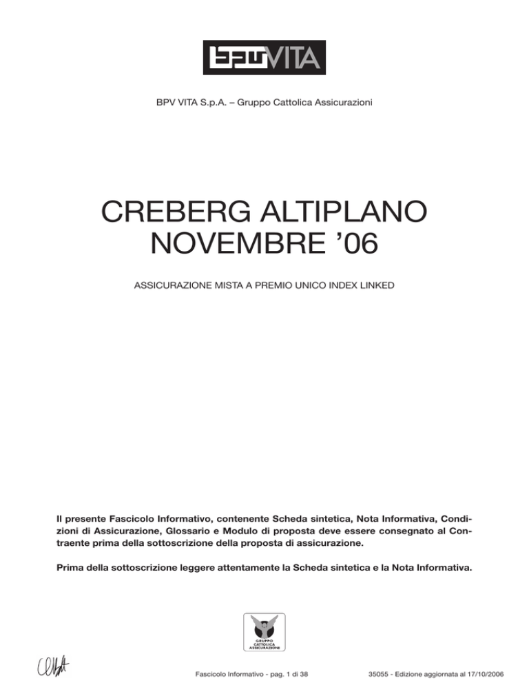 BPV VITA S.p.A. – Gruppo Cattolica Assicurazioni CREBERG ALTIPLANO NOVEMBRE ’06 ASSICURAZIONE MISTA A PREMIO UNICO INDEX LINKED Il presente Fascicolo Informativo, contenente Scheda sintetica, Nota Informativa, Condizioni di Assicurazione, Glossario e Modulo di proposta deve essere consegnato al Contraente prima della sottoscrizione della proposta di assicurazione. Prima della sottoscrizione leggere attentamente la Scheda sintetica e la Nota Informativa. Fascicolo Informativo - pag. 1 di 38 35055 - Edizione aggiornata al 17/10/2006 SCHEDA SINTETICA ATTENZIONE: LEGGERE ATTENTAMENTE LA NOTA INFORMATIVA PRIMA DELLA SOTTOSCRIZIONE DEL CONTRATTO La presente Scheda sintetica non sostituisce la Nota Informativa. Essa mira a dare al Contraente un’informazione di sintesi sulle caratteristiche, sulle garanzie, sui costi e sugli eventuali rischi presenti nel contratto. 1. Informazioni generali 1.a) Compagnia BPV VITA S.p.A. – Gruppo Cattolica Assicurazioni. 1.b) Denominazione del contratto “Creberg Altiplano Novembre ‘06”. 1.c) Tipologia del contratto Le prestazioni previste dal contratto sono direttamente collegate all’andamento del Parametro di riferimento. Pertanto il contratto comporta rischi finanziari per il Contraente riconducibili all’andamento del Parametro di riferimento a cui sono collegate le prestazioni assicurative. Le prestazioni assicurative sono collegate ad un Parametro di riferimento costituito dai seguenti titoli azionari: Titolo azionario Abn Amro Holding Nv Deutsche Bank Ag Deutsche Telekom Ag Enel Spa France Telecom General Electric Co Kyocera Corp Pfizer Inc Procter & Gamble Co Societe Generale Tdk Corp Toyota Motor Corp Codice Bloomberg AABA NA DBK GY DTE GY ENEL IM FTE FP GE US 6971 JT PFE US PG US GLE FP 6762 JT 7203 JT Settore di appartenenza Finanziario Finanziario Telecomunicazioni Energetico Telecomunicazioni Energetico Elettronico Farmaceutico Prodotti di consumo Finanziario Elettronico Automobilistico Borsa di quotazione Amsterdam Xetra Xetra Milano Parigi New York Tokio New York New York Parigi Tokio Tokio 1.d) Durata La durata del presente contratto è determinata in 6 anni. È possibile esercitare il diritto di riscatto trascorsi 12 mesi dalla data di decorrenza degli effetti del contratto. 1.e) Pagamento dei premi A fronte delle prestazioni previste dal contratto, il Contraente versa un premio unico fissato nel suo ammontare, all’atto della sottoscrizione della proposta di assicurazione. L’ammontare minimo del premio unico è di 3.000,00 Euro. Qualora il Contraente intenda effettuare un versamento di importo superiore, l’importo del premio dovrà essere multiplo di 500,00 Euro. 2. Caratteristiche del contratto Il presente contratto è una polizza assicurativa sulla vita della tipologia “Index Linked” a premio unico di durata prestabilita. Fascicolo Informativo - pag. 2 di 38 35055 - Edizione aggiornata al 17/10/2006 Le prestazioni in caso di vita durante il contratto e a scadenza e la prestazione in caso di morte sono direttamente collegate al valore di un Parametro di riferimento costituito dai titoli azionari di cui al precedente punto 1.c) della presente Scheda sintetica. Per far fronte alle prestazioni assicurative la Compagnia investirà il premio, al netto dei costi di acquisizione, di gestione e di emissione del contratto, in un titolo obbligazionario emesso da Banca Italease S.p.A. e in uno strumento finanziario derivato emesso da Banca Aletti & C. S.p.A., come analiticamente descritto in Nota Informativa al punto 8 della Sezione C. La Compagnia, per la copertura del rischio morte dell’Assicurato previsto dal presente contratto, trattiene lo 0,76% dai costi di acquisizione, emissione ed amministrazione. Pertanto non viene applicata alcuna ulteriore trattenuta, rispetto ai costi di cui sopra, sull’importo del premio al momento del versamento, per la copertura del rischio morte dell’Assicurato; di conseguenza, solo i costi indicati nella tabella di cui al punto 10.1.1 della Nota Informativa, riducono l’ammontare delle prestazioni che la Compagnia adempirà in favore del Contraente e/o dei Beneficiari. 3. Prestazioni assicurative Il contratto prevede le seguenti tipologie di prestazioni: Prestazioni in caso di vita Pagamento di somme periodiche Capitale Capitale In caso di vita dell’Assicurato alle ricorrenze annuali del contratto, il pagamento ai Beneficiari designati in polizza dal Contraente di una somma periodica di importo predeterminato alla prima e seconda ricorrenza annuale del contratto e di una eventuale somma periodica di importo variabile alle ricorrenze annuali successive. In caso di vita dell’Assicurato alla scadenza del contratto, il pagamento del capitale previsto ai Beneficiari designati in polizza dal Contraente. Prestazione in caso di decesso In caso di decesso dell’Assicurato nel corso della durata contrattuale, il pagamento ai Beneficiari designati in polizza dal Contraente del capitale assicurato. Maggiori informazioni sono fornite in Nota Informativa alla Sezione B. In ogni caso le prestazioni contrattuali sono regolate dagli Artt. 11 e 12 delle Condizioni di Assicurazione. 4. Rischi finanziari a carico del Contraente La Compagnia non offre alcuna garanzia di capitale e di rendimento minimo. Pertanto il pagamento delle prestazioni dipende dalle oscillazioni del Parametro di riferimento e/o dalla solvibilità degli Enti Emittenti gli strumenti finanziari sottostanti il contratto assicurativo. Il rating attribuito all’Emittente del titolo obbligazionario a cui è collegata la prestazione, al 3 ottobre 2006, è A3 (Moody’s) e A- (Fitch). Il rating attribuito all’Emittente dello strumento finanziario derivato a cui è collegata la prestazione, al 3 ottobre 2006, è A (Standard & Poor’s). Nel corso della durata contrattuale i predetti rating sono pubblicati sul quotidiano “Italia Oggi” e sul sito internet della Compagnia www.bpvvita.it. A carico del contraente gravano i seguenti rischi f