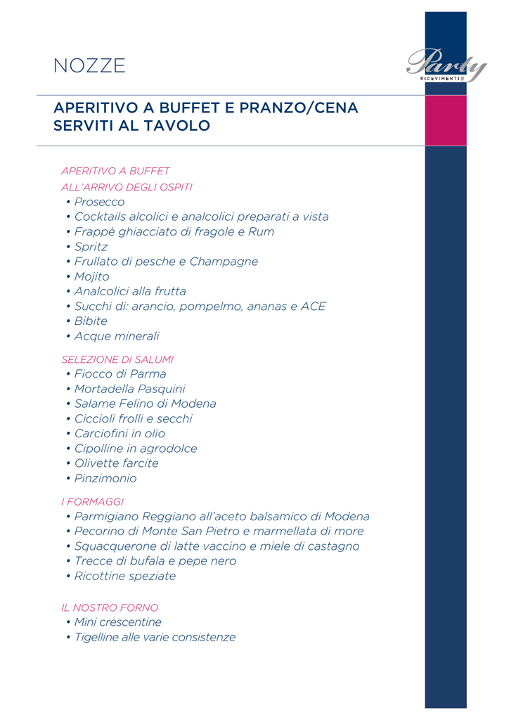 NOZZE APERITIVO A BUFFET E PRANZO/CENA SERVITI AL TAVOLO APERITIVO A BUFFET ALL’ARRIVO DEGLI OSPITI • • • • • • • • • • Prosecco Cocktails alcolici e analcolici preparati a vista Frappè ghiacciato di fragole e Rum Spritz Frullato di pesche e Champagne Mojito Analcolici alla frutta Succhi di: arancio, pompelmo, ananas e ACE Bibite Acque minerali SELEZIONE DI SALUMI • • • • • • • • Fiocco di Parma Mortadella Pasquini Salame Felino di Modena Ciccioli frolli e secchi Carciofini in olio Cipolline in agrodolce Olivette farcite Pinzimonio I FORMAGGI • • • • • Parmigiano Reggiano all’aceto balsamico di Modena Pecorino di Monte San Pietro e marmellata di more Squacquerone di latte vaccino e miele di castagno Trecce di bufala e pepe nero Ricottine speziate IL NOSTRO FORNO • Mini crescentine • Tigelline alle varie consistenze • • • • Piade al farro Crescente classica bolognese Focacce morbide al profumo di sale e rosmarino Streghette I FRITTINI IN CONO DI BAMBÙ • • • • • Assaggi di verdure croccanti Crocchette dorate Crema fritta Frutta fritta Formaggi fondenti (fontina, scamorza e mozzarelline) SERVITO AL TAVOLO I PRIMI PIATTI • Passatelli al Pecorino di Fossa in vellutata di asparagi e pomodorini confit • Tortelloni d’ortica, Parma croccante e mousse di nocciola IL SECONDO • Lombatina di maialino farcita, pinoli e basilico in salsa di marasche IL CONTORNO • Millefoglie di melanzane viola e timo al limone FANTASIA DI DOLCI A BUFFET E IN BICCHIERINI • • • • • • • Torta di riso Zuppa Inglese Bavarese alla fragola Piccola pasticceria Pralineria al cioccolato Zuccherini montanari Tagliata di frutta LA CANTINA • • • • Vini bianchi e rossi D.O.C Spumante Caffè espresso Amari e digestivi A seguire American bar su Vostra richiesta