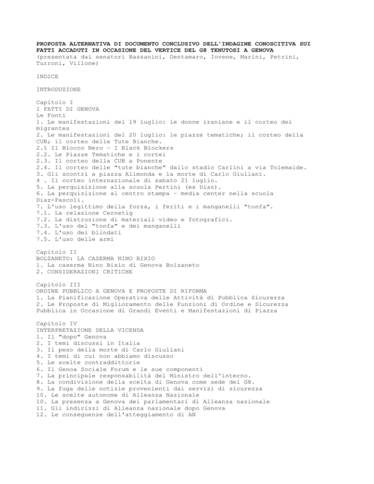 PROPOSTA ALTERNATIVA DI DOCUMENTO CONCLUSIVO DELL'INDAGINE CONOSCITIVA SUI FATTI ACCADUTI IN OCCASIONE DEL VERTICE DEL G8 TENUTOSI A GENOVA (presentata dai senatori Bassanini, Dentamaro, Iovene, Marini, Petrini, Turroni, Villone) INDICE INTRODUZIONE Capitolo I I FATTI DI GENOVA Le Fonti 1. Le manifestazioni del 19 luglio: le donne iraniane e il corteo dei migrantes 2. Le manifestazioni del 20 luglio: le piazze tematiche; il corteo della CUB; il corteo delle Tute Bianche. 2.1 Il Blocco Nero Ð I Black Blockers 2.2. Le Piazze Tematiche e i cortei 2.3. Il corteo della CUB a Ponente 2.4. Il corteo delle "tute bianche" dallo stadio Carlini a via Tolemaide. 3. Gli scontri a piazza Alimonda e la morte di Carlo Giuliani. 4 . Il corteo internazionale di sabato 21 luglio. 5. La perquisizione alla scuola Pertini (ex Diaz). 6. La perquisizione al centro stampa Ð media center nella scuola Diaz-Pascoli. 7. L'uso legittimo della forza, i feriti e i manganelli "tonfa". 7.1. La relazione Cernetig 7.2. La distruzione di materiali video e fotografici. 7.3. L'uso del "tonfa" e dei manganelli 7.4. L'uso dei blindati 7.5. L'uso delle armi Capitolo II BOLZANETO: LA CASERMA NINO BIXIO 1. La caserma Nino Bixio di Genova Bolzaneto 2. CONSIDERAZIONI CRITICHE Capitolo III ORDINE PUBBLICO A GENOVA E PROPOSTE DI RIFORMA 1. La Pianificazione Operativa delle Attivitˆ di Pubblica Sicurezza 2. Le Proposte di Miglioramento delle Funzioni di Ordine e Sicurezza Pubblica in Occasione di Grandi Eventi e Manifestazioni di Piazza Capitolo IV INTERPRETAZIONE DELLA VICENDA 1. Il "dopo" Genova 2. I temi discussi in Italia 3. Il peso della morte di Carlo Giuliani 4. I temi di cui non abbiamo discusso 5. Le scelte contraddittorie 6. Il Genoa Sociale Forum e le sue componenti 7. La principale responsabilitˆ del Ministro dell'interno. 8. La condivisione della scelta di Genova come sede del G8. 9. La fuga delle notizie provenienti dai servizi di sicurezza 10. Le scelte autonome di Alleanza Nazionale 10. La presenza a Genova dei parlamentari di Alleanza nazionale 11. Gli indirizzi di Alleanza nazionale dopo Genova 12. Le conseguenze dell'atteggiamento di AN 13. Il comportamento delle forze dell'ordine CONSIDERAZIONI CONCLUSIVE ---------------------------------------------------------------------------Introduzione Nei giorni 19, 20 e 21 luglio 2001 si tenne a Genova il cosiddetto G8, vertice dei sette Paesi pi• industrializzati del mondo pi• la Russia. I giorni dei vertice furono caratterizzati da gravi disordini e dalla morte di un giovane manifestante, Carlo Giuliani, che fu colpito da un colpo d'arma da fuoco esploso da un carabiniere accerchiato da manifestanti. I gruppi parlamentari dell'Ulivo chiesero un'indagine parlamentare; ricevuta dalla maggioranza una risposta negativa presentarono una mozione di sfiducia nei confronti del Ministro degli Interni Claudio Scajola. Il Senato respinse la mozione di sfiducia. Successivamente, anche per l'impegno politico e parlamentare del centro-sinistra, per la domanda di veritˆ che veniva dai mezzi d'informazione e dall'opinione pubblica, per il moltiplicarsi di notizie di abusi perpetrati nei confronti di manifestanti inermi, per l'irritazione che i fatti avevano suscitato in molti paesi europei, la maggioranza fu costretta ad approvare la richiesta d'indagine parlamentare. Il 1 agosto tanto la Commissione Affari Costituzionali del Senato quanto l'analoga Commissione del Senato approvarono la richiesta d'indagine sulla quale i gruppi parlamentari del centro sinistra aveva continuato ad insistere. Conseguentemente il Presidente della Camera attivava le procedure per addivenire alle intese con il Presidente del Senato necessarie per procedere allo svolgimento congiunto da parte delle due Commissioni dell'indagine conoscitiva. Le intese perfezionate in data 2 agosto 2001, prevedevano che le due Commissioni avrebbero proceduto nell'indagine costituendo un apposito Comitato paritetico costituito da 36 membri (18 deputati e 18 senatori) ripartiti tra i Gruppi secondo i consueti criteri vigenti per la formazione degli organi bicamerali, secondo i criteri della rappresentativitˆ e della proporzionalitˆ dei Gruppi, nel rispetto del margine di maggioranza. Il Comitato sarebbe stato presieduto da un deputato in applicazione della prassi secondo la quale il Regolamento destinato a disciplinarne l'attivitˆ • quello della Camera che per prima ha deliberato l'indagine conoscitiva. L'Ufficio di Presidenza del Comitato (composto, oltre che dal Presidente, da due Vice Presidenti e da due segretari) sarebbe stato nominato sulla base delle intese raggiunte in sede di Uffici di Presidenza congiunti delle due Commissioni, integrati dai rappresentanti dei Gruppi, ovvero, in mancanza di unanimitˆ eletto - come da prassi - direttamente dal Comitato . Il termine per la conclusione dell'indagine veniva fissato per il 20 settembre 2001. Nella riunione del 3agosto 2001, gli Uffici di Presidenza, entrambi integrati dai rappresentanti dei Gruppi, delle due Commissioni procedevano alla Costituzione del Comitato paritetico per l'indagine conoscitiva. Il Comitato • stato quindi composto, in base alle designazioni dei Gruppi, dai deputati Donato Bruno (FI), Fabrizio Cicchitto (FI), Filippo Mancuso (FI), Nitto Francesco Palma (FI), Michele Saponara (FI), Luciano Violante (DS-U), Antonio Soda (DS-U), Grazia Labate (DS-U), Katia Zanotti (DS-U), Gianfranco Anedda (AN), Roberto Menia (AN), Filippo Ascierto (AN), Gianclaudio Bressa (Margherita, DL-L'Ulivo), Giannicola Sinisi (Margherita, DL-L'Ulivo), Marco Boato (Misto), Erminia Mazzoni (CCD-CDU-Biancofiore), Pietro Fontanini (LNP), Graziella Mascia (RC) e dai senatori Gabriele Boscetto (FI), Luciano Falcier (FI), Maria Claudia Ioannucci (FI); Andrea Pastore (FI), Antonio Tommasini (FI), Franco Bassanini (DS-U), Massimo Villone (DS-U), Antonio Iovene (DS-U), Luciano Magnalb˜ (AN), Luigi Bobbio (AN), Ida Dentamaro (Margherita, DL-L'Ulivo), Pierluigi Petrini (Margherit