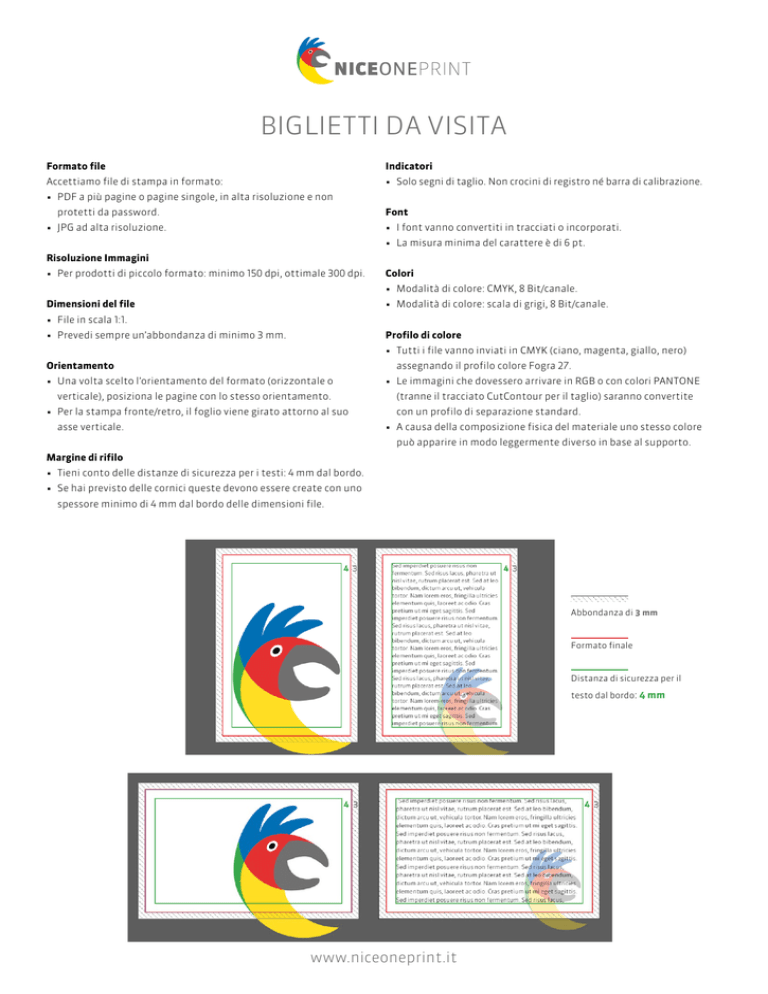 BIGLIETTI DA VISITA Formato file Indicatori Accettiamo file di stampa in formato: • Solo segni di taglio. Non crocini di registro né barra di calibrazione. • PDF a più pagine o pagine singole, in alta risoluzione e non protetti da password. Font • JPG ad alta risoluzione. • I font vanno convertiti in tracciati o incorporati. • La misura minima del carattere è di 6 pt. Risoluzione Immagini • Per prodotti di piccolo formato: minimo 150 dpi, ottimale 300 dpi. Colori • Modalità di colore: CMYK, 8 Bit/canale. Dimensioni del file • Modalità di colore: scala di grigi, 8 Bit/canale. • File in scala 1:1. • Prevedi sempre un’abbondanza di minimo 3 mm. Profilo di colore • Tutti i file vanno inviati in CMYK (ciano, magenta, giallo, nero) Orientamento assegnando il profilo colore Fogra 27. • Una volta scelto l’orientamento del formato (orizzontale o verticale), posiziona le pagine con lo stesso orientamento. • Per la stampa fronte/retro, il foglio viene girato attorno al suo asse verticale. • Le immagini che dovessero arrivare in RGB o con colori PANTONE (tranne il tracciato CutContour per il taglio) saranno convertite con un profilo di separazione standard. • A causa della composizione fisica del materiale uno stesso colore può apparire in modo leggermente diverso in base al supporto. Margine di rifilo • Tieni conto delle distanze di sicurezza per i testi: 4 mm dal bordo. • Se hai previsto delle cornici queste devono essere create con uno spessore minimo di 4 mm dal bordo delle dimensioni file. Abbondanza di 3 mm Formato finale Distanza di sicurezza per il testo dal bordo: 4 mm www.niceoneprint.it
