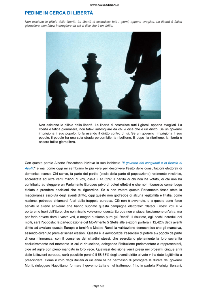 www.nexusedizioni.it PEDINE IN CERCA DI LIBERTÀ Non esistono le pillole della libertà. La libertà si costruisce tutti i giorni, appena svegliati. La libertà è fatica giornaliera, non fatevi imbrogliare da chi vi dice che è un diritto. Non esistono le pillole della libertà. La libertà si costruisce tutti i giorni, appena svegliati. La libertà è fatica giornaliera, non fatevi imbrogliare da chi vi dice che è un diritto. Se un governo imprigiona il suo popolo, lo fa usando il diritto contro di lui. Se un governo imprigiona il suo popolo, il popolo ha una sola strada percorribile: la ribellione. E dopo la ribellione, la libertà è ancora fatica giornaliera. Con queste parole Alberto Roccatano iniziava la sua inchiesta "Il governo dei congiurati e la freccia di Apollo" e mai come oggi mi sembrano le più vere per descrivere l'esito delle consultazioni elettorali di domenica scorsa. Chi scrive, fa parte del partito (ossia della parte di popolazione) realmente vincitrice, accreditata ad oltre venti milioni di voti, ossia il 41,32%: il partito di chi non ha votato, di chi non ha contribuito ad eleggere un Parlamento Europeo privo di poteri effettivi e che non riconosco come luogo titolato a prendere decisioni che mi riguardino. Se a non votare questo Parlamento fosse stata la maggioranza assoluta degli aventi diritto, oggi questo non godrebbe di alcuna legittimità e l'Italia, come nazione, potrebbe chiamarsi fuori dalla trappola europea. Ciò non è avvenuto, e a questo sono forse servite le sirene anti-euro che hanno suonato questa campagna elettorale: "dateci i vostri voti e vi porteremo fuori dall'Euro, che noi mica lo volevamo, questa Europa non ci piace, facciamone un'altra, ma per farlo dovete darci i vostri voti, e magari buttiamo pure giù Renzi". Il risultato, agli occhi increduli dei molti, sarà l'opposto: la partecipazione del MoVimento 5 Stelle alle elezioni porterà il 12,42% degli aventi diritto ad avallare questa Europa e fornirà a Matteo Renzi la validazione democratica che gli mancava, essendo divenuto premier senza elezioni. Questa è la democrazia: l'esercizio di potere sul popolo da parte di una minoranza, con il consenso dei cittadini stessi, che esercitano pienamente la loro sovranità esclusivamente nel momento in cui vi rinunciano, delegando l'istituzione parlamentare a rappresentarli, cioè ad agire con pieno mandato in loro vece. Qualsiasi decisione verrà presa nei prossimi cinque anni dalle istituzioni europee, sarà possibile perché il 58,68% degli aventi diritto al voto vi ha dato legittimità a prescindere. Come il voto degli italiani di un anno fa ha permesso di prorogare la durata del governo Monti, rieleggere Napolitano, formare il governo Letta e nel frattempo, fritto in padella Pierluigi Bersani, Page 1/2 www.nexusedizioni.it sostituirlo alla guida del Pd con Matteo Renzi, eleggendo poi quest'ultimo alla Presidenza del Consiglio al posto di Letta senza passare per le elezioni, senza nemmeno essere un membro del Parlamento. Ed infine, legittimandolo con il successo elettorale delle Europee. A cosa è servito il tentativo di Beppe Grillo di giocare tutte le sue carte per far vincere il MoVimento 5 Stelle, finanche recandosi nel salotto televisivo di Bruno Vespa? Non a vincere. Ma, indipendentemente dalla buona fede o meno del leader cinquestelle, a portare acqua al mulino europeo e al mulino renziano. A cosa è servito il tentativo di sottoporre ad impeachment Giorgio Napolitano? Non a destituirlo, o quantomeno puntare i riflettori sulle molte zone d'ombra della Presidenza della Repubblica, perché bocciato dal Comitato parlamentare, come peraltro prevedibile. Forse, è servito a mostrare alle persone di buona volontà come non si possa vincere ad un tavolo truccato, in cui i giocatori, bari, decidono le regole, e le cambiano in corso d'opera. Il tavolo truccato può essere rovesciato. O ignorato. Il fallimento del MoVimento 5 Stelle apre una grande possibilità di comprensione per tutti noi. Smettiamola di giocare al loro gioco. Di inseguirli, di dirci quantosiamobravinoi e quantosonobruttiecattiviloro. Voler cambiare il mondo è come inseguire la propria ombra: il mondo non si può cambiare, possiamo solo, se lo vogliamo, se una voce di Verità sussurra ai nostri orecchi che hanno fatto del Silenzio il loro motivo ispiratore… cambiare noi stessi. Se l'Universo è dentro di noi, perché non esprimiamo ciò che siamo, anziché arrabbiarci o svilirci perché non troviamo spazio nel gioco altrui, se non come pedine? Forse, nell'abisso della più profonda schiavitù i prodromi della Libertà illuminano il cercatore… Articolo di Messiah Pallavicini Nota dell'autore: per la comprensione della democrazia, può essere utile il libro Dalle Stragi del 1992 a Mario Monti di Alberto Roccatano, per oggi e per domani (in particolare le pagine 455 - 505). Page 2/2 Powered by TCPDF (www.tcpdf.org)