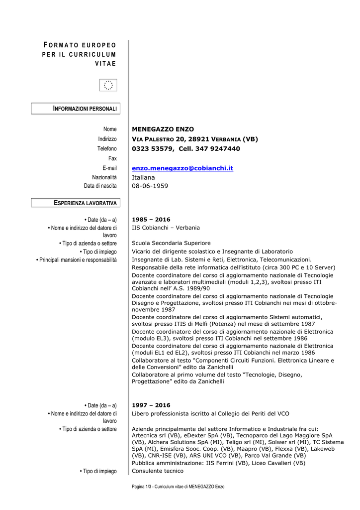 FORMATO EUROPEO PER IL CURRICULUM VITAE INFORMAZIONI PERSONALI Nome MENEGAZZO ENZO Indirizzo VIA PALESTRO 20, 28921 VERBANIA (VB) Telefono 0323 53579, Cell. 347 9247440 Fax E-mail Nazionalità Data di nascita [email protected] Italiana 08-06-1959 ESPERIENZA LAVORATIVA • Date (da – a) • Nome e indirizzo del datore di lavoro • Tipo di azienda o settore • Tipo di impiego • Principali mansioni e responsabilità 1985 – 2016 • Date (da – a) • Nome e indirizzo del datore di lavoro • Tipo di azienda o settore 1997 – 2016 • Tipo di impiego IIS Cobianchi – Verbania Scuola Secondaria Superiore Vicario del dirigente scolastico e Insegnante di Laboratorio Insegnante di Lab. Sistemi e Reti, Elettronica, Telecomunicazioni. Responsabile della rete informatica dell’istituto (circa 300 PC e 10 Server) Docente coordinatore del corso di aggiornamento nazionale di Tecnologie avanzate e laboratori multimediali (moduli 1,2,3), svoltosi presso ITI Cobianchi nell’ A.S. 1989/90 Docente coordinatore del corso di aggiornamento nazionale di Tecnologie Disegno e Progettazione, svoltosi presso ITI Cobianchi nei mesi di ottobrenovembre 1987 Docente coordinatore del corso di aggiornamento Sistemi automatici, svoltosi presso ITIS di Melfi (Potenza) nel mese di settembre 1987 Docente coordinatore del corso di aggiornamento nazionale di Elettronica (modulo EL3), svoltosi presso ITI Cobianchi nel settembre 1986 Docente coordinatore del corso di aggiornamento nazionale di Elettronica (moduli EL1 ed EL2), svoltosi presso ITI Cobianchi nel marzo 1986 Collaboratore al testo “Componenti Circuiti Funzioni. Elettronica Lineare e delle Conversioni” edito da Zanichelli Collaboratore al primo volume del testo “Tecnologie, Disegno, Progettazione” edito da Zanichelli Libero professionista iscritto al Collegio dei Periti del VCO Aziende principalmente del settore Informatico e Industriale fra cui: Artecnica srl (VB), eDexter SpA (VB), Tecnoparco del Lago Maggiore SpA (VB), Alchera Solutions SpA (MI), Teligo srl (MI), Solwer srl (MI), TC Sistema SpA (MI), Emisfera Sooc. Coop. (VB), Maapro (VB), Flexxa (VB), Lakeweb (VB), CNR-ISE (VB), ARS UNI VCO (VB), Parco Val Grande (VB) Pubblica amministrazione: IIS Ferrini (VB), Liceo Cavalieri (VB) Consulente tecnico Pagina 1/3 - Curriculum vitae di MENEGAZZO Enzo • Principali mansioni e responsabilità Ambiente Windows Gestione ed amministrazione dei sistemi Server Windows 2000/2003/2008 Gestione ed amministrazione di Active Directory, DNS e DHCP Internet Information Server 5/6/7 (Installazione, amministrazione, gestione, troubleshooting di siti Web ed FTP su piattaforma Microsoft Windows 2000/2003/2008 Server) Exchange Server 2003 e Outlook Web Access Ambiente Linux Installazione e configurazione di server basati su Linux Fedora (RedHat) o Ubuntu, che offrono servizi quali: SMTP (Postfix: gestione quote mailbox, creazione utenti per domini virtuali. Supporto antivirus e anti spam) Web (Apache: creazione e gestione di virtual host, redirecting, SSL) Ftp, Proftpd: autorizzazione classi utenti (anonymous o real) DNS Bind 8 e 9 (gestione completa delle zone, gest. di DNS Master/Slave) SysLog (centralizzazione e gestione di LOG su macchina centralizzata) Firewall (gestione e realizzazione di firewall mediante IpTables) Proxy (gestione di Server Proxy Squid + Dansguardian) Webmail con Qmail e Vpopmail, Squirrelmail Statistiche Web, Mail ed FTP con Awstats Network monitor: Nagios (macchine e servizi), Mrtg IDS (Intrusione Detection System) SNORT (gestione e interazione con Pix) Networking Configurazione VLAN con Switch di layer 2 e 3 Config. Router Cisco per connessioni ISDN, ADSL, Frame Relay e CDN Configurazione NAT, DHCP, ACL, OSPF e BGP Firewall Cisco PIX/ASA Varie Gestione centralizzata Antivirus McAfee ePolicy Orchestrator (installazione, configurazione) Gestione domini (Registrazione in Italia e all’estero) Gestione LIR e AS presso il RIPE Backup e disaster recovery Analisi di reti TCP/IP mediante sniffer software per individuare anomalie e/o ottimizzare il traffico di rete • Date (da – a) • Nome e indirizzo del datore di lavoro • Tipo di azienda o settore • Tipo di impiego • Principali mansioni e responsabilità 2008 – 2010 • Date (da – a) • Nome e indirizzo del datore di lavoro • Tipo di azienda o settore • Tipo di impiego • Principali mansioni e responsabilità 2000 – 2003 • Date (da – a) • Nome e indirizzo del datore di lavoro • Tipo di azienda o settore • Tipo di impiego 1985 – 1994 ARS UNI VCO Associazione per gli studi Universitari nel Verbano Cusio Ossola Tutor (corso di Ingegneria Informatica – Politecnico di Torino) Tutor per gli esami di: Introduzione alle reti telematiche e Reti di calcolatori Procura della Repubblica presso il Tribunale di Verbania Tribunale di Verbania Consulente Tecnico d’Ufficio – C.T.U. Consulenze di natura informatica Centro di Formazione Professionale del Comune di Verbania Centro di Formazione Professionale Docente esperto Pagina 2/3 - Curriculum vitae di MENEGAZZO Enzo • Principali mansioni e responsabilità Docente di Strumentazione (A.F. 1985/86 e 1986/87), docente di Progetto Finale (A.F. 1987/88), docente di Informatica (A.F. 1987/88, 1988/89, 1989/90), docente di Linguaggio C e Windows (A.F. 1991), docente di Informatica, formatori di Windows e Word per Windows (A.F. 1992/93) • Date (da – a) • Nome e indirizzo del datore di lavoro • Tipo di azienda o settore • Tipo di impiego • Principali mansioni e responsabilità 1980 – 1985 ITIS “E. Fermi” – Mantova Scuola Secondaria Superiore Insegnante di Laboratorio Insegnante di Lab. Elettronica ISTRUZIONE E FORMAZIONE • Date (da – a) • Nome e tipo di istituto di istruzione o formazione • Principali materie / abilità professionali oggetto dello studio • Qualifica conseguita • Date (da – a) • Nome e tipo di istituto di istruzione o formazione • Principali materie / abilità professional