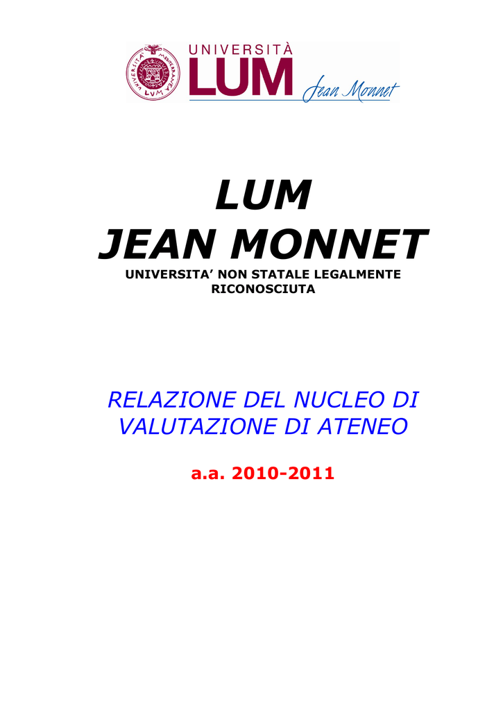 LUM JEAN MONNET UNIVERSITA’ NON STATALE LEGALMENTE RICONOSCIUTA RELAZIONE DEL NUCLEO DI VALUTAZIONE DI ATENEO a.a. 2010-2011 Sommario Presentazione……………… 1. 2. LA GESTIONE STRATEGICA 1.1. Obiettivi e strategie di sviluppo dell’Ateneo 1.2 Analisi della domanda e del posizionamento dell’Ateneo 1.2.1.Analisi della domanda e delle caratteristiche degli Studenti 1.2.2. Rapporti dell’Università con l’esterno 1.3.Commenti del Nucleo p.5 p.7 p.7 p.10 p.13 LA STRUTTURA ORGANIZZATIVA 2.1.Presentazione della struttura e dell’attività Amministrativa 2.2 Procedure e sistema informativo per la gestione amministrativa 2.3 Reti di Ateneo 2.4. Personale tecnico amministrativo 2.5. Disponibilità, fabbisogno e realizzazioni future 2.6. Grado di attuazione dello Statuto 2.7. Commenti del Nucleo 3. p. 5 3.1 3.2. LA DIDATTICA L’offerta didattica Informazioni sugli scambi internazionali degli studenti 3.3. Attività formativa post-lauream 3.4 Commenti del Nucleo 3.5. Organizzazione dell’attività didattica 3.5.1.Analisi delle risorse di docenza e del carico didattico 3.5.2.Analisi della disponibilità di spazi e attrezzature per la didattica 3.5.3.Commenti del Nucleo 3.6.Performance dell’attività didattica 3.6.1. Analisi dei risultati degli studenti 3.6.2. Analisi del conseguimento dei titoli e Analisi degli sbocchi professionali 3.6.3. Commenti del Nucleo 3.7. RELAZIONE RELATIVA ALL’ACQUISIZIONE DELL’OPINIONE DEGLI STUDENTI 3.7.1 Rapporto sulla rilevazione delle opinioni degli studenti frequentanti 3.7.2 METODOLOGIA 3.7.3 RISULTATI p.14 p.14 p.14 p.15 p.16 p.16 p.17 p.17 p.23 p.25 p.29 p.30 p.32 p.32 p.32 p. 32 p.33 p.33 p.37 p.39 2 4. LA RICERCA 4.1. FACOLTA’ DI ECONOMIA 4.1.1 Progetti di ricerca nazionali presentati 4.1.2 Progetti di ricerca con organismi esterni 4.1.3 Pubblicazioni e attività di ricerca dei docenti strutturati p.53 p.53 p.53 4.2. FACOLTA’ DI GIURISPRUDENZA 4.2.1 Progetti di ricerca nazionali presentati 4.2.2 Progetti di ricerca con organismi esterni 4.2.3 Pubblicazioni dei docenti strutturati p.71 p.71 p.72 4.3 Commenti del Nucleo p.99 5. CONVEGNI, SEMINARI E OPENLAB p.99 p.116 5.1 Commenti del Nucleo 6. INTERVENTI PER IL DIRITTO ALLO STUDIO 6.1 6.2 6.3 6.4 6.5 6.6 Interventi per diritto allo studio attuati dall’Ateneo Servizio residenziale Servizio di ristorazione Servizio Fotocopie Attività sportive Commenti del Nucleo p.116 p.117 p.117 p.117 p.117 p.117 7. SERVIZI COMPLEMENTARI DELL’ATENEO 7.1 Segreteria amministrativa per studenti e Segreteria Docenti 7.2 Biblioteca 7.3 Laboratorio Informatico e Linguistico 7.4 Sito web 7.5 Servizi di Orientamento ex ante e in itinere 7.6 Ufficio Stage 7.7 Ufficio Stampa 7.8. Commenti del Nucleo p.118 p.119 p.119 p.120 p.120 p.123 p.124 p.125 8 IL RUOLO E LE ATTIVITA’ DEL NUCLEO DI VALUTAZIONE 8.1 Normativa e composizione organizzativa p.127 3 PRESENTAZIONE Il Nucleo di Valutazione dell’Ateneo “LUM Jean Monnet torna ad esprimersi, come e ormai tradizione, sui risultati raggiunti dall’Ateneo e su quelli che sono ancora da raggiungere, intendendo la Relazione ”, per l’anno accademico 2011-2012, come uno strumento certo di valutazione, ma anche di collaborazione e di stimolo, per l’Ateneo e, soprattutto, come un momento di riflessione calibrata sulle aspettative riposte in esso, non risparmiando, dove fosse necessario, critiche e suggerimenti. Solo attraverso questa operazione è possibile individuare le aree e le attività sulle quali concentrare gli sforzi e protendere verso un significativo e proficuo miglioramento, avvalendosi anche delle valutazioni provenienti dalle varie componenti dell’Ateneo e, tra queste, di quella degli studenti che, all’insegna di un libero confronto quotidiano, valutano ogni giorno l’offerta della “LUM Jean Monnet. Nel convincimento che l’università è luogo di incontro così come di scontro, di idee e di pensieri, di libertà di espressione e di visioni molteplici. 4 1 LA GESTIONE STRATEGICA 1.1. Obiettivi e strategie di sviluppo dell’Ateneo La tendenza cui la “LUM Jean Monnet” dichiara di ispirarsi si riassumere nella proposta di sintesi tra globale e locale tesa all’obiettivo di formare una classe dirigente che sappia interagire tanto con il contesto locale, quanto con quello europeo. L’Università ritiene infatti che il proprio territorio di riferimento si presti particolarmente a tale operazione culturale perché posto a ideale porta di ingresso del bacino orientale del Mediterraneo verso il cuore dell’Europa. A ciò si conforma, nel progetto proposto dall’Ateneo l’offerta formativa che anche per l’anno accademico 2010-2011 è articolata su due Facoltà, un Corso di Laurea Magistrale a ciclo unico, due Corsi di Laurea, un Corso di Laurea Magistrale. Nello specifico dell’anno accademico 2010-2011, la Facoltà di Economia ha presentato come Classe di Laurea la Classe L-18, “Scienze dell’Economia e della Gestione Aziendale”, con il corso in Economia ed Organizzazione Aziendale, suddiviso in tre percorsi professionalizzanti, come è illustrato nella tabella qui sotto: FACOLTA' ECONOMIA LAUREA Curricula professionalizzanti ECONOMIA ED ORGANIZZAZIONE AZIENDALE (CLASSE L-18) General Management (LM) Banche, Mercati e Finanza (BMF) Management del Turismo, dello sport e dell’arte (TSA) Al fine di garantire studi di base comuni agli studenti della Facoltà di Economia i detti percorsi professionalizzanti hanno avuto in comune il primo anno. E’ stata prevista la possibilità, inoltre, per gli studenti già iscritti con il vecchio ordinamento alla Laurea Triennale, di poter effettuare il passaggio alla nuova laurea, con il conseguente riconoscimento degli esami già sostenuti. Per quanto concerne la Laurea Magistrale, la Facoltà di Economia ha attivato la Classe LM-77 (Scienze Economico Aziendali), con il Corso in Economia e Management, suddiviso in tre percorsi professionalizzanti, come è illustrato qui sotto: LAUREA MAGISTRALE C