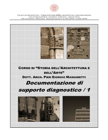 FACOLTÀ DI ARCHITETTURA – CORSO DI STUDIO (0880): ARCHITETTURA E PROCESSO EDILIZIO ALMA MATER STUDIORUM / UNIVERSITA’ DI BOLOGNA – SEDE DI CESENA 596, VIALE EUROPA - 47023 CESENA – SEGRETERIA DIDATTICA: TEL. 0547.338730 - FAX 0541.338728 CORSO DI “STORIA DELL’ARCHITETTURA E DELL’ARTE” DOTT. ARCH. PIER GIORGIO MASSARETTI Documentazione di supporto diagnostico / 1 FACOLTÀ DI ARCHITETTURA – CORSO DI STUDIO (0880): ARCHITETTURA E PROCESSO EDILIZIO ALMA MATER STUDIORUM / UNIVERSITA’ DI BOLOGNA – SEDE DI CESENA 596, VIALE EUROPA - 47023 CESENA – SEGRETERIA DIDATTICA: TEL. 0547.338730 - FAX 0541.338728 CORSO DI “STORIA DELL’ARCHITETTURA E DELL’ARTE” – DOTT. ARCH. PIER GIORGIO MASSARETTI Documentazione di supporto diagnostico Articolazione programmatica FASCICOLO 1 1) LA BIBLIOTECA DEL CORSO 1.1) Ricerca bibliografica on line 1.2) Organizzazione della biblioteca 1.3) Catalogo della biblioteca Siti WEB per la ricerca bibliografica Soggettario dei volumi raccolti Catalogo dei volumi raccolti 2) LA LETTURA DEL “RACCONTO” ARCHITETTONICO Perché la ricerca e la didattica “storica”? 2.1) Interrogativi diagnostici Capisaldi della ricerca-didattica “storica” 2.2) Percorsi di lettura 2.3) Glossario degli elementi architettonici FASCICOLO 2 3) CENSIMENTO ERMENEUTICO – ISTRUZIONI PER L’USO Informazioni preliminari sul 3.0) Interpretare il “racconto/testo” architettonico contesto geo-storico delle singole opere Paradigmi interpretativi 3.1) L’architettura arcaica (mediorientale ed egiziana) 3.2) L’architettura ellenistica 3.3) L’architettura romana 3.4) L’architettura paleocristiana e bizantina 3.5) L’architettura romanica 3.6) L’architettura gotica 3.7) L’architettura rinascimentale 3.8) L’architettura manieristica e barocca 3.9) L’architettura neoclassica 3.10) L’architettura moderna e contemporanea Menù delle 3.11) Interpretare il “racconto/testo” architettonico interrogazioni interpretative Diagnostica del singolo evento FAT/SdAA/Esercitazione_Pro-00 –1 FACOLTÀ DI ARCHITETTURA – CORSO DI STUDIO (0880): ARCHITETTURA E PROCESSO EDILIZIO ALMA MATER STUDIORUM / UNIVERSITA’ DI BOLOGNA – SEDE DI CESENA 596, VIALE EUROPA - 47023 CESENA – SEGRETERIA DIDATTICA: TEL. 0547.338730 - FAX 0541.338728 CORSO DI “STORIA DELL’ARCHITETTURA E DELL’ARTE” – DOTT. ARCH. PIER GIORGIO MASSARETTI Documentazione di supporto diagnostico LA BIBLIOTECA DEL CORSO – Ricerca bibliografica on line 1) I sistemi “MultiOPAC” a) MultiOPAC “AZALAI”: http://azalai.cilea.it b) MultiOPAC “Sistema bibliotecario PoliTo”: http://www.biblio.polito.it c) MultiOPAC “Biblioteche italiane”: http://wwwbiblio.polito.it/it/documentazione/biblioit.html d) MultiOPAC “Biblioteche europee”: http://wwwbiblio.polito.it/it/documentazione/biblioeu.html e) MultiOPAC “Library WWW Servers”: http://sunsite.berkeley.edu/Libweb 2) Il “Sistema Bibliotecario Nazionale” a) Sito ICCU: http://opac.sbn.it b) Catalogo Italiano Periodici: http://acnp.cib.unibo.it/cgi-ser/start/it/cnr/fp.html c) Coordinam. Naz. Biblioteche di Architettura: http://www.cnba.it/maia.php 3) Biblioteche Universitarie di Architettura a) VENEZIA_IUAV-Biblioteca: http://iuavbc.iuav.it; http://www.iuav.it/archivioprogetti b) MILANO_Politecnico: http://www.biblio.polimi.it c) TORINO_Politecnico: http://www.biblio.polito.it d) FIRENZE_Home page regionale: http://opac.unifi.it; http://www.unifi.it/universita/biblioteche 4) Biblioteche Universitarie dell’Emilia-Romagna a) Home page CIB-UNIBO: http://sol.cib.unibo.it:8080/SebinaOpac/Opac b) Home page Biblioteca “Dip. Architettura e Pianificazione Territoriale”: http://sol.cib.unibo.it:8080/SebinaOpac/Opac?sysb=UBOAT c) Home page Biblioteca “Facoltà Architettura Cesena”: http://sol.cib.unibo.it:8080/SebinaOpac/Opac?sysb=UBOAH d) Home page della “Romagna”: http://opac.provincia.ra.it/SebinaOpac/Opac FAT/SdAA/Esercitazione_Pro-11.00 –2 FACOLTÀ DI ARCHITETTURA – CORSO DI STUDIO (0880): ARCHITETTURA E PROCESSO EDILIZIO ALMA MATER STUDIORUM / UNIVERSITA’ DI BOLOGNA – SEDE DI CESENA 596, VIALE EUROPA - 47023 CESENA – SEGRETERIA DIDATTICA: TEL. 0547.338730 - FAX 0541.338728 CORSO DI “STORIA DELL’ARCHITETTURA E DELL’ARTE” – DOTT. ARCH. PIER GIORGIO MASSARETTI Documentazione di supporto diagnostico LA BIBLIOTECA DEL CORSO – Ricerca bibliografica on line 1) I sistemi “MultiOPAC” a) MultiOPAC “AZALAI”: http://azalai.cilea.it MAI. Ricerca globale una collaborazione tra AIB e CILEA Interrogazione cumulativa dei cataloghi delle biblioteche italiane Cumulative query in Italian Internet library catalogues Immettere uno o più termini per almeno un campo di ricerca TITOLO: AUTORE: TIPO DI DOCUMENTO: tutti i documenti solo risposte positive ANNULLA INVIO premere una sola volta e attendere Questo metaOPAC è indicato per la ricerca di documenti poco comuni non trovati in altri cataloghi italiani. Usarlo come strumento di ricerca primario è sconsigliabile, perché produce risultati sovrabbondanti e rallenta il funzionamento. Attraverso questa maschera vengono interrogati direttamente tutti i cataloghi attualmente connessi al MAI; sono disponibili anche una ricerca selettiva per aree geografiche, tipi di biblioteche e tipi di documenti; e una ricerca per regione. Tutti i cataloghi in rete italiani, compresi quelli non interrogabili dal MAI, possono inoltre essere consultati singolarmente a partire dal repertorio degli OPAC italiani. FAT/SdAA/Supporti/Esercitazione_Pro-11.1a –3 FACOLTÀ DI ARCHITETTURA – CORSO DI STUDIO (0880): ARCHITETTURA E PROCESSO EDILIZIO ALMA MATER STUDIORUM / UNIVERSITA’ DI BOLOGNA – SEDE DI CESENA 596, VIALE EUROPA - 47023 CESENA – SEGRETERIA DIDATTICA: TEL. 0547.338730 - FAX 0541.338728 CORSO DI “STORIA DELL’ARCHITETTURA E DELL’ARTE” – DOTT. ARCH. PIER GIORGIO MASSARETTI Documentazione di supporto diagnostico LA BIBLIOTECA DEL CORSO – Ricerca bibliografica o