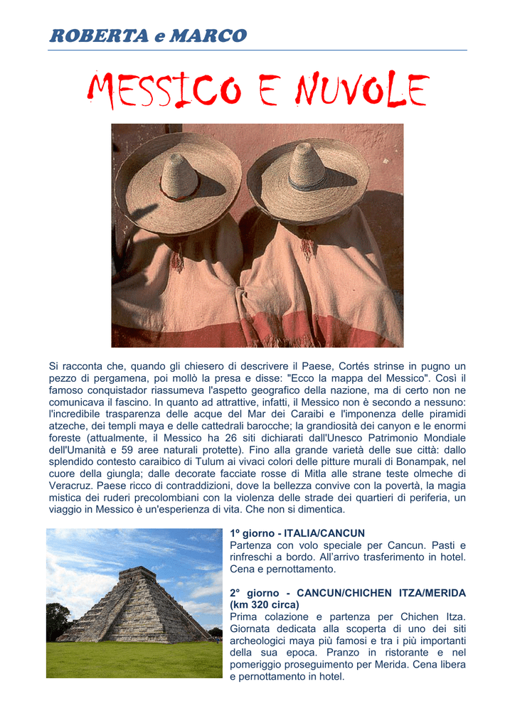 ROBERTA e MARCO MESSICO E NUVOLE Si racconta che, quando gli chiesero di descrivere il Paese, Cortés strinse in pugno un pezzo di pergamena, poi mollò la presa e disse: "Ecco la mappa del Messico". Così il famoso conquistador riassumeva l'aspetto geografico della nazione, ma di certo non ne comunicava il fascino. In quanto ad attrattive, infatti, il Messico non è secondo a nessuno: l'incredibile trasparenza delle acque del Mar dei Caraibi e l'imponenza delle piramidi atzeche, dei templi maya e delle cattedrali barocche; la grandiosità dei canyon e le enormi foreste (attualmente, il Messico ha 26 siti dichiarati dall'Unesco Patrimonio Mondiale dell'Umanità e 59 aree naturali protette). Fino alla grande varietà delle sue città: dallo splendido contesto caraibico di Tulum ai vivaci colori delle pitture murali di Bonampak, nel cuore della giungla; dalle decorate facciate rosse di Mitla alle strane teste olmeche di Veracruz. Paese ricco di contraddizioni, dove la bellezza convive con la povertà, la magia mistica dei ruderi precolombiani con la violenza delle strade dei quartieri di periferia, un viaggio in Messico è un'esperienza di vita. Che non si dimentica. 1º giorno - ITALIA/CANCUN Partenza con volo speciale per Cancun. Pasti e rinfreschi a bordo. All’arrivo trasferimento in hotel. Cena e pernottamento. 2° giorno - CANCUN/CHICHEN ITZA/MERIDA (km 320 circa) Prima colazione e partenza per Chichen Itza. Giornata dedicata alla scoperta di uno dei siti archeologici maya più famosi e tra i più importanti della sua epoca. Pranzo in ristorante e nel pomeriggio proseguimento per Merida. Cena libera e pernottamento in hotel. 3° giorno - MERIDA/UXMAL/CAMPECHE (km 220 circa) Dopo la prima colazione partenza in direzione di Uxmal, sito di rara bellezza caratterizzato da curati e ben conservati bassorilievi. Pranzo in ristorante e nel pomeriggio proseguimento per Campeche, affacciata sul Golfo del Messico. Giro orientativo della città, un tempo importante porto dal quale partivano i carichi di oro e argento per la Spagna. Sistemazione in hotel, cena libera e pernottamento. 4° giorno - CAMPECHE/PALENQUE (km 360 circa) Prima colazione e partenza per Palenque, importante città maya immersa nella foresta. Pranzo e visita dell’area archeologica. Al termine, sistemazione in hotel. Cena libera e pernottamento. 5° giorno - PALENQUE/CHICANNA (km 370 circa) Partenza per la visita dell’area archeologica di Chicanna, sito famoso per l’eleganza e ricchezza decorativa dei suoi edifici. Il nome di questo luogo significa “la casa dalla bocca di serpente” in allusione al grande mascherone della facciata centrale di una delle strutture. Rientro in hotel per il pranzo. Nel pomeriggio, visita dell’area archeologica di Xpujil, piccolo centro con alcuni edifici decorati a bassorilievo. Cena e pernottamento in hotel. 6° giorno - CHICANNA/KOHUNLICH/MAHAHUAL (km 250 circa) Prima colazione in hotel e partenza per la visita del sito archeologico di Kohunlich. Proseguimento per Mahahual, piccolo centro di pescatori immerso in bellezze naturali incontaminate. Pranzo e sistemazione in hotel. Cena e pernottamento. 7° giorno - MAHAHUAL/TULUM/CANCUN (km 350 circa) Dopo la prima colazione partenza verso Tulum per la visita del sito archeologico che si trova a picco sul Mar dei Caraibi. Pranzo in ristorante e al termine partenza per Cancun. Sistemazione in hotel, cena libera e pernottamento. 8° giorno - CANCUN/PLAYA DEL CARMEN (km 60 circa) In mattinata trasferimento per il Bravo Viva Atzeca per il previsto soggiorno balneare. All’arrivo sistemazione, cena e pernottamento in hotel. Dal 9° al 14° giorno – SOGGIORNO MARE AL BRAVO VIVA ATZECA. Villaggio dalle dimensioni contenute e raccolte, caratteristica rara e preziosa per gli hotel della Riviera Maya che permette di creare in un ambiente informale una vacanza all’insegna dell’italianità. La vicinanza a Playa del Carmen rende il villaggio la scelta ideale anche per gli amanti dello shopping e della vita notturna che potranno raggiungere anche a piedi la mitica ‘5a Avenida’, vero cuore pulsante della Riviera Maya. 15° giorno – PLAYA DEL CARMEN/CANCUN/ITALIA Mattinata a disposizione. Nel pomeriggio, trasferimento in tempo utile per l’aeroporto ed imbarco per il volo per l’Italia con arrivo il 16° giorno.