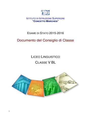 ISTITUTO DI ISTRUZIONE SUPERIORE “CONCETTO MARCHESI” ESAME DI STATO 2015-2016 Documento del Consiglio di Classe LICEO LINGUISTICO CLASSE V BL 1 DOCUMENTO DEL CONSIGLIO DI CLASSE 2 1. STORIA DELL’ISTITUTO L’Istituto di Istruzione Superiore "Concetto Marchesi" nasce nel 1971 a Padova, città universitaria, in cui la domanda di cultura classica è da sempre forte, come distaccamento del Liceo Classico "T. Livio". Diventa autonomo nel 1976 e viene intitolato al grande latinista, illustre Magnifico Rettore dell’Università di Padova, Concetto Marchesi che proprio per l’invito ad una vita culturalmente intensa e politicamente vitale, impersona lo stile del liceo. Dalla sua costituzione il liceo ha svolto una profonda promozione culturale in anni in cui lo studio delle materie classiche veniva svalutato in nome di un tecnicismo più produttivo, ha avvicinato tante giovani menti al grande patrimonio dell’antichità e ha saputo rinnovarsi e mantenere elevata la propria offerta didattica. Nel 1998 al liceo è stato aggregato l’Istituto Magistrale "E. Fuà Fusinato". L’Istituto, già succursale dell’Istituto Magistrale "A. di Savoia Duca d’Aosta", diviene autonomo nel 1968 e viene intitolato ad Erminia Fuà, poetessa e letterata di origine rodigina, coniugata con il poeta e patriota Arnaldo Fusinato, per l’importante ruolo da lei svolto come direttrice generale delle Scuole d’Italia, promotrice in anni difficili di riforme vaste e notevoli. Nel corso degli anni, ha ampliato la propria offerta formativa affiancando all’indirizzo magistrale quello a sperimentazione linguistica (C.M. 27/91); quando la normativa ha soppresso la scuola magistrale di quattro anni, è stato attivato l’indirizzo di Scienze Sociali. A partire dall’anno scolastico 2010/2011 gli indirizzi classico e linguistico sono stati riformati dal nuovo ordinamento dei licei e il liceo delle Scienze Sociali è stato sostituito dal liceo delle Scienze Umane, opzione economico-sociale. Nell’a. s. 2011/2012 è stata attivata una sezione del nuovo Liceo Musicale. 2. PRESENTAZIONE SINTETICA DELLA CLASSE a. STORIA DELLA CLASSE NEL TRIENNIO L’attuale 5BL, costituita nell’anno scolastico 2013-2014, all’inizio della classe terza era formata da 25 alunne. Alla fine della terza due alunne non sono state ammesse alla classe 4^. All’inizio del quarto anno, la classe era composta da 24 elementi, 22 provenienti dalla 3BL e due nuovi ingressi provenienti da altro Istituto. Alla fine del quarto anno un alunno non è stato ammesso alla classe successiva. All’inizio del quinto anno la classe risultava composta da 23 elementi, tutti provenienti dal medesimo gruppo classe. b. CONTINUITÀ DIDATTICA NEL TRIENNIO Nel triennio c’è stata continuità nelle seguenti discipline: Religione, Fisica, Francese, Matematica, Conversazione in Francese e in Spagnolo, Storia dell’Arte. Non c’è stata continuità per: Italiano (con avvicendamento dei proff. Rinaldi/Urru in 3^, Genova in 4^, Rinaldi/Tarantino in 5^), Inglese (con avvicendamento delle proff. Biancotto in 3^ e 4^ e Glielma in 5^), Storia e Filosofia (con avvicendamento delle prof.sse Sardelli in 3^ e Bortolami in 4^ e 5^), Spagnolo (con avvicendamento delle prof.sse Stocco in 3^ , Polo in 4^ e Molinari in 5^), Scienze naturali (con avvicendamento dei proff Balia in 3^, Balia/Vigliano in 4^ e Carluccio/Gallinaro in 5^), Conversazione in Inglese (con avvicendamento dei proff. Ozbun in 3^ e 4^ e Lucas in 5^), Scienze motorie (con avvicendamento delle proff. Caudullo in 3^ e Troncale in 4^ e 5^). c. SITUAZIONE DI PARTENZA DELLA CLASSE NELL’ANNO IN CORSO 3 All’inizio del corrente a.s. la classe manifestava le caratteristiche che le sono sempre state proprie: dal punto di vista del comportamento una discreta disponibilità alla partecipazione, che per alcune studentesse è perlopiù ricettiva, al dialogo formativo. Un diligente impegno nello studio individuale e in generale un buon rapporto con tutti i docenti. 3. OBIETTIVI GENERALI, EDUCATIVI E FORMATIVI, RAGGIUNTI Nel corso del triennio una piccola parte delle alunne, grazie anche ad un atteggiamento attivo e collaborativo, ha gradualmente acquisito il quadro completo delle conoscenze, ha imparato ad usare correttamente e con sicurezza il linguaggio specifico di ogni disciplina, ha acquisito la capacità di collegare tra loro i diversi saperi e di approfondire gli argomenti trattati, ha raggiunto una progressiva autonomia di lavoro, sviluppato capacità di elaborazione personale e critica e ha consolidato le competenze comunicative atte a comprendere ed interpretare i caratteri linguisticamente e culturalmente complessi della contemporaneità. Un più numeroso gruppo di alunne ha gradualmente acquisito il quadro generale delle conoscenze, ha imparato ad usare correttamente il linguaggio specifico di ogni disciplina, ha acquisito, almeno parzialmente, la capacità di collegare tra loro i diversi saperi ma non è sempre in grado di approfondire e/o elaborare gli argomenti trattati ed è avviato a comprendere ed interpretare i caratteri linguisticamente e culturalmente complessi della contemporaneità. Infine, alcune alunne hanno acquisito solo parzialmente il quadro delle conoscenze, presentano ancora qualche difficoltà ad usare correttamente il linguaggio specifico delle discipline, non sono sempre in grado di collegare tra loro i diversi saperi, né di approfondire gli argomenti trattati e/o di elaborare personalmente e criticamente i contenuti acquisiti. Dal punto di vista comportamentale tutte le studentesse, in modo diversificato, hanno nel tempo acquisito maggior senso di responsabilità e una certa consapevolezza delle proprie capacità e dei propri limiti. 4. CONOSCENZE, COMPETENZE E CAPACITÀ RAGGIUNTE Nell’ambito delle singole discipline si rinvia agli allegati A; nell’ambito delle aree disciplinari si nota quanto segue: - relativamente all’area linguistica, storico-filosofica e artistica, se pur 