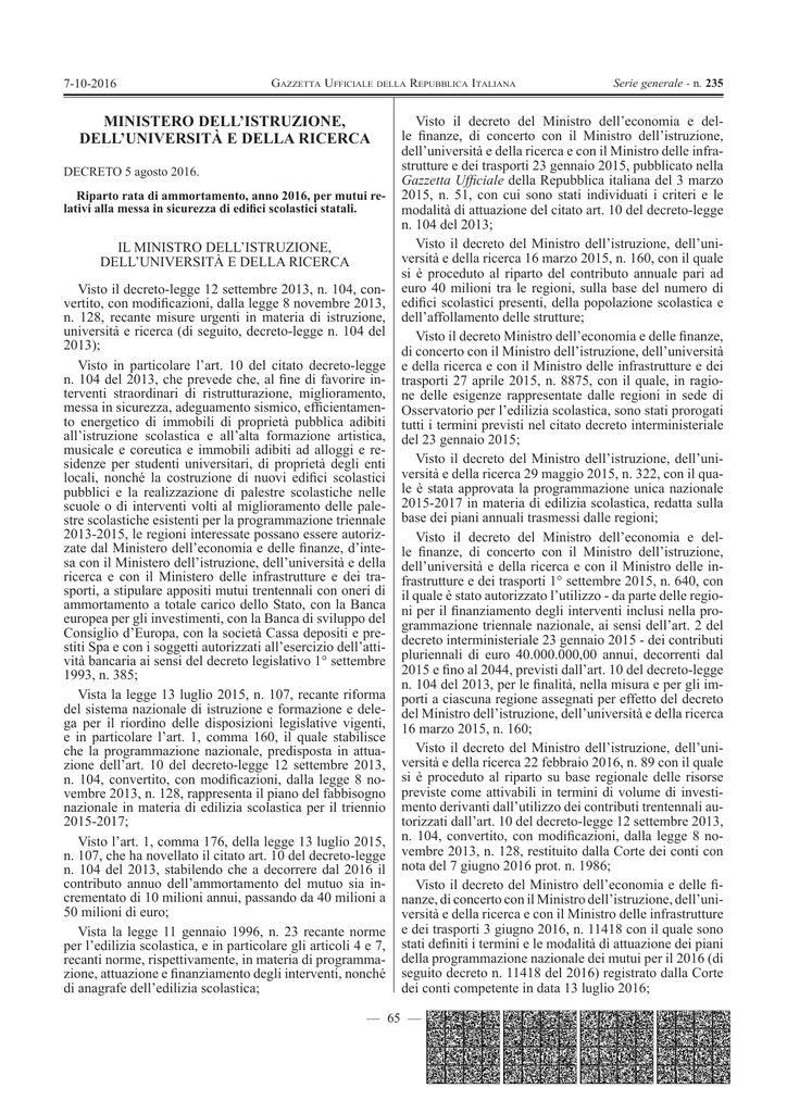 7-10-2016 GAZZETTA UFFICIALE DELLA REPUBBLICA ITALIANA MINISTERO DELL’ISTRUZIONE, DELL’UNIVERSITÀ E DELLA RICERCA DECRETO 5 agosto 2016. Riparto rata di ammortamento, anno 2016, per mutui relativi alla messa in sicurezza di edifici scolastici statali. IL MINISTRO DELL’ISTRUZIONE, DELL’UNIVERSITÀ E DELLA RICERCA Visto il decreto-legge 12 settembre 2013, n. 104, convertito, con modificazioni, dalla legge 8 novembre 2013, n. 128, recante misure urgenti in materia di istruzione, università e ricerca (di seguito, decreto-legge n. 104 del 2013); Visto in particolare l’art. 10 del citato decreto-legge n. 104 del 2013, che prevede che, al fine di favorire interventi straordinari di ristrutturazione, miglioramento, messa in sicurezza, adeguamento sismico, efficientamento energetico di immobili di proprietà pubblica adibiti all’istruzione scolastica e all’alta formazione artistica, musicale e coreutica e immobili adibiti ad alloggi e residenze per studenti universitari, di proprietà degli enti locali, nonché la costruzione di nuovi edifici scolastici pubblici e la realizzazione di palestre scolastiche nelle scuole o di interventi volti al miglioramento delle palestre scolastiche esistenti per la programmazione triennale 2013-2015, le regioni interessate possano essere autorizzate dal Ministero dell’economia e delle finanze, d’intesa con il Ministero dell’istruzione, dell’università e della ricerca e con il Ministero delle infrastrutture e dei trasporti, a stipulare appositi mutui trentennali con oneri di ammortamento a totale carico dello Stato, con la Banca europea per gli investimenti, con la Banca di sviluppo del Consiglio d’Europa, con la società Cassa depositi e prestiti Spa e con i soggetti autorizzati all’esercizio dell’attività bancaria ai sensi del decreto legislativo 1° settembre 1993, n. 385; Vista la legge 13 luglio 2015, n. 107, recante riforma del sistema nazionale di istruzione e formazione e delega per il riordino delle disposizioni legislative vigenti, e in particolare l’art. 1, comma 160, il quale stabilisce che la programmazione nazionale, predisposta in attuazione dell’art. 10 del decreto-legge 12 settembre 2013, n. 104, convertito, con modificazioni, dalla legge 8 novembre 2013, n. 128, rappresenta il piano del fabbisogno nazionale in materia di edilizia scolastica per il triennio 2015-2017; Visto l’art. 1, comma 176, della legge 13 luglio 2015, n. 107, che ha novellato il citato art. 10 del decreto-legge n. 104 del 2013, stabilendo che a decorrere dal 2016 il contributo annuo dell’ammortamento del mutuo sia incrementato di 10 milioni annui, passando da 40 milioni a 50 milioni di euro; Vista la legge 11 gennaio 1996, n. 23 recante norme per l’edilizia scolastica, e in particolare gli articoli 4 e 7, recanti norme, rispettivamente, in materia di programmazione, attuazione e finanziamento degli interventi, nonché di anagrafe dell’edilizia scolastica; Serie generale - n. 235 Visto il decreto del Ministro dell’economia e delle finanze, di concerto con il Ministro dell’istruzione, dell’università e della ricerca e con il Ministro delle infrastrutture e dei trasporti 23 gennaio 2015, pubblicato nella Gazzetta Ufficiale della Repubblica italiana del 3 marzo 2015, n. 51, con cui sono stati individuati i criteri e le modalità di attuazione del citato art. 10 del decreto-legge n. 104 del 2013; Visto il decreto del Ministro dell’istruzione, dell’università e della ricerca 16 marzo 2015, n. 160, con il quale si è proceduto al riparto del contributo annuale pari ad euro 40 milioni tra le regioni, sulla base del numero di edifici scolastici presenti, della popolazione scolastica e dell’affollamento delle strutture; Visto il decreto Ministro dell’economia e delle finanze, di concerto con il Ministro dell’istruzione, dell’università e della ricerca e con il Ministro delle infrastrutture e dei trasporti 27 aprile 2015, n. 8875, con il quale, in ragione delle esigenze rappresentate dalle regioni in sede di Osservatorio per l’edilizia scolastica, sono stati prorogati tutti i termini previsti nel citato decreto interministeriale del 23 gennaio 2015; Visto il decreto del Ministro dell’istruzione, dell’università e della ricerca 29 maggio 2015, n. 322, con il quale è stata approvata la programmazione unica nazionale 2015-2017 in materia di edilizia scolastica, redatta sulla base dei piani annuali trasmessi dalle regioni; Visto il decreto del Ministro dell’economia e delle finanze, di concerto con il Ministro dell’istruzione, dell’università e della ricerca e con il Ministro delle infrastrutture e dei trasporti 1° settembre 2015, n. 640, con il quale è stato autorizzato l’utilizzo - da parte delle regioni per il finanziamento degli interventi inclusi nella programmazione triennale nazionale, ai sensi dell’art. 2 del decreto interministeriale 23 gennaio 2015 - dei contributi pluriennali di euro 40.000.000,00 annui, decorrenti dal 2015 e fino al 2044, previsti dall’art. 10 del decreto-legge n. 104 del 2013, per le finalità, nella misura e per gli importi a ciascuna regione assegnati per effetto del decreto del Ministro dell’istruzione, dell’università e della ricerca 16 marzo 2015, n. 160; Visto il decreto del Ministro dell’istruzione, dell’università e della ricerca 22 febbraio 2016, n. 89 con il quale si è proceduto al riparto su base regionale delle risorse previste come attivabili in termini di volume di investimento derivanti dall’utilizzo dei contributi trentennali autorizzati dall’art. 10 del decreto-legge 12 settembre 2013, n. 104, convertito, con modificazioni, dalla legge 8 novembre 2013, n. 128, restituito dalla Corte dei conti con nota del 7 giugno 2016 prot. n. 1986; Visto il decreto del Ministro dell’economia e delle finanze, di concerto con il Ministro dell’istruzione, dell’università e della ricerca e con il Ministro delle infrastrutture e dei trasporti 3 giugno 2016,