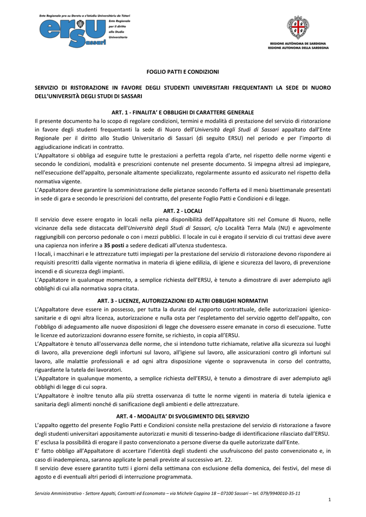 FOGLIO PATTI E CONDIZIONI SERVIZIO DI RISTORAZIONE IN FAVORE DEGLI STUDENTI UNIVERSITARI FREQUENTANTI LA SEDE DI NUORO DELL’UNIVERSITÀ DEGLI STUDI DI SASSARI ART. 1 - FINALITA’ E OBBLIGHI DI CARATTERE GENERALE Il presente documento ha lo scopo di regolare condizioni, termini e modalità di prestazione del servizio di ristorazione in favore degli studenti frequentanti la sede di Nuoro dell’Università degli Studi di Sassari appaltato dall’Ente Regionale per il diritto allo Studio Universitario di Sassari (di seguito ERSU) nel periodo e per l’importo di aggiudicazione indicati in contratto. L’Appaltatore si obbliga ad eseguire tutte le prestazioni a perfetta regola d'arte, nel rispetto delle norme vigenti e secondo le condizioni, modalità e prescrizioni contenute nel presente documento. Si impegna altresì ad impiegare, nell'esecuzione dell'appalto, personale altamente specializzato, regolarmente assunto ed assicurato nel rispetto della normativa vigente. L’Appaltatore deve garantire la somministrazione delle pietanze secondo l’offerta ed il menù bisettimanale presentati in sede di gara e secondo le prescrizioni del contratto, del presente Foglio Patti e Condizioni e di legge. ART. 2 - LOCALI Il servizio deve essere erogato in locali nella piena disponibilità dell’Appaltatore siti nel Comune di Nuoro, nelle vicinanze della sede distaccata dell'Università degli Studi di Sassari, c/o Località Terra Mala (NU) e agevolmente raggiungibili con percorso pedonale o con i mezzi pubblici. Il locale in cui è erogato il servizio di cui trattasi deve avere una capienza non inferire a 35 posti a sedere dedicati all’utenza studentesca. I locali, i macchinari e le attrezzature tutti impiegati per la prestazione del servizio di ristorazione devono rispondere ai requisiti prescritti dalla vigente normativa in materia di igiene edilizia, di igiene e sicurezza del lavoro, di prevenzione incendi e di sicurezza degli impianti. L’Appaltatore in qualunque momento, a semplice richiesta dell’ERSU, è tenuto a dimostrare di aver adempiuto agli obblighi di cui alla normativa sopra citata. ART. 3 - LICENZE, AUTORIZZAZIONI ED ALTRI OBBLIGHI NORMATIVI L’Appaltatore deve essere in possesso, per tutta la durata del rapporto contrattuale, delle autorizzazioni igienicosanitarie e di ogni altra licenza, autorizzazione e nulla osta per I'espletamento del servizio oggetto dell'appalto, con I'obbligo di adeguamento alle nuove disposizioni di legge che dovessero essere emanate in corso di esecuzione. Tutte le licenze ed autorizzazioni dovranno essere fornite, se richiesto, in copia all’ERSU. L’Appaltatore è tenuto all'osservanza delle norme, che si intendono tutte richiamate, relative alla sicurezza sui luoghi di lavoro, alla prevenzione degli infortuni sul lavoro, all'igiene sul lavoro, alle assicurazioni contro gli infortuni sul lavoro, alle malattie professionali e ad ogni altra disposizione vigente o sopravvenuta in corso del contratto, riguardante la tutela dei lavoratori. L’Appaltatore in qualunque momento, a semplice richiesta dell’ERSU, è tenuto a dimostrare di aver adempiuto agli obblighi di legge di cui sopra. L’Appaltatore è inoltre tenuto alla più stretta osservanza di tutte le norme vigenti in materia di tutela igienica e sanitaria degli alimenti nonché di sanificazione degli ambienti e delle attrezzature. ART. 4 - MODALITA’ DI SVOLGIMENTO DEL SERVIZIO L’appalto oggetto del presente Foglio Patti e Condizioni consiste nella prestazione del servizio di ristorazione a favore degli studenti universitari appositamente autorizzati e muniti di tesserino-badge di identificazione rilasciato dall’ERSU. E’ esclusa la possibilità di erogare il pasto convenzionato a persone diverse da quelle autorizzate dall’Ente. E’ fatto obbligo all’Appaltatore di accertare l’identità degli studenti che usufruiscono del pasto convenzionato e, in caso di inadempienza, saranno applicate le penali previste al successivo art. 22. Il servizio deve essere garantito tutti i giorni della settimana con esclusione della domenica, dei festivi, del mese di agosto e di eventuali altri periodi di interruzione programmata. Servizio Amministrativo - Settore Appalti, Contratti ed Economato – via Michele Coppino 18 – 07100 Sassari – tel. 079/9940010-35-11 1 I pasti devono essere consumati nei locali dell’Appaltatore e, pertanto, non è consentito l’asporto degli stessi. L’erogazione del pasto deve essere garantita dalle ore 12,15 alle ore 14,30 per il pranzo e dalle ore 19,30 alle ore 21,15 per la cena. L’Appaltatore si obbliga ad accettare eventuali variazioni di apertura e di funzionamento di orario in base alle disposizioni che l’ERSU può stabilire in relazione alle proprie esigenze e necessità. L’Appaltatore deve garantire lo spazio necessario per il collegamento di un personal computer con monitor, stampante e lettore di badge di proprietà dell’ERSU, necessario per la verifica e contabilizzazione dei passaggi dell’utenza. Il personal computer è collegato in rete con la sede centrale tramite linea di trasmissione dati fornita dall’ERSU. Lo studente avente titolo, previo accertamento a cura dell’Appaltatore, può accedere al servizio mensa convenzionato solo se munito di proprio tesserino-badge, rilasciato dall’ERSU, con credito di pasti. L’Appaltatore provvede al caricamento dei pasti nel tesserino-badge attraverso il software fornito dall’ERSU, riscuotendo le somme dovute dallo studente in relazione al numero di pasti acquistati ed alla fascia tariffaria applicata. Per gli studenti in possesso di tessera mensa provvista di credito di pasti, gratuiti o precedentemente acquistati, l’Appaltatore provvede a scalare il pasto al momento del consumo tramite l’utilizzo dello stesso software. Prima dell’avvio del servizio è fornita adeguata formazione, da parte di personale tecnico, sul corretto utilizzo del software di gestione messo a disposizione. Nell’