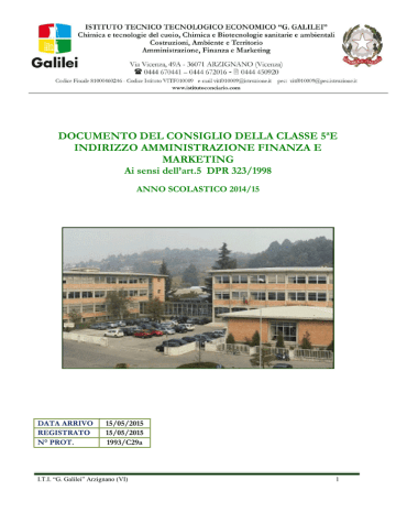 Documento Consiglio di Classe 5°E DOCUMENTO DEL CONSIGLIO DELLA CLASSE 5ªE INDIRIZZO AMMINISTRAZIONE FINANZA E MARKETING Ai sensi dell’art.5 DPR 323/1998 ANNO SCOLASTICO 2014/15 DATA ARRIVO REGISTRATO N° PROT. 15/05/2015 15/05/2015 1993/C29a I.T.I. “G. Galilei” Arzignano (VI) 1 Documento Consiglio di Classe 5°E INDICE 1. Composizione del Consiglio di classe 2. Composizione e presentazione della classe 2.1 Elenco studenti 2.2 Profilo della classe 2.3 Provenienza 3. Obiettivi comuni e trasversali conseguiti 3.1Obiettivi educativi 3.2Obiettivi formativo- didattici 3.3Individuazione di fasce di livello riguardanti gli obiettivi educativi e formativo -didattici 3.4Individuazione di fasce di livello riguardanti gli obiettivi disciplinari 3.5Giudizio complessivo 4. Attività nell’area professionalizzante 4.1 Attività di orientamento in uscita 4.2 Progetti ed incontri vari 4.3 Viaggio di istruzione 4.4 Corsi di recupero/approfondimento 5. Modalità operative 5.1 CLIL 6. Strumenti didattici 7. Spazi operativi 8. Indicazioni per la terza prova 9. Criteri e strumenti di valutazione 9.1Criteri di valutazione 9.2Strumenti di verifica 9.3Credito scolastico 9.4Tabella di valutazione e griglia di valutazione per tipologie specifiche 10. Programmi e relazioni finali per singola disciplina 11. Individuazione delle aree disciplinari I.T.I. “G. Galilei” Arzignano (VI) 2 Documento Consiglio di Classe 5°E ALLEGATI Allegato 9.4.1: Tabella di valutazione di Istituto Allegato 9.4.2: Griglia di valutazione della prima prova Allegato 9.4.3: Griglia di valutazione della seconda prova Allegato 9.4.4: Griglia di valutazione della terza prova scritta Allegato 9.4.5: Griglia di valutazione - Colloquio Allegato 9.4.6: Testi della simulazione della prima prova (scritto di Italiano) Allegato 9.4.7: Testo simulazione della seconda prova (Economia aziendale) Allegato 9.4 8: Testi simulazione della terza prova ALLEGATI: PROGRAMMI E RELAZIONI FINALI PER SINGOLA DISCIPLINA Allegato 10.1: Religione Allegato 10.2: Italiano Allegato 10.3: Storia Allegato 10.4: Matematica Allegato 10.5: Inglese Allegato 10.6: Spagnolo Allegato 10.7: Diritto-economia politica Allegato 10.8: Economiaaziendale Allegato 10.9: Scienze motorie I.T.I. “G. Galilei” Arzignano (VI) 3 Documento Consiglio di Classe 5°E 1. COMPOSIZIONE DEL CONSIGLIO DI CLASSE Discipline Ore settimanali Insegnanti Lettere italiane 4 Prof.ssa Menti Marina Storia 2 Prof.ssa Menti Marina Matematica 3 Prof.ssa Priante Loredana Inglese 3 Prof.ssa Damo Gianna Spagnolo 3 Prof.ssa Bruno Emanuela Diritto 3 Prof.ssa Fiasconaro Anna Economia Politica 3 Prof.ssa Fiasconaro Anna Economia Aziendale 8 Prof. Scienze motorie 2 Prof. Cabianca Giovanni Religione cattolica 1 Prof.ssa Randon Michela 2. Marchesini Ezio COMPOSIZIONE E PRESENTAZIONE DELLA CLASSE Numero studenti: 21(12 maschi e 9 femmine) − Promozioni dalla classe precedente: 22/25 − Ritirati durante l’anno scolastico: 1 2.1 N° 1 2 3 4 5 6 7 8 9 10 11 Elenco degli studenti STUDENTE BETTEGA ANDREA BOCCHESE GIOVANNI BOSCHETTO MARTINA BRUTTOMESSO MICHELE BUSELLATO MARIO CHANDER OSCAR CRACCO JESSICA DAL GRANDE ANDREA DALLA VERDE ANDREA DE SANCTIS SARA FOCHESATO DAVIDE N° 12 13 14 15 16 17 18 19 20 21 STUDENTE KRCMAREVIC FILIP MARCHESINI NICOLO’ MIAZZO AURORA MOLON ANNA NORI FEDERICA PASQUALE DILETTA PELLIZZARI AIRIN PLATINI SEBASTIANO PRETO SIMONE VOLPIANA VALENTINA 2.2 Profilo della classe La classe 5 E è composta da 21 allievi: la maggior parte ha avuto un corso di studi regolare nel quinquennio, tranne qualcuno che ha ripetuto e /o è arrivato da altro istituto nel quarto anno di corso. Quasi tutte le famiglie hanno partecipato regolarmente alla vita scolastica; si sono tenuti incontri con i genitori secondo il calendario stabilito e la collaborazione è stata buona. I cambiamenti all’interno del corpo docente non sono stati frequenti e nelle discipline è stata assicurata la continuità didattica ,in particolare in inglese e spagnolo. Si riporta di seguito una tabella con i vari docenti che si sono susseguiti nel corso del triennio di indirizzo. I.T.I. “G. Galilei” Arzignano (VI) 4 Documento Consiglio di Classe 5°E Discipline 3ªE (a.s. 2012/13) Insegnanti 4ªE (a.s. 2013/14) Religione Randon Michela Randon Michela Randon Michela Lettere italiane BoschettiGiorgio Menti Marina Menti Marina Storia Boschetti Giorgio Menti Marina Menti Marina Matematica Priante Loredana Priante Loredana Priante Loredana Informatica Antoci Veronica Zannol Barbara / Inglese Damo Gianna Damo Gianna Damo Gianna Spagnolo Bruno Emanuela Bruno Emanuela Bruno Emanuela Diritto Calligaris Mara Fiasconaro Anna Fiasconaro Anna Economia politica Calligaris Mara Fiasconaro Anna Fiasconaro Anna Economia aziendale Frighetto Giordano Marchesini Ezio Marchesini Ezio Scienze motorie Cabianca Giovanni Cabianca Giovanni Cabianca Giovanni 5ªE (a.s. 2014/15) Le principali lacune riscontrate nella preparazione degli studenti si sono registrate in ambito matematico ed in economia aziendale, ma anche in lingua straniera. Nella materia di indirizzo, ma non solo, sono stati rivolti agli alunni corsi per il recupero delle carenze formative . Il comportamento degli allievi è stato generalmente corretto e rispettoso e la partecipazione al dialogo educativo è stata buona da parte della maggioranza della classe, con interventi e riflessioni efficaci anche su tematiche di attualità. Un gruppo di studenti si è applicato allo studio con maggiore impegno non solo in classe, ma anche con i compiti a casa, mentre qualche altro alunno ha manifestato un interesse ed una motivazione superficiali o discontinui. Nell’insieme, dunque, la classe costituisce un gruppo eterogeneo per quanto concerne conoscenze, competenze e capacità, che in alcuni risultano ottime o buone, per un buon gruppo sufficienti o discrete, per un numero ristretto non sempre sicure o solo mnemoniche . Pertanto, anche il profitto risulta differenziato con alunni che presentano un r