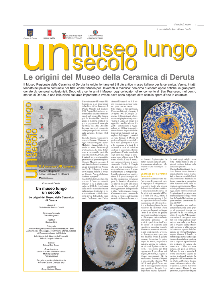 Giornale di mostra 1 A cura di Giulio Busti e Franco Cocchi Le origini del Museo della Ceramica di Deruta II Museo Regionale della Ceramica di Deruta ha origini lontane ed è il più antico museo italiano per la ceramica. Venne, infatti, fondato nel palazzo comunale nel 1898 come “Museo per i lavoranti in maiolica” con circa duecento opere antiche, in gran parte, donate da generosi collezionisti. Dopo oltre cento anni il Museo, oggi collocato nell’ex convento di San Francesco nel centro storico di Deruta, è una istituzione culturale importante e vivace dove sono esposte oltre seimila opere d’arte in ceramica. Comune di Deruta Un museo lungo un secolo Le origini del Museo della Ceramica di Deruta A cura di Giulio Busti e Franco Cocchi Ricerche d’archivio Clara Menganna Restauri Clarissa Sirci Fotografie Archivio Fotografico della Soprintendenza per i Beni Architettonici, il Paesaggio, il Patrimonio Storico, Artistico ed Etnoantropologico dell’Umbria Italo Margaritelli, Giampaolo Pimpinelli, Marsilio Magnini - Deruta Grafica Futura Soc. Coop. Organizzazione Ufficio cultura Comune di Deruta Michele Montanari Fabrizio Abbati Progetto e grafica di allestimento Rosaria Catana, Clarissa Sirci Segreteria Coop. Sistema Museo L’atto di nascita del Museo della Ceramica sta in un altare laterale della chiesa di San Francesco di Deruta. Quando, nel dicembre 1899, Angelo Micheletti stava per terminarne il restauro commissionatogli dal priore della Compagnia del Rosario, ebbe l’idea di sigillarvi le memorie, scritte di pugno su pergamena, di una stagione intensa che, a fine Ottocento, lo aveva visto tra i protagonisti della ripresa produttiva e artistica della ceramica derutese (Bolli 1992). In quella stagione aveva preso vita anche il museo. “Il dottore in legge Francesco Briganti – scrisse Micheletti – ha avuto l’idea di costruire un museo da servire agli artisti derutesi, alla storia dell’arte ed al decoro della patria illustre delle majoliche, Deruta. A tale lodevole impresa mi associai io, promotore del primo risveglio ed Alpinolo Magnini con copie di vasi ritratti in Roma dove ora studia ed altri simili lavori, Alessandro Piceller di Perugia, il professor Giuseppe Bellucci, il professor Eugenio Aruch ed altri con doni non ispregevoli”. Angelo Micheletti1, medico della condotta di Deruta ma artista dilettante2, si era in effetti dedicato fin dal 1893 alla riproduzione delle antiche maioliche derutesi, nella speranza di stimolare le coscienze dei vasai e di indurli verso la ripresa delle antiche tradizioni. Finalmente, con l’istitu- zione del Museo di cui fu il primo conservatore, poteva vederne i primi concreti risultati. Sulle origini e lo stato del museo, Francesco Briganti3 relazionò, il 30 agosto 1903, al Consiglio Comunale di Deruta in cui, all’epoca era tra i più giovani esponenti: “Esiste in Deruta un museo. Gli oggetti ivi raccolti – afferma Briganti – cominciarono a raggranellarsi nel 1898 ed io stesso insieme al dottor Angelo Micheletti cercai vari frammenti e di raccogliere degli oggetti posseduti da varie famiglie di Deruta. Il professor Magnini trovavasi allora in Roma per ragioni di studio e lo pregammo d’inviarci degli acquerelli e copie di maioliche esistenti in quei musei. Rispose gentilmente all’invito mandando degli splendidi disegni e continuò sempre ad interessarsi della nostra raccolta. L’idea di un museo piacque moltissimo al signor Alessandro Piceller di Perugia che con rara munificenza donò un grandissimo numero di oggetti che formano la parte principale dei lavori sino ad ora messi insieme. E di più ci onorò più volte della sua presenza portandoci pure dei forestieri ed acquistando i lavori dei nostri fabbricanti che ricevettero da lui consigli ed incoraggiamento. Indispensabile è infine l’utilità di questo museo. Con esso veniamo a conoscere la storia e lo sviluppo dell’industria ceramica in Deruta: diamo ai no- stri lavoranti degli esemplari da imitare e questi esemplari gloriosi saranno uno stimolo per i fabbricanti ed una réclame per i visitatori”4. Un museo per i lavoranti in maiolica L’istituzione del museo era, nell’intenzione dei promotori, parte di un progetto di sviluppo socioeconomico legato alla ripresa delle antiche tradizioni maiolicare che aveva animato Deruta fin dai primi anni successivi all’Unità d’Italia. Nel 1872, infatti, il Comune aveva promosso la Prima esposizione industriale di Deruta riservata alle fabbriche locali, e, volendo migliorare la preparazione dei lavoratori aveva istituito una borsa di studio per l’invio di un allievo in qualche importante manifattura nazionale “allo scopo – così recita la deliberazione comunale – di istruirsi e perfezionarsi nell’arte del vasaio”. In occasione della esposizione industriale fu anche allestita una mostra di arte antica con venti maioliche d’epoca, per la maggior parte avute prestito da alcuni privati. È qui che possono rintracciarsi le prime origini del Museo, sia poiché le maioliche esposte ne costituirono, più tardi, il primo nucleo sia perché l’esperienza del 1872 rappresentò il precedente cui Briganti, Micheletti, e Magnini si rifecero espressamente. Ne da atto lo stesso Francesco Briganti in un passo della relazione: “Nel 1872 il municipio di Deruta a titolo di incoraggiamento indisse una esposizione, la quale dette degli ottimi risultati e piacereb- be a voi, egregi colleghi che ne foste i nobili iniziatori, che noi giovani vogliamo imitarvi nelle condizioni presenti”. Questa pluralità di intenti che vedono il museo rivolto sia verso la documentazione storico-ceramologica, sia verso un utilità didattica e promozionale diretta allo sviluppo economico e produttivo, sono richiamati anche nella sua originaria denominazione. Museo artistico pei lavoranti in maiolica si legge, infatti, sul frontespizio dell’originario catalogo redatto, con apprezzabile metodologia scientifica, da Angelo Micheletti non app