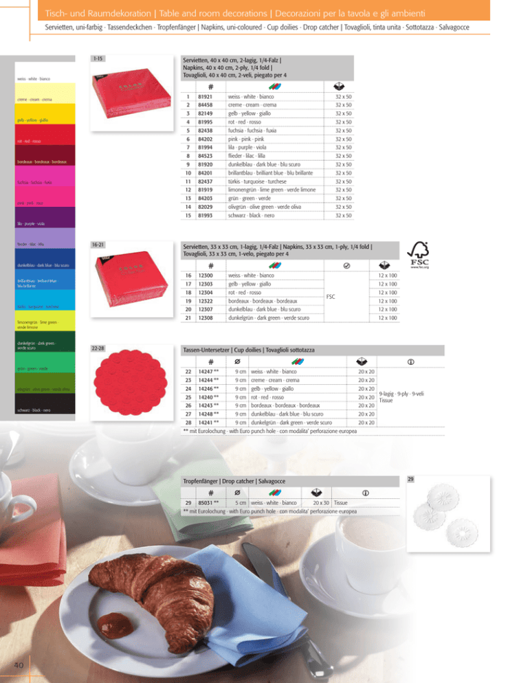 Tisch- und Raumdekoration | Table and room decorations | Decorazioni per la tavola e gli ambienti Servietten, uni-farbig · Tassendeckchen · Tropfenfänger | Napkins, uni-coloured · Cup doilies · Drop catcher | Tovaglioli, tinta unita · Sottotazza · Salvagocce 1-15 weiss · white · bianco Servietten, 40 x 40 cm, 2-lagig, 1/4-Falz | Napkins, 40 x 40 cm, 2-ply, 1/4 fold | Tovaglioli, 40 x 40 cm, 2-veli, piegato per 4 1 2 3 4 5 6 7 8 9 10 11 12 13 14 15 creme · cream · crema gelb · yellow · giallo rot · red · rosso bordeaux · bordeaux · bordeaux fuchsia · fuchsia · fuxia pink · pink · rosa 81921 84458 82149 81995 82438 84202 81994 84523 81920 84201 82437 81919 84203 82029 81993 weiss · white · bianco creme · cream · crema gelb · yellow · giallo rot · red · rosso fuchsia · fuchsia · fuxia pink · pink · pink lila · purple · viola flieder · lilac · lilla dunkelblau · dark blue · blu scuro brillantblau · brilliant blue · blu brillante türkis · turquoise · turchese limonengrün · lime green · verde limone grün · green · verde olivgrün · olive green · verde oliva schwarz · black · nero 32 x 50 32 x 50 32 x 50 32 x 50 32 x 50 32 x 50 32 x 50 32 x 50 32 x 50 32 x 50 32 x 50 32 x 50 32 x 50 32 x 50 32 x 50 lila · purple · viola flieder · lilac · lilla 16-21 Servietten, 33 x 33 cm, 1-lagig, 1/4-Falz | Napkins, 33 x 33 cm, 1-ply, 1/4 fold | Tovaglioli, 33 x 33 cm, 1-velo, piegato per 4 dunkelblau · dark blue · blu scuro 16 17 18 19 20 21 brillantblau · brilliant blue · blu brillante türkis · turquoise · turchese limonengrün · lime green · verde limone dunkelgrün · dark green · verde scuro grün · green · verde olivgrün · olive green · verde oliva schwarz · black · nero 22-28 12300 12303 12304 12322 12307 12308 weiss · white · bianco gelb · yellow · giallo rot · red · rosso bordeaux · bordeaux · bordeaux dunkelblau · dark blue · blu scuro dunkelgrün · dark green · verde scuro FSC Tassen-Untersetzer | Cup doilies | Tovaglioli sottotazza 22 14247 ** 9 cm weiss · white · bianco 20 x 20 23 14244 ** 9 cm creme · cream · crema 20 x 20 24 14246 ** 9 cm gelb · yellow · giallo 20 x 20 9-lagig · 9-ply · 9-veli 25 14240 ** 9 cm rot · red · rosso 20 x 20 Tissue 26 14243 ** 9 cm bordeaux · bordeaux · bordeaux 20 x 20 27 14248 ** 9 cm dunkelblau · dark blue · blu scuro 20 x 20 28 14241 ** 9 cm dunkelgrün · dark green · verde scuro 20 x 20 ** mit Eurolochung · with Euro punch hole · con modalita’ perforazione europea Tropfenfänger | Drop catcher | Salvagocce 29 85031 ** 5 cm weiss · white · bianco 20 x 30 Tissue ** mit Eurolochung · with Euro punch hole · con modalita’ perforazione europea 40 12 x 100 12 x 100 12 x 100 12 x 100 12 x 100 12 x 100 29