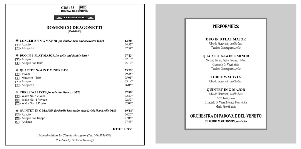 CDS 133 DDD DIGITAL RECORDING DYNAMIC PERFORMERS: DOMENICO DRAGONETTI (1763-1846) ❖ 1 2 ❖ 3 4 ❖ 5 6 7 8 ❖ 9 10 11 ❖ 12 13 14 DUO IN B FLAT MAJOR Ubaldo Fioravanti, double-bass Teodora Campagnaro, cello CONCERTO IN G MAJOR for double-bass and orchestra D290 - Adagio - Allegretto 12'30" 04'52" 07'34" DUO IN B FLAT MAJOR for cello and double-bass* - Adagio - Allegro non tanto 07'23" 02'10" 05'12" QUARTET No.4 IN E MINOR D350 - Vivace - Minuetto - Trio - Adagio - Allegretto 23'59" 09'25" 05'01" 03'19" 06'05" THREE WALTZES for solo double-bass D370 - Waltz No.7 Vivace - Waltz No.11 Vivace - Waltz No.12 Presto 07'48" 02'49" 02'52" 02'07" QUINTET IN G MAJOR Ubaldo Fioravanti, double-bass Piero Toso, violin Giancarlo Di Vacri, Monica Tosi, violas Mario Finotti, cello QUINTET IN G MAJOR for double-bass, violin, viola I, viola II and cello D180 - Adagio - Allegro non troppo - Andante 19'18" 04'26" 07'05" 07'43" ORCHESTRA DI PADOVA E DEL VENETO ➤TOT: 71'45" Printed editions by Claudio Martignon (Tel. 041-5731470) (* Edited by Bertram Turetzkj) QUARTET No.4 IN E MINOR Stefano Furini, Pietro Juvarra, violins Giancarlo Di Vacri, viola Teodora Campagnaro, cello THREE WALTZES Ubaldo Fioravanti, double-bass CLAUDIO MARTIGNON, conductor CDS 133 DDD DIGITAL RECORDING DYNAMIC PERFORMERS: DOMENICO DRAGONETTI (1763-1846) ❖ 1 2 ❖ 3 4 ❖ 5 6 7 8 ❖ 9 10 11 ❖ 12 13 14 DUO IN B FLAT MAJOR Ubaldo Fioravanti, double-bass Teodora Campagnaro, cello CONCERTO IN G MAJOR for double-bass and orchestra D290 - Adagio - Allegretto 12'30" 04'52" 07'34" DUO IN B FLAT MAJOR for cello and double-bass* - Adagio - Allegro non tanto 07'23" 02'10" 05'12" QUARTET No.4 IN E MINOR D350 - Vivace - Minuetto - Trio - Adagio - Allegretto 23'59" 09'25" 05'01" 03'19" 06'05" THREE WALTZES for solo double-bass D370 - Waltz No.7 Vivace - Waltz No.11 Vivace - Waltz No.12 Presto 07'48" 02'49" 02'52" 02'07" QUINTET IN G MAJOR Ubaldo Fioravanti, double-bass Piero Toso, violin Giancarlo Di Vacri, Monica Tosi, violas Mario Finotti, cello QUINTET IN G MAJOR for double-bass, violin, viola I, viola II and cello D180 - Adagio - Allegro non troppo - Andante 19'18" 04'26" 07'05" 07'43" ORCHESTRA DI PADOVA E DEL VENETO ➤TOT: 71'45" Printed editions by Claudio Martignon (Tel. 041-5731470) (* Edited by Bertram Turetzkj) QUARTET No.4 IN E MINOR Stefano Furini, Pietro Juvarra, violins Giancarlo Di Vacri, viola Teodora Campagnaro, cello THREE WALTZES Ubaldo Fioravanti, double-bass CLAUDIO MARTIGNON, conductor DOMENICO DRAGONETTI (1763-1846) COMPOSIZIONI PER CONTRABBASSO Jolanda Dalla Vecchia " S e nominate Domenico Dragonetti a un contrabbassista potete essere sicuri di richiamare alla mente gli aneddoti delle bambole, della parsimonia e della virtuosità sconcertante." Così inizia l'articolo pubblicato su «The Strad» del febbraio '95, dove Fiona Palmer offre una sintesi della sua tesi di laurea sul celebre musicista, discussa presso l'università di Birmingham nel 1993. Nonostante l'intenzione della studiosa sia inquadrare in una dimensione storica più obiettiva la figura di Dragonetti, il brano citato si sofferma sulle memorie e sui racconti dei contemporanei londinesi; di Lindley Nunn, ad esempio, riporta il passo dove Dragonetti viene scoperto a letto con ancora indosso il completo da concerto della sera prima, gioielleria compresa. Le sue stanze in affitto nella illustre Leicester Square erano un'impressionante accozzaglia di libri, musiche, giocattoli, tabacchiere, quadri (Rossini lo definì un competente in materia), strumenti musicali (tra i quali tre antichi contrabbassi di Gasparo da Salò, due dei quali ancor oggi conservati a Venezia e al South Kensington Museum), e la celeberrima collezione di bambole in dimensione reale: le descrizioni fatte dai suoi amici e frequentatori sono talmente precise da autorizzare l'identificazione della bambola nera oggi conservata al Royal College of Music di Londra con «Blackie», la sua preferita. Per la dimensione più musicale, l'articolo riporta alcuni resoconti d'epoca sulle sue straordinarie esecuzioni, sia solistiche che orchestrali o da 4 camera. Soprannominato «the Dragon of Double bass» (e così lo ritrae una caricatura dell'epoca), Dragonetti fu paragonato a un Giove scagliante tuoni e fulmini, ad un leone addomesticato ma ancora fiero e potente, o ad un pastore che riconduce le pecorelle smarrite all'ovile, quando con la sua determinatezza riportava all'ordine l'orchestra errante (forse confusa dai ripetitivi ritornelli presenti nelle sue composizioni, spesso strutturate come tema con variazioni per il contrabbasso obbligato). Tutto ciò è estremamente interessante, ma manca l'immagine «a tutto tondo» dell'artista e del compositore; c'è semmai la testimonianza di una profonda impressione lasciata in un ambiente italobritannico nella prima metà del XIX secolo da un virtuoso senza precedenti. Egli infatti seppe sviluppare enormemente la tecnica e le possibilità sonore del contrabbasso: alcuni suoi difficili passaggi, tali da richiedere un'abilità inimitabile, sono diventati famosi al punto da essere citati tali e quali in opere posteriori di Cimador e di Capuzzi, come gioielli senza tempo incastonati in una filigrana nuova. A lui si devono inoltre due invenzioni precise: l'arco «alla Dragonetti» oggi sopravvissuto solo in certi paesi e solo per l'impugnatura, e l'innalzamento del ponticello. Utilizzò strumenti a tre o quattro corde, accordati perlopiù per quarte, e in base alla sua accordatura intonava l'orchestra. Per comprendere il «Dragonetti-uomo», invece, dobbiamo affidarci alla biografia ufficiale. Domenico Carlo Maria Dragonetti nacque a Venezia, presso la parrocchia di S. Trovaso il 7 aprile 1763; i genitori Pietro Dragonetti e Caterina Callegari erano di modesta estrazione sociale - il padre fu probabilmente un barbiere - ma abbastanza accorti da avviarlo ben presto allo studio prima del violino e poi del contrabbasso con il primo contrabbassista della Capp