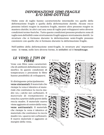 DEFORMAZIONE SEMI-FRAGILE E/O SEMI-DUTTILE Molte zone di taglio hanno caratteristiche intermedie tra quelle della deformazione fragile e quella della deformazione duttile. Alcune rocce possono infatti reagire in maniera fragile, mentre altre possono reagire in maniera duttile; in altri casi una zona di taglio può svilupparsi sotto diverse condizioni termo-bariche. Tutte queste condizioni possono produrre zone di taglio non definibili come strettamente fragili oppure strettamente duttili. Le strutture che si formano durante la deformazione semi-fragile possono coesistere con quelle che si formano durante la deformazione fragile. Nell’ambito della deformazione semi-fragile, le strutture piu' importanti sono le v e n e e, nelle loro diverse forme, le stiloliti ed il boudinage boudinage. LE VENE: I TIPI DI FIBRE Vene con fibre sono caratteristiche di ambienti debolmente metamorfici. In queste condizioni di temperatura e pressione le fibre hanno possibilità di svilupparsi. Si distinguono principalmente: sintassiali: Il materiale che vene sintassiali riempe la vena é identico al materiale che costituisce la roccia madre (es.: calcite nei carbonati). Il materiale di riempimento si enuclea a partire dalle pareti della roccia madre. Il materiale nuovo viene aggiunto al centro della vena. vene antitassiali: Il materiale che riempe la vena é identico al materiale che costituisce la roccia madre (es.: quarzo nei carbonati). Il nuovo materiale é aggiunto ai margini della vena. LA DEFORMAZIONE SEMI-FRAGILE: LE VENE Si formano quando le discintinuità meccaniche vengono riempite di minerali che precipatono da un fluido. Questo avviene qualora le condizioni termiche e bariche siano favorevoli. Le modalità di riempimento della vena ci permettono di avere indicazioni sulla storia della discontinuità meccanica. Si distinguono vene su superfici di taglio e vene di estensione. VENE SU SUPERFICI DI TAGLIO La superficie di faglia non é mai piana e regolare e generalmente presenta delle asperità. Il movimento relativo del tetto rispetto al muro determina quindi dei piccoli vuoti nei quali il fluido può circolare e depositare i minerali; se il movimento relativo é sufficientemente lento, i minerali di neoformazione si orientano dando oribre rre e disposte secondo la gine a f i b direzione del movimento relativo dei blocchi. Il senso di taglio invece si determina vedendo il senso dei gradini del minerale. I gradini si scendono sempre. Eventuali inclusioni fluide poste all’interno delle vene possono dare indicazioni sulla temperatura e sulla pressione esistente al momento della deposizione. VENE DI ESTENSIONE Costituiscono il riempimento di fratture di estensione. Queste ultime si dispongono perpendicolarmente alla direzione di massima estensione e parallelamente alla direzione di massima compressione. Il minerale che si deposita dentro la vena, é spesso fibroso. Le fibre si sviluppano secondo la direzione di massima estensione. E’ importante ricordarsi che la curvatura dei minerali all’interno delle vene di estensione é un’effetto della variazione del campo di stress e non una conseguenza della deformazione dei minerali nella vena. Si riconosce in sezione sottile perché le proprietà ottiche non cambiano con il cambiamento di direzione di crescita del minerale. TENSION GASHES Si sviluppano sempre perpendicolarmente alla direzione di massima estensione e parallelamente alla direzione di massima compressione. Essendo vene all’interno di una zona di taglio, sono quindi disposte a 45° rispetto alla direzione del taglio. Si presentano disposte en echelon. Sono definite come tension gashes . Poiché lo sviluppo delle vene richiede condizioni termo-bariche leggermente superiori a quelle tipiche dellq sola fratturazione, esse sono ritenute appartenere alla defromazione semi-fragile. notare che la zona deformata si allarga via via che la deformazione procede. Questo perché la terminazione delle vecchie vene costituisce un luogo preferenziale dell’accumulo di stress; basta adesso una minor quantità di forza per far procedere la deformazione. Le nuove vene mantengono la stessa dimensione delle vene inizialmente formatesi STILOLITI DI ORIGINE TETTONICA Si sviluppano in rocce calcaree. L’aumento della pressione favorisce la dissoluzione della matrice costituita da carbonato di calcio. L’aumento della pressione può essere legato a fenomeni tettonici oppure anche al carico sedimentario (stiloliti diagenetiche): in questo caso però le stiloliti sono parallele alla stratificazione. La stilolite nella roccia costituisce una ‘cicatrice’ che ha forma articolata, con picchi ed avvallamenti. Le stiloliti si formano ortogonali alla direzione di massima compressione e dimostrano una caratteristica forma dentata. I picchi delle stiloliti sono paralleli alla direzione di massima compressione. Spesso asssociate alle stilolite si formano vene di estensione, parallele alla direzione di massimo raccorciamento e perpendicolari alla direzione di massima estensione. In una zona di taglio abbiamo stiloliti con immersione opposta a quelle delle vene en echelon. La percentuale di materiale andain dissoluzione può essere valutaconsiderando il rapporto to ta quantitativo fra gli elementi insolubili presenti nei domini (Q) compresi fra due superfici di clivaggio (P) e gli stessi elementi presenti nelle superfici di clivaggio. Affinchè il fenomeno didissoluzione abbia luogo, è necessario che le molecole di acqua siano chimicamente legate agli ioni dei granuli. I fluidi che derivano dalla dissoluzione, migrano verso le zone dove lo stress compressivo è meno efficiente, verso le porosità della roccia e verso le vene, uscendo quindi dal sistema. CLIVAGGIO STILOLITICO E STRUTTURE S/C In zone di taglio é abbastanza comune lo sviluppo di una foliazione che si dispone a circa 45° rispetto al taglio principale e che assume una geometria sigmoidale. L’angolo acuto che questa foliazione forma con la superficie di