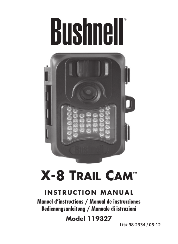 X-8 TRAIL CAM ™ INSTRUCTION MANUAL Manuel d’instructions / Manual de instrucciones Bedienungsanleitung / Manuale di istruzioni Model 119327 Lit# 98-2334 / 05-12 TABLE OF CONTENTS PAGE ENGLISH 3-26 Français 27-51 Español 52-76 Deutsch 77-102 ITALIANO 103-126 English Page Index IMPORTANT NOTE 4 Introduction 5 Parts & Controls Guide 6-7 Battery and SD Card Installation 8 About the Setup Menu 9 Using the Setup Menu 9 SETUP MENU REFERENCE TABLE 10-12 Time Lapse Operation13 Camera Operation15 Mount the Camera15 Power on the Camera 15 Set the PIR and Shutter Switches 16 Test the Coverage Area 16 Secure the Camera16 (Optional) Using an External Power Source 17 Viewing the Photos and Videos 17 Glossary18 Technical Specifications 19 Troubleshooting/FAQ 20-23 Warranty24 IMPORTANT NOTE Congratulations on your purchase of one of the best trail cameras on the market! Bushnell is very proud of this camera and we are sure you will be pleased with yours as well. We appreciate your business and want to earn your trust. Please refer to the notes below and the instructions in this manual to ensure that you are completely satisfied with this product. If your Bushnell Trail Cam does not seem to be functioning properly or if you are having photo/video quality issues, please check the Troubleshooting/FAQ section on pages 20-23. Problems are often due to something simple that was overlooked, or require only changing one setting to solve. If your problem continues after trying the solutions in the Troubleshooting/FAQ section, please call Bushnell Customer Service at (800) 423-3537. In Canada, call (800) 361-5702. Bushnell recommends using 8 Energizer® Lithium AA batteries in this Trail Cam to obtain maximum battery life. Do Not Mix Old and New Batteries Do not mix battery types-use ALL lithium or ALL alkaline. Rechargeable batteries are not recommended. Bushnell recommends using SanDisk® SD and SDHC Cards (up to 32GB capacity) in this Trail Cam. 4 INTRODUCTION Congratulations on your purchase of a Bushnell X-8 Digital Trail Camera. This camera is designed to record animal activity in the outdoors with its still image and movie modes and weatherproof, rugged construction. Your X-8 Trail Cam features a compact, portable size and an extra long battery life. Main Features: • 2.0MP digital sensor • Compact Size (120mm*94mm*46mm) • Long Battery Life (Up to 9 months) • Trigger Time=1.0 seconds or less • Automatic IR Filter • LCD Display • 36 Night Vision LEDs • Adjustable Photo Delay: 1~ 59 seconds ,1~ 10mins (default 10S) • Multiple Shot Mode (3 images per trigger) • 640*480 at 30 FPS Videos, 5 -15 seconds ea. • Adjustable PIR Sensitivity (Lo, Med, Hi) • Time-Lapse mode captures images at user set interval (1-60 min) • Supports up to 32 GB SD Card • Date, Time & Moon Phase Imprint • Auto Exposure • Auto White Balance • Power Supply: 4 or 8 AA batteries (lithium or alkaline), DC input jack for 6 volt external power source (optional, user supplied). • Mounting Socket for Standard Tripods • Weatherproof • User selectable shutter speed to reduce blur or adjust exposure 5 Parts and Controls Guide PIR Motion Sensor Camera Lens Padlock Hole PIR Indicator (Setup Mode Only) Infrared LED Array Tripod Socket Front of Camera (DC Power In Jack under rubber pad) DC Input Jack 6 Parts and Controls Guide Ok Button SD Card Slot Control Panel (Front Opened) LCD Display Up Button PIR Sensitivity Switch USB Port TV Out Power Switch Setup Button Battery Compartment Down Button Shutter Speed Switch Left Side Panel (Front Opened) USB Port TV Out 7 BATTERY and SD CARD INSTALLATION The Bushnell X-8 Digital Trail Camera is designed to operate using 4 or 8 AA batteries. We recommend using a full set of 8 Lithium (for longest life) or Alkaline batteries. NOTE: Always set the power switch to the Off position when installing or removing batteries. Please make sure the batteries are inserted correctly, as indicated inside the battery compartment. Incorrect voltage or polarity (+/-) will damage the camera. The battery level meter on the top right of the display will indicate when the internal batteries are low. Do not mix old and new batteries. Do not mix battery types-use ALL lithium or ALL alkaline. Rechargeable batteries are not recommended. Memory Your X-8 Digital Trail Camera has a memory card slot, to accept SD cards (sold separately) up to 32GB maximum capacity. If no SD card is inserted, the display will flash “NOSD”, and the camera will not operate. Inserting an SD card • Make sure the power switch is in the Off position whenever adding or removing memory. • Insert an SD card into the card slot completely and oriented correctly as shown by the icon above the slot (label up, contacts facing down and notched corner on the right). • To remove the SD memory card, depress the SD card and pull out the card gently. Using a new, blank SD card is recommended. If the SD card has been used in another device, please make sure to format using the Format option in the X-8 trail cam’s Setup menu before you set the camera to capture photos/videos. New cards are ready to use straight from the package. 8 ABOUT THE SETUP MENU Slide the power switch to the On position. You’ll see “WAIT” on the display, then the Setup Menu screen (see below). Before you start using the camera, you’ll no doubt want to set the date/time so they are imprinted correctly on your photos, and maybe change the trigger delay time and image resolution to your preferences. This is done by editing the settings of an item listed in the Setup Menu. To enter the Setup Menu at any time, press the Setup button (far left side of the control panel). USING THE SETUP MENU The Setup Menu has 5 different items, which appear on a list in the left frame of the display. Here’s how to edit (change) the setting of a menu item: 1. Select the menu item you want to edit by pressing the Up or Down button until the item is blinking. Note: you