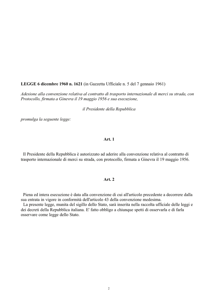 LEGGE 6 dicembre 1960 n. 1621 (in Gazzetta Ufficiale n. 5 del 7 gennaio 1961) Adesione alla convenzione relativa al contratto di trasporto internazionale di merci su strada, con Protocollo, firmata a Ginevra il 19 maggio 1956 e sua esecuzione, il Presidente della Repubblica promulga la seguente legge: Art. 1 Il Presidente della Repubblica è autorizzato ad aderire alla convenzione relativa al contratto di trasporto internazionale di merci su strada, con protocollo, firmata a Ginevra il 19 maggio 1956. Art. 2 Piena ed intera esecuzione è data alla convenzione di cui all'articolo precedente a decorrere dalla sua entrata in vigore in conformità dell'articolo 43 della convenzione medesima. La presente legge, munita del sigillo dello Stato, sarà inserita nella raccolta ufficiale delle leggi e dei decreti della Repubblica italiana. E' fatto obbligo a chiunque spetti di osservarla e di farla osservare come legge dello Stato. 2 TESTO COORDINATO DELLA CONVENZIONE DEL 1956 CON LA MODIFICA DEL 1978 Traduzione non ufficiale della convenzione Preambolo Le parti contraenti, Riconosciuta l'utilità di regolare in modo uniforme le condizioni del contratto di trasporto internazionale di merci su strada, specie per quanto concerne i documenti utilizzati per questo trasporto e la responsabilità del vettore, Hanno convenuto quanto segue: CAPO I Campo d'applicazione Art. 1 1. La presente convenzione si applica ad ogni contratto per il trasporto a titolo oneroso di merci su strada per mezzo di veicoli indipendentemente dal domicilio e dalla cittadinanza delle parti, quando il luogo di ricevimento della merce e il luogo previsto per la riconsegna indicati nel contratto sono situati in due Paesi diversi, di cui almeno uno sia parte della convenzione. 2. Ai fini dell'applicazione della presente Convenzione si considerano "veicoli" gli autoveicoli, i veicoli articolati, i rimorchi ed i semirimorchi quali sono definiti nell'articolo 4 della convenzione per la circolazione stradale del 19 settembre 1949. 3. La presente convenzione si applica anche quando i trasporti da essa previsti sono effettuati dagli Stati o dalle istituzioni o dagli organismi governativi. 4. La presente convenzione non si applica: a) ai trasporti effettuati in base a convenzioni postali internazionali; b) ai trasporti funebri; c) ai traslochi. 5. 1 contraenti si impegnano a non introdurre, mediante accordi particolari, conclusi fra due o più parti, modifiche alla presente convenzione salvo quelle intese a sottrarre alle sue disposizioni il traffico di frontiera o ad autorizzare, per i trasporti che sono eseguiti esclusivamente sul loro territorio, l'impiego della lettera di vettura rappresentativa della merce. 3 Art. 2 1.. Se, su una parte del percorso, il veicolo sul quale si trovano le merci è trasportato, senza che queste ne siano scaricate, per mare, per ferrovia, per via navigabile interna, o per via aerea, eccettuati, eventualmente, i casi previsti nell'art. 14 -, la presente convenzione si applica nondimeno all'intero trasporto. Tuttavia, nella misura in cui si provi che una perdita, un'avaria o un ritardo nella cons egna della merce, avvenuto nel corso del trasporto non stradale, non è stato causato da un atto o da un'omissione del vettore stradale e che esso proviene da un fatto che potè solo prodursi nel corso e a causa del trasporto non stradale, la responsabilità del vettore stradale non è disciplinata dalla presente convenzione, ma nel modo secondo cui la responsabilità del vettore non stradale sarebbe stata stabilita se fosse stato concluso un contratto di trasporto fra il mittente e il vettore non stradale per il solo trasporto della merce, conformemente alle disposizioni imperative di legge concernenti il trasporto non stradale di merci. Ove mancassero tali disposizioni, la responsabilità del vettore stradale è disciplinata dalla presente conve nzione. 2. Se il vettore stradale provvede anche al trasporto non stradale, la sua responsabilità è parimenti disciplinata dal paragrafo primo, come se la sua doppia funzione fosse esercitata da due persone diverse. CAPO Il Persone per le quali il vettore risponde Art. 3 Ai fini dell'applicazione della presente convenzione, il vettore risponde - come se fossero propri degli atti e delle emissioni dei suoi dipendenti e di tutte le altre persone dei servizi delle quali egli si avvale per l'esecuzione del trasporto, quando tali dipendenti o tali persone agiscono nell'esercizio delle loro funzioni. CAPO III Conclusione ed esecuzione del contratto di trasporto Art. 4 Il contratto di trasporto è stabilito dalla lettera di vettura. La mancanza, l'irregolarità o la perdita della lettera di vettura non pregiudica l'esistenza nè la validità del contratto di trasporto, che rimane sottoposto alle disposizioni della presente convenzione. 4 Art. 5 1. La lettera di vettura è compilata in tre esemplari originali, firmati dal mittente e dal vettore; le firme possono essere stampate o apposte mediante i bolli del mittente e del vettore, qualora la legislazione del Paese nel quale la lettera di vettura è compilata lo consenta. Il primo esemplare viene consegnato al mittente, il secondo accompagna la merce e il terzo è trattenuto dal vettore. 2. Quando la merce da trasportare deve essere caricata su diversi veicoli, o quando si tratta di diversi generi di merce o di partite distinte, il mittente o il vettore hanno il diritto di esigere un numero di lettere di vettura corrispondente al numero dei veicoli utilizzati o dei diversi generi o partite di merci. Art. 6 1. La lettera di vettura deve contenere le seguenti indicazioni: a) luogo e data della sua compilazione; b) nome e indirizzo del mittente; c) nome e indirizzo del vettore; d) luogo e data di ricevimento della merce e luogo previsto per la riconsegna; e) nome e indirizzo del destinatario; f) denominazione corrente della natura della merce, genere dell'imballaggio e, per le merci pericolose, la denominazione generalmente riconosci