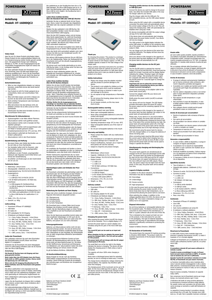 POWERBANK DE E NERGY Power E Die Ladeleistung an der Rundbuchse kann bis zu 30 Watt betragen. Am Micro-USB Eingang sind es ca. 10 Watt. Das gleichzeitige Laden über Rundbuchse und Micro-USB ist nicht möglich. Die Rundbuchse hat in diesem Fall Priorität. POWERBANK EN E VERYWHERE Anleitung Modell: XT-16000QC2 Laden Ihres mobilen Gerätes über die Standard USB oder USB QC2 Buchse Verbinden Sie das zu ladende Gerät mit der Powerbank. Hierzu nutzen Sie entweder das mitgelieferte USB-Kabel oder das originale Ladekabel von Ihrem Gerät. NERGY Charging mobile devices via the standard USB or USB QC2 port Power E VERYWHERE Manual Model: XT-16000QC2 Stecken Sie das Ladekabel in die USB Buchse. Bei QC2 kompatiblen Geräten nutzen Sie den entsprechend beschrifteten USB Ausgang. dass Sie sich für dieses Produkt entschieden haben. Dieses Produkt ist eine wiederaufladbare Batterie die zur Energieversorgung mobiler Geräte genutzt werden kann. Die gespeicherte Energie nach Vollladung beträgt ca. 57,7Wh. Je nach Ausgangsspannung der verwendeten Ausgangsbuchse ergibt sich daraus die verfügbare Kapazität. Für einen optimalen Einsatz der Powerbank und zu Ihrer Sicherheit, lesen Sie bitte diese Bedienungsanleitung sorgfältig durch, bevor Sie die Powerbank einsetzen. Bewahren Sie sie auf, damit Sie diese bei Unsicherheiten und Weitergabe des Produktes zur Verfügung haben. Sicherheitshinweise • Bitte nur den mitgelieferten Adapter zur Ladung benutzen, andernfalls könnte das Gerät beschädigt werden. • Das Produkt ist nicht für Kinder geeignet da es zerbrechliche, kleine und verschluckbare Teile enthält. • Bitte nicht fallen lassen und nicht in Wasser eintauchen da das Gerät sonst beschädigt wird. • Nicht erhöhten Temperaturen oder brennbaren Gasen aussetzen. • Bitte demontieren Sie das Gehäuse nicht, bei Defekten schicken Sie es bitte zurück an Ihren Fachhändler. • Überbrücken Sie bitte keine Kontakte da dies zu Kurzschlüssen führen kann. Warnhinweis für Akkumulatoren • Explosionsgefahr in der Nähe offener Flammen. • Akkumulatoren dürfen nicht geöffnet werden. • Akkumulatoren dürfen nicht in Kontakt mit Flüssigkeiten gelangen. • Akkumulatoren dürfen nicht kurzgeschlossen oder mit Metall in Kontakt gebracht werden • Einsatztemperaturbereich bei -0°C und max. 45°C • Akkumulatoren außerhalb der Reichweite von Kindern aufbewahren • Akkumulatoren nicht in den Mund stecken Gewährleistung und Haftung • Bei einem Fehler oder Defekt des Gerätes wenden Sie sich bitte an Ihren Fachhändler. • Der Hersteller haftet nicht für Personen- oder Sachschäden die durch den unsachgemäßen Gebrauch entstehen. • Modifikation an dem Produkt, unsachgemäßer Gebrauch oder Reparatur durch Dritte führen zum Verlust der Gewährleistung. • Druckfehler und Änderungen an dem Gerät behalten wir uns vor. Technische Daten • • • • Batterietyp: Lithium-Ionen Akkukapazität: 15600mAh (3,7V) / 57,7Wh Ausgangsspannung: 5V/12V/16,5V/19V/20V/24V Ausgangsstrom: *1 x USB 2.1A *1 x USB QC2 5V/2.1A 9V/2A 12V/2A *DC 50 Watt kontinuierlich / 65 Watt max. • Anschlüsse: *1x USB-Ausgang für Geräteanschluss *1x USB Q2 Ausgang für Geräteanschluss (5V/9V/12V) *1x Kombi-Rundbuchse für Geräteanschluss (1224V 50W) und Ladefunktion (13-20V 3A max.) *1x Micro-USB Buchse für Ladefunktion 5.1V 2.1A • Maße: 174 x 78 x 21,5 mm • Gewicht: ca. 405g Lieferumfang • • • • • Powerbank XTPower XT-16000QC2 USB Kabel DC Cable 2m KFZ Ladeadapter für DC Eingang 8 Notebook und Netbook Adapter *A = Sony, Fujitsu, Panasonic - 6.0x4.25mm *C= IBM, Acer, Toshiba, Dell, Asus - 5.5x2.5mm *D= Asus, HP, NEC, Toshiba, BenQ - 5.5x2.1mm *E= Acer, Toshiba, Sony - 5.5x1.7mm *F=Samsung - 4.8x1.7mm *H= Asus, HP, NEC, Delta, Compaq - 5.0x1.0mm *I = Dell, HP - 7.4x5.0x0.6mm *K = IBM, Lenovo, Sony - 7.9x5.4x0.9mm Laden der Powerbank Den Ladestatus erkennen Sie nach dem Einschalten des Einschaltknopfes (on/off) Dieser wird Ihnen digital in % angegeben. Den aktiven USB Ausgang erkennen Sie am USB Symbol in der Digitalanzeige. Neben der Restkapazität der Powerbanks wird auch die aktuelle Ausgangsleistung in Watt dargestellt. Sie können auch zwei Geräte gleichzeitig an je einer USB-Buchse laden. In der Anzeige sehen Sie dann die kombinierte Ausgangsleistung. Sobald Ihr Gerät vollständig geladen oder die Kapazität der Powerbank aufgebraucht ist, schaltet sich entweder der USB Ausgang oder die Powerbank automatisch aus. Laden Ihres mobilen Gerätes über die DC Buchse (Output) Wählen Sie mit dem On/Off Schalter die benötigte Spannung (12V/16.5V/19V/20V/24V). Dazu drücken Sie diesen Schalter mindestens 3 Sekunden bis das Voltangabe im Display blinkt. Mit jedem weiteren Drücken springt die gewählte Ausgangsspannung weiter. Nach 3 Sekunden ohne weiteres Drücken ist die Ausgangsspannung ist eingestellt. Die eingestellte Spannung können Sie jederzeit durch 3 Sekunden Drücken des On/Off Schalters kontrollieren. Wichtig: Stellen Sie die Ausgangsspannung unbedingt vor Anschluss des zu ladenden Gerätes korrekt ein, da dieses sonst Schaden nehmen kann. Verbinden Sie das Rundstecker Adapterkabels mit der Powerbank (Rundbuchse). Suchen Sie das entsprechende Verbindungsstück für Ihr Gerät und verbinden es mit dem Kabel. Der Ausgang aktivieren Sie durch kurzes Drücken des Schalters (on/off). Ihr Gerät wird nun geladen. Die LED Anzeige informiert Sie über den aktiven DC-Ausgang, die Ausgangsleistung und die Restkapazität der Powerbank. Sobald Ihr Gerät vollständig geladen oder die Kapazität der Powerbank aufgebraucht ist, schaltet sich der Ausgang oder die Powerbank automatisch aus. Bitte beachten Sie, dass wenn Ihr Gerät in Betrieb ist und die Batterie im Gerät nicht vollgeladen ist, dann versorgt die Powerbank Ihr Gerät und lädt parallel die Gerätebatterie. Wenn die Summe der Ströme dadurch zu hoch werden sollte, schaltet die Powerbank automatisch ab oder aber die Laufzeit der Pow