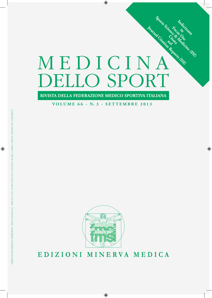 ) SI (I ta e za : icin ) ciz SI di in On ed (I s In cu M a rts Fo ce & itat l epo e ien C n n R Sc tio ts ita or lC Sp na ur Jo V O L U M E 6 6 - N. 3 - S E T T E M B R E 2 0 1 3 MEDICINA DELLO SPORT Rivista trimestrale della Federazione Medico-Sportiva Italiana. Continuazione di: Studi di Medicina e Chirurgia dello Sport, Medicina Sportiva Direttori G. SANTILLI - M. CASASCO Comitato Editoriale N. BACHL (Austria) - F. BENAZZO (Italia) - F. BOTRÈ (Italia) - P. CERRETELLI (Italia) - G. CERULLI (Italia) L. COIANA (Italia) - D. CORRADO (Italia) - J. M. CUMMISKEY (Regno Unito) - A. DAL MONTE (Italia) - F. DE FERRARI (Italia) E. H. DE ROSE (Brasile) - H. H. DICKHUTH (Germania) - L. DI LUIGI (Italia) - P. E. DI PRAMPERO (Italia) C. FOTI (Italia) - W. FRONTERA (USA) - S. GIANNINI (Italia) - C. G. GRIBAUDO (Italia) - V. KLISSOURAS (Grecia) G. LETIZIA MAURO (Italia) - L. MAGAUDDA (Italia) - D. MC DONAGH (Norvegia) - P. P. MARIANI (Italia) G. MASSAZZA (Italia) - L. MICHELI (USA) - P. PARISI (Italia) - S. PECORELLI (Italia) - A. PELLICCIA (Italia) - F. PIGOZZI (Italia) I. PITSILADIS (Regno Unito) - P. ROCHECONGARD (Francia) - E. ROVELLI (Italia) - R. SALLIS (USA) F. SCHENA (Italia) - A. TODARO (Italia) - C. TRANQUILLI (Italia) - A. G. UGAZIO (Italia) - A. VEICSTEINAS (Italia) P. VOLPI (Italia) - P. ZEPPILLI (Italia) Comitato di Redazione A. BONETTI - E. DRAGO - S. DRAGONI - G. FRANCAVILLA Direttore Responsabile A. OLIARO This journal is PEER REVIEWED and is quoted in: BIOSIS Previews - EMBASE - Science Citation Index Expanded (SciSearch) - Scopus La Rivista è citata nel Journal Citation Reports (ISI) con Impact Factor Direzione e Redazione: Federazione Medico-Sportiva Italiana - Viale Tiziano 70 - 00196 Roma. E-mail: [email protected] Ufficio grafico, ufficio pubblicità, fotocomposizione, amministrazione - Edizioni Minerva Medica - Corso Bramante 83-85 - 10126 Torino Tel. (011) 67.82.82 - Fax (011) 67.45.02 - E-mail: [email protected] Web Site: www.minervamedica.it Stampa - Edizioni Minerva Medica - Tipografia di Saluzzo - Corso IV Novembre 29-31 - 12037 Saluzzo (CN) - Tel. (0175) 249405 Fax (0175) 249407 Abbonamento annuo: Italia - Individuale: Online € 90; Cartaceo € 95, Cartaceo+Online € 100,00; Istituzionale: Cartaceo € 130,00, Online (Small € 252,00, Medium € 282,00, Large € 324,00, Extra Large € 340,00), Cartaceo+Online (Small € 260,00, Medium € 295,00, Large € 340,00, Extra Large € 355,00). Unione Europea - Individuale: Online € 150,00; Cartaceo € 155,00, Cartaceo+Online € 165,00; Istituzionale: Cartaceo € 240,00, Online (Small € 252,00, Medium € 282,00, Large € 324,00, Extra Large € 340,00), Cartaceo+Online (Small € 270,00, Medium € 305,00, Large € 350,00, Extra Large € 365,00) Paesi extraeuropei - Individuale: Online € 165,00; Cartaceo € 175,00, Cartaceo+Online € 185,00; Istituzionale: Cartaceo € 285,00, Online (Small € 275,00, Medium € 305,00, Large € 350,00, Extra Large € 365,00), Cartaceo+Online (Small € 290,00, Medium € 325,00, Large € 370,00, Extra Large € 385,00). Per il pagamento: 1) Gli abbonati possono utilizzare le seguenti forme di pagamento: a) assegno bancario; b) bonifico bancario a: Edizioni Minerva Medica, INTESA SANPAOLO Agenzia n. 18 Torino. IBAN: IT45 K030 6909 2191 0000 0002 917 c) conto corrente postale 00279109 intestato a Edizioni Minerva Medica, Corso Bramante 83-85, 10126 Torino; d) carte di credito Diners Club International, Master Card, VISA, American Express; 2) i soci devono contattare direttamente la Segreteria della Federazione I cambi di indirizzo di spedizione, e-mail o di qualsiasi altro dato di abbonamento vanno segnalati tempestivamente inviando i nuovi e vecchi dati per posta, fax, e-mail o direttamente sul sito www.minervamedica.it alla sezione “I tuoi abbonamenti - Contatta ufficio abbonamenti” I reclami per i fascicoli mancanti devono pervenire entro 6 mesi dalla data di pubblicazione del fascicolo - I prezzi dei fascicoli e delle annate arretrati sono disponibili su richiesta © Edizioni Minerva Medica - Torino 2013 Tutti i diritti sono riservati. Nessuna parte di questa pubblicazione può essere riprodotta, trasmessa e memorizzata in qualsiasi forma e con qualsiasi forma e con qualsiasi mezzo Pubblicazione trimestrale. Autorizzazione del Tribunale di Torino n. 1441 del 15-3-1961. Iscrizione nel registro nazionale della stampa di cui alla legge 5-8-1981 n. 416 art. 11 con il numero 00 148 vol. 2 foglio 377 in data 18-8-1982. Pubblicazione periodica trimestra le - Poste Italiane S.p.A. - Sped. in a.p. - D. L. 353/2003 (conv. in L. 27/02/2004 N° 46) art. 1, comma 1, DCB/CN MEDICINA DELLO SPORT Vol. 66 Settembre 2013 Numero 3 INDICE 307 351 Valutazione metabolico-fisiologica nello studio del modello funzionale del rugby Effetto del nuovo dilatatore nasale interno DAN-Air ® sulla respirazione nasale e sulla performance in un gruppo di canottieri AREA FISIOLOGICA Guerra E., Quaranta F., Sperandii F., Borrione P., Ciminelli E., Calò L., Pigozzi F. 315 Effetti di diverse intensità di esercizio di resistenza sulle delezioni di DNA mitocondriale in giovani atleti Rahimi R., Salehi Z., Mousavi Beneh-Hoor Z. AREA MEDICA Di Lieto C., Granata D., Ceroni Compadretti G., Tasca I., Senaldi R., Crisostomi S., Adami P. E., Rizzo M., Spataro A. 363 Effetti delle strategie di idratazione sulle prestazioni da squash competitivo Fritz S., Toriola A. L., Neveling N. 375 325 Effetto del training e della pausa di detraining sui livelli serici di leptina nei ragazzi obesi Fazelifar S., Ebrahim K., Sarkisian V. Dipendenza negativa dalla carriera di resistenza e dismorfismo corporeo negli atleti veterani Salas Sánchez J., Ángel Latorre Roman P., Soto Hermoso V. M. 339 389 Balci S. S. Atay I. M., Aydin C., Karatosun H. Differenze di genere nello stress ossidativo e risposta antiossidante all’esercizio esaustivo acuto Vol. 66 - N. 3 Rabbia di tratto, espressione di rabbia, strategie di gestione