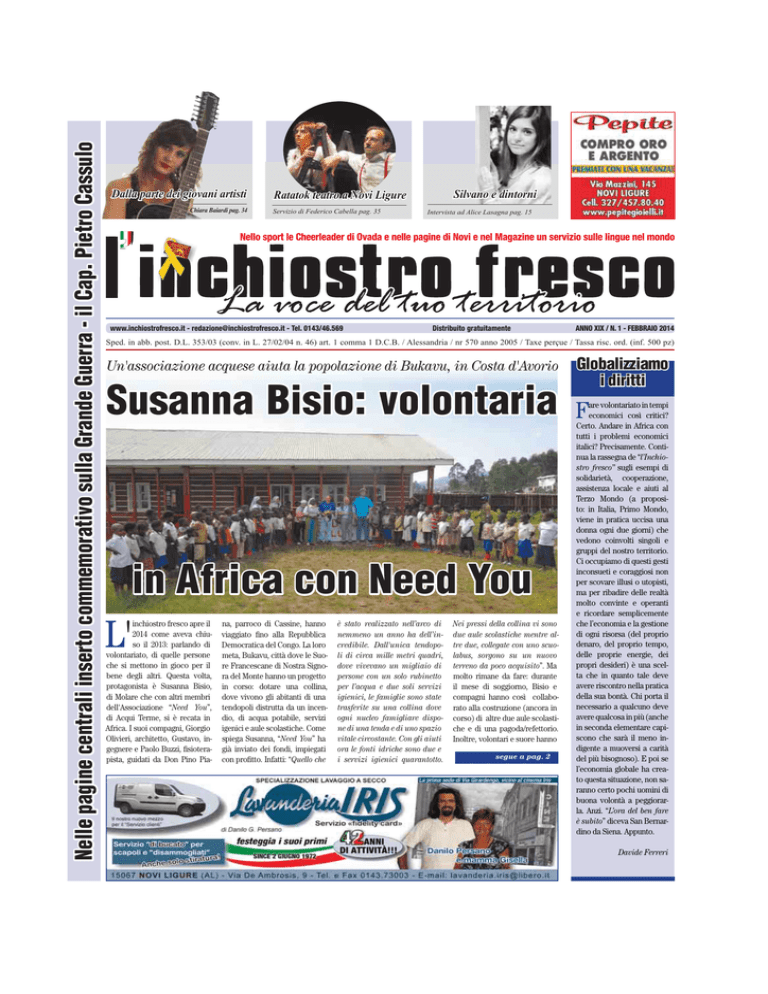 l’inchiostro fresco Nelle pagine centrali inserto commemorativo sulla Grande Guerra - il Cap. Pietro Cassulo Febbraio 2014 Dalla parte dei giovani artisti Chiara Baiardi pag. 34 Ratatok teatro a Novi Ligure Servizio di Federico Cabella pag. 35 1 Silvano e dintorni Intervista ad Alice Lasagna pag. 15 Nello sport le Cheerleader di Ovada e nelle pagine di Novi e nel Magazine un servizio sulle lingue nel mondo La voce del tuo territorio www.inchiostrofresco.it - [email protected] - Tel. 0143/46.569 Distribuito gratuitamente ANNO XIX / N. 1 - FEBBRAIO 2014 Sped. in abb. post. D.L. 353/03 (conv. in L. 27/02/04 n. 46) art. 1 comma 1 D.C.B. / Alessandria / nr 570 anno 2005 / Taxe perçue / Tassa risc. ord. (inf. 500 pz) Un'associazione acquese aiuta la popolazione di Bukavu, in Costa d'Avorio Susanna Bisio: volontaria in Africa con Need You L' inchiostro fresco apre il 2014 come aveva chiuso il 2013: parlando di volontariato, di quelle persone che si mettono in gioco per il bene degli altri. Questa volta, protagonista è Susanna Bisio, di Molare che con altri membri dell'Associazione “Need You”, di Acqui Terme, si è recata in Africa. I suoi compagni, Giorgio Olivieri, architetto, Gustavo, ingegnere e Paolo Buzzi, fisioterapista, guidati da Don Pino Pia- na, parroco di Cassine, hanno viaggiato fino alla Repubblica Democratica del Congo. La loro meta, Bukavu, città dove le Suore Francescane di Nostra Signora del Monte hanno un progetto in corso: dotare una collina, dove vivono gli abitanti di una tendopoli distrutta da un incendio, di acqua potabile, servizi igenici e aule scolastiche. Come spiega Susanna, “Need You” ha già inviato dei fondi, impiegati con profitto. Infatti: “Quello che è stato realizzato nell’arco di Nei pressi della collina vi sono nemmeno un anno ha dell’in- due aule scolastiche mentre alcredibile. Dall'unica tendopo- tre due, collegate con uno scuoli di circa mille metri quadri, labus, sorgono su un nuovo dove vivevano un migliaio di terreno da poco acquisito”. Ma persone con un solo rubinetto molto rimane da fare: durante per l’acqua e due soli servizi il mese di soggiorno, Bisio e igienici, le famiglie sono state compagni hanno così collabotrasferite su una collina dove rato alla costruzione (ancora in ogni nucleo famigliare dispo- corso) di altre due aule scolastine di una tenda e di uno spazio che e di una pagoda/refettorio. vitale circostante. Con gli aiuti Inoltre, volontari e suore hanno ora le fonti idriche sono due e segue a pag. 2 i servizi igienici quarantotto. Globalizziamo i diritti F are volontariato in tempi economici così critici? Certo. Andare in Africa con tutti i problemi economici italici? Precisamente. Continua la rassegna de “l’Inchiostro fresco” sugli esempi di solidarietà, cooperazione, assistenza locale e aiuti al Terzo Mondo (a proposito: in Italia, Primo Mondo, viene in pratica uccisa una donna ogni due giorni) che vedono coinvolti singoli e gruppi del nostro territorio. Ci occupiamo di questi gesti inconsueti e coraggiosi non per scovare illusi o utopisti, ma per ribadire delle realtà molto convinte e operanti e ricordare semplicemente che l’economia e la gestione di ogni risorsa (del proprio denaro, del proprio tempo, delle proprie energie, dei propri desideri) è una scelta che in quanto tale deve avere riscontro nella pratica della sua bontà. Chi porta il necessario a qualcuno deve avere qualcosa in più (anche in seconda elementare capiscono che sarà il meno indigente a muoversi a carità del più bisognoso). E poi se l’economia globale ha creato questa situazione, non saranno certo pochi uomini di buona volontà a peggiorarla. Anzi. “L’ora del ben fare è subito” diceva San Bernardino da Siena. Appunto. Davide Ferreri l’inchiostro fresco fresco 2 l’inchiostro Febbraio 2014 Globalizzazione dei diritti prosegue da pag. 1 deciso l'installazione di pannelli solari presso l'ospedale di Kamanyola, l'acquisto di nove capre (per la fattoria locale) e di scorte alimentari: sacchi di riso, fagioli, farina di maioca e pesce secco. Conclude Susanna: “Abbiamo vissuto un'esperienza meravigliosa ma ancora più straordinaria agli occhi di tutti è stato il concatenarsi di eventi, l'incontro casuale tra pesone con gli stessi ideali. Non a caso al centro del campo è stata eretta una grande Croce Bianca a ringraziamento di questa favorevole provvidenza”. A riassumere l'essenza del viaggio, ecco così la preghiera finale, che si è elevata da 200 voci in taliano, francese e swahili per un grazie senza differenze. Luisa Russo l’inchiostro fresco Direttore onorario: Rino Direttore Vaccaro responsabile: Luisa Russo VOLONTARIATO Un contributo per aiutare la ricerca del Centro Trapianti Midollo Osseo Per ricordare Vito Marsico P er ricordare il musicista serravallese Vito Marsico, che per tanti anni ha diretto la Banda musicale “Pippo Bagnasco”, venerdì 24 gennaio, alla presenza del dott. Andrea Bacigalupo, Primario responsabile del Centro Trapianti Midollo Osseo dell’Ospedale San Martino di Genova (presso cui ha sede la Fondazione FA-RI.T.M.O. Onlus beneficiaria dei fondi raccolti), è stato consegnato l’ultimo contributo di 1.000 euro per sostenere l’attività di ricerca svolta dal Centro in questo campo. Il progetto è stato promosso dall’Associazione Libarna Arteventi, con la collaborazione dell’Assessorato alla Cultura del Comune di Serravalle Scrivia ed è stato presentato nell’ambito del Concorso Letterario “Le Storie del Novecento”, edizio- L’Arca di Noè Nella foto il Dott Andrea Bacigalupo insieme all’Ass. Marco Freggiaro, a Iudica Dameri, Presidente di “Libarna Arteventi” e alla dott.ssa Alida Dominietto ne 2013. È stato realizzato mente devoluti all’attività di anche un CD titolato: “A tem- ricerca del Centro Trapianti di po, a modo”, del gruppo Rocco Midollo Osseo dell’Ospedale Parisi’s Bass Clarinet Quartet, San Martino. “La Fondazione grazie al quale è st