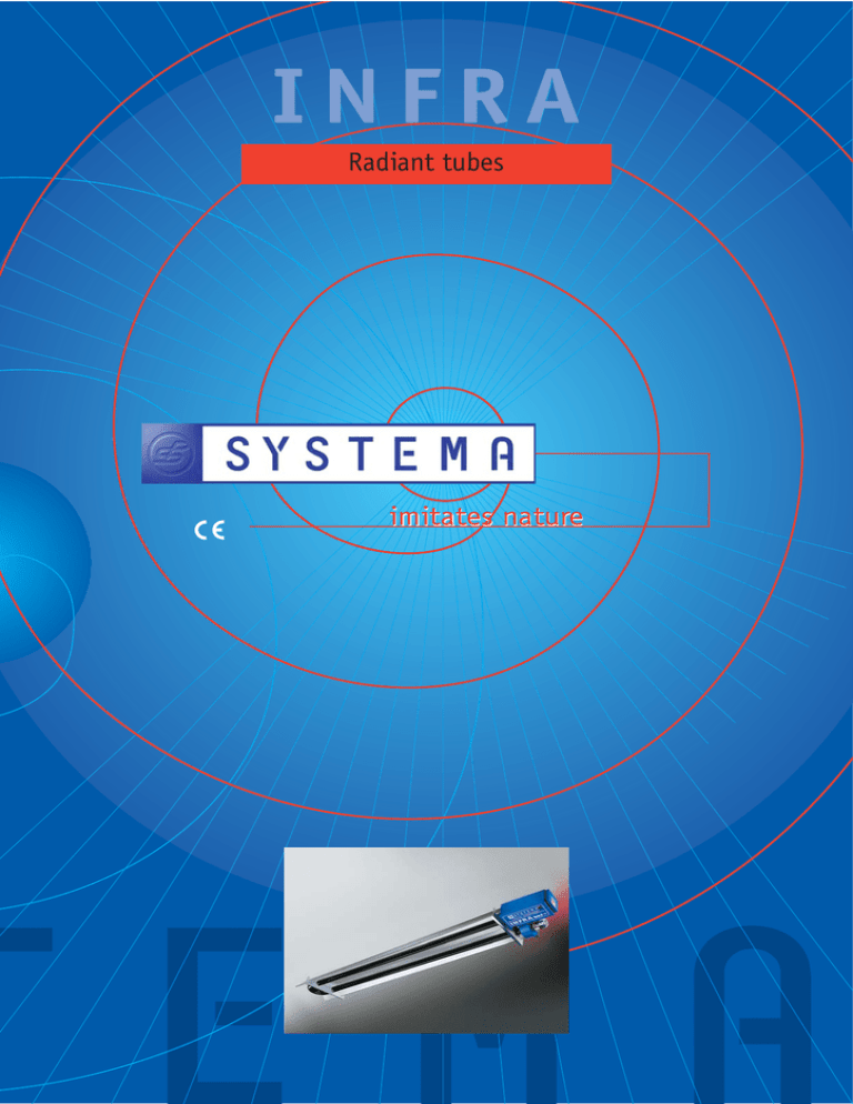 INFRA Radiant tubes imitates nature INFRA Radiant tubes THE ADVANTAGES OF HEATING WITH IRRADIATION LIKE THE SUN INDUSTRIAL, COMMERCIAL, SPORTS environments HOT AIR RADIANT TUBES C° C° 35° 5° 20° 15° 5° 20° - Possibility of heating single zones - Heat concentrated on the floor - Absence of air movement in the environment - Limited air stratification between floor and ceiling - Absence of suspended dust particles - Working in comfortable warmth breathing fresher air - Healthier environments Ne w University of Ferrara: Considerations on health and hygiene regarding INFRA radiant modules and also - CONSTRUCTION OF A HEATING PLANT IS NOT REQUIRED - LESS THERMAL INERTIA IN THE WHOLE SYSTEM - POSSIBILITY OF HEATING ZONES AT DIFFERENT TEMPERATURES - MINIMUM SERVICING - POSSIBILITY OF USING GAS OR DIESEL OIL - REDUCTIONS IN ENERGY CONSUMPTION - INVESTMENT PAID OFF IN 2 TO 4 YEARS - FALLS WITHIN THE OPERATIONS DIRECTED AT SAVING ENERGY AND THEREFORE QUALIFIES FOR FINANCINGS CONTEMPLATED BY CURRENT LAWS PLANNING A CUSTOM-MADE CLIMATE G U I D E T O C H O O S I N G “ I N F R A” M O D U L E S The choice of height at which to install modules (H) is essentially linked to the height of the environment, taking account of obstacles, such as bridge cranes, lighting fixtures, shelving, piping, power cables, etc.. Once the installation height (H) has been identified, the tables below are used to establish the distance between centres of HEATING BY INFRA INFRARED RADIATION A B C - modules (I) and their distance (D) from the perimetric walls, depending on whether calculating total heating of the environment or heating of single specific work zones. Verification of installed power which takes account of the true insulation specifications of the building and the activity performed by staff, can be implemented with the aid of the INFRA program, written specifically and diskette. available on Direct and indirect infrared radiation 50+50 =100 Direct infrared radiation =100 Direct infrared radiation 50+50 =100 D E - Direct infrared radiation 30+70 =100 Direct infrared radiation 50 not sufficient GENERAL CRITERIA FOR THE CHOICE AND SIZE OF “RADIANT TUBES” PARALLEL LAY-OUT LAY-OUT IN SERIES CROSS-SECTION A-A TOTAL HEATING CROSS-SECTION A-A (Assessed with speed relative to the air below 0.5 m/s) - H = HEIGHT OF INSTALLATION (m) - I = DISTANCE BETWEEN CENTRES (m) INFRA 6 H I max D max 4 5 2,5 5 6,5 3 6 8 3,5 H I max D max 5 6 3 6 8 3,5 7 9 4 H I max D max 5 6 3 6 8 3,5 7 9 4 - D = DISTANCE (m) INFRA 9 8 10 4,5 9 10 4,5 10 10 4,5 11 10 4,5 12 10 4,5 9 10 4,5 10 10 4,5 11 10 4,5 12 10 4,5 INFRA 12 8 10 4,5 Ratio between total installed thermal capacity (W) and floor area to be heated (m 2 ) 4 190 190 190 5 190 200 210 6 210 220 230 7 210 220 230 H I max 4 4 5 4,5 6 4,5 H I max 4 4 5 5 6 5 H I max 4 4 5 5 6 5 8 230 240 250 9 230 240 250 10 250 260 270 11 250 270 280 External temp. -5°C -10°C -20°C HEATING - H = HEIGHT OF INSTALLATION (m) - I = DISTANCE BETWEEN CENTRES (m) INFRA 6 - D = DISTANCE (m) INFRA 9 7 5 INFRA 12 7 5 R a t i o b e t we e n t o t a l i n s t a l l e d t h e r m a l c a p a c i t y ( W ) a n d f l o o r a re a t o b e h e a t e d ( m 2 ) H W/m2 4 400 5 420 6 450 7 480 R a t i o b e t we e n t o t a l i n s t a l l e d t h e r m a l c a p a c i t y ( W ) a n d f l o o r a re a t o b e h e a t e d ( m 2 ) H W/m2 4 500 5 550 6 580 7 600 R a t i o b e t we e n t o t a l i n s t a l l e d t h e r m a l c a p a c i t y ( W ) a n d f l o o r a re a t o b e h e a t e d ( m 2 ) H W/m2 HEATING OF LOCALISED ZONES CEILING-MOUNTED RADIANT MODULES 4 700 5 730 6 760 HEATING OF LOCALISED ZONES WALL-MOUNTED RADIANT MODULES MAXI CANOPIES (RECOMMENDED) YES STANDARD CANOPIES STANDARD CANOPIES NO H MAX=7 m MAXI CANOPIES (RECOMMENDED) 7 780 Minimum 4 metres ZONE H W/m2 W/m2 W/m2 OPERATING PRINCIPLE The “INFRA” sealed gas Radiant Module designed and manufactured by SYSTEMA S.r.l. is composed of: BAF burner with premixing of air-gas induced by a downstream fan, sealed chamber, thermal capacity 28/45 kW, composed of multigas torch with flame stabiliser in stainless steel, electronic ignition, no pilot flame, ionised flame control, slow ignition double-coil seal gas solenoid valve adjustable with Housing for fume suction fan mity with Directive 90/396 EEC. Considerations on health-hygiene regarding INFRA radiant tube modules manu- pressure factured by SYSTEMA s.r.l. by Prof. stabiliser and Giuseppe RAUSA of the gas filter, safety air Institute of Hygiene and pressure switch, combu- Preventive Medicine, UNI- stion air shutter adjustable in VERSITY OF FERRARA. fixed positions according to the thermal capacity of the instrument, body painted with epoxy powders. Electric exhaust fan with class H motor and reflec- complete with heat deflecting disk, ven- ting canopies, in tilated, special self-lubricating bearings, steel. power supply 230V 50 Hz, IP 44, Instrument in conformity 50/100W, built-in overload cut-out, fan with treated with special paints resistant to 73/323/EEC initial fume condensate. Instrument in conformity with the EMC Heating body through which combustion Electromagnetic Compatibility Directive products run to take the external surface 89/336/EEC to temperatures which emit heat waves in Instrument checked to European standard the infrared field into the environment. EN 416-1 The tubes ari manifacture from allumined CE Certificate type No. 0063 in confor- the LOW VOLTAGE Directive Optional accessories: Specular reflecting canopies model RBT with upper insulation in rock wool. Brackets and reflecting canopies model MAXI for application at heights of over 13 metres or for wall-mounting. Protective net against accidental contact with radiant tubes for gyms, bowling alleys and tennis courts. Thermostat for temperature limits of radiant tubes with capillary contact probe. Housing for fume suction fan steel due to the calorize process the tubes are annealed at high temperature to give high even color 