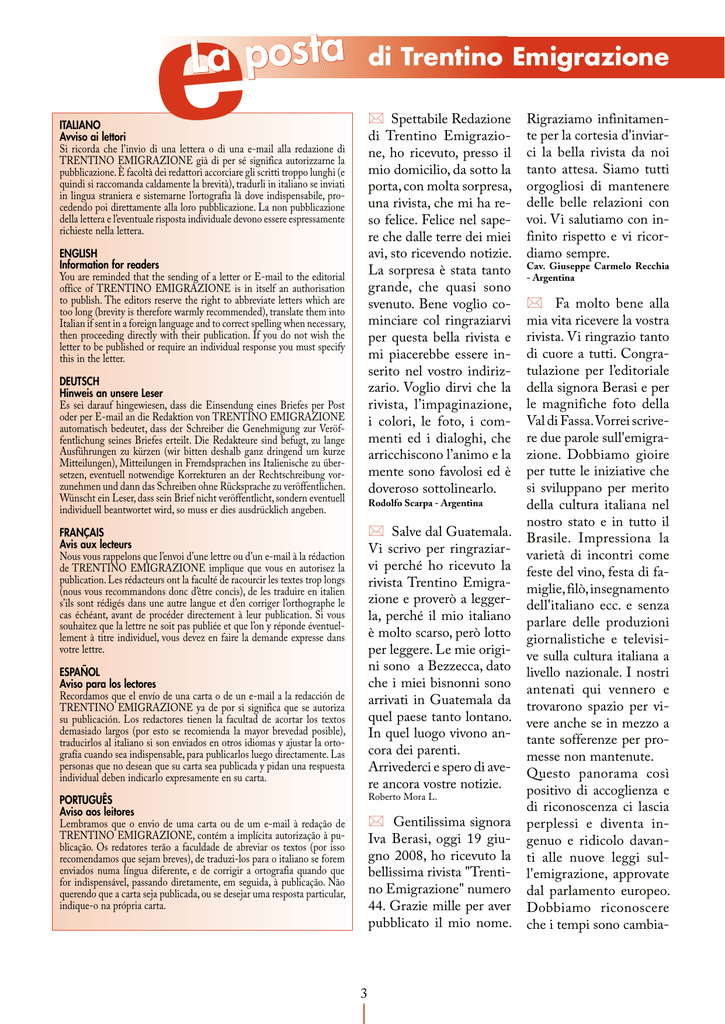 e La posta di Trentino Emigrazione * Spettabile Redazione di Trentino Emigrazione, ho ricevuto, presso il mio domicilio, da sotto la porta, con molta sorpresa, una rivista, che mi ha reso felice. Felice nel sapere che dalle terre dei miei avi, sto ricevendo notizie. La sorpresa è stata tanto grande, che quasi sono svenuto. Bene voglio cominciare col ringraziarvi per questa bella rivista e mi piacerebbe essere inserito nel vostro indirizzario. Voglio dirvi che la rivista, l’impaginazione, i colori, le foto, i commenti ed i dialoghi, che arricchiscono l’animo e la mente sono favolosi ed è doveroso sottolinearlo. ITALIANO Avviso ai lettori Si ricorda che l’invio di una lettera o di una e-mail alla redazione di TRENTINO EMIGRAZIONE già di per sé significa autorizzarne la pubblicazione. È facoltà dei redattori accorciare gli scritti troppo lunghi (e quindi si raccomanda caldamente la brevità), tradurli in italiano se inviati in lingua straniera e sistemarne l’ortografia là dove indispensabile, procedendo poi direttamente alla loro pubblicazione. La non pubblicazione della lettera e l’eventuale risposta individuale devono essere espressamente richieste nella lettera. ENGLISH Information for readers You are reminded that the sending of a letter or E-mail to the editorial office of TRENTINO EMIGRAZIONE is in itself an authorisation to publish. The editors reserve the right to abbreviate letters which are too long (brevity is therefore warmly recommended), translate them into Italian if sent in a foreign language and to correct spelling when necessary, then proceeding directly with their publication. If you do not wish the letter to be published or require an individual response you must specify this in the letter. DEUTSCH Hinweis an unsere Leser Es sei darauf hingewiesen, dass die Einsendung eines Briefes per Post oder per E-mail an die Redaktion von TRENTINO EMIGRAZIONE automatisch bedeutet, dass der Schreiber die Genehmigung zur Veröffentlichung seines Briefes erteilt. Die Redakteure sind befugt, zu lange Ausführungen zu kürzen (wir bitten deshalb ganz dringend um kurze Mitteilungen), Mitteilungen in Fremdsprachen ins Italienische zu übersetzen, eventuell notwendige Korrekturen an der Rechtschreibung vorzunehmen und dann das Schreiben ohne Rücksprache zu veröffentlichen. Wünscht ein Leser, dass sein Brief nicht veröffentlicht, sondern eventuell individuell beantwortet wird, so muss er dies ausdrücklich angeben. Rodolfo Scarpa - Argentina * Salve dal Guatemala. Vi scrivo per ringraziarvi perché ho ricevuto la rivista Trentino Emigrazione e proverò a leggerla, perché il mio italiano è molto scarso, però lotto per leggere. Le mie origini sono a Bezzecca, dato che i miei bisnonni sono arrivati in Guatemala da quel paese tanto lontano. In quel luogo vivono ancora dei parenti. Arrivederci e spero di avere ancora vostre notizie. FRANÇAIS Avis aux lecteurs Nous vous rappelons que l’envoi d’une lettre ou d’un e-mail à la rédaction de TRENTINO EMIGRAZIONE implique que vous en autorisez la publication. Les rédacteurs ont la faculté de racourcir les textes trop longs (nous vous recommandons donc d’être concis), de les traduire en italien s’ils sont rédigés dans une autre langue et d’en corriger l’orthographe le cas échéant, avant de procéder directement à leur publication. Si vous souhaitez que la lettre ne soit pas publiée et que l’on y réponde éventuellement à titre individuel, vous devez en faire la demande expresse dans votre lettre. ESPAÑOL Aviso para los lectores Recordamos que el envío de una carta o de un e-mail a la redacción de TRENTINO EMIGRAZIONE ya de por si significa que se autoriza su publicación. Los redactores tienen la facultad de acortar los textos demasiado largos (por esto se recomienda la mayor brevedad posible), traducirlos al italiano si son enviados en otros idiomas y ajustar la ortografía cuando sea indispensable, para publicarlos luego directamente. Las personas que no desean que su carta sea publicada y pidan una respuesta individual deben indicarlo expresamente en su carta. Roberto Mora L. PORTUGUÊS Aviso aos leitores Lembramos que o envio de uma carta ou de um e-mail à redação de TRENTINO EMIGRAZIONE, contém a implícita autorização à publicação. Os redatores terão a faculdade de abreviar os textos (por isso recomendamos que sejam breves), de traduzi-los para o italiano se forem enviados numa língua diferente, e de corrigir a ortografia quando que for indispensável, passando diretamente, em seguida, à publicação. Não querendo que a carta seja publicada, ou se desejar uma resposta particular, indique-o na própria carta. * Gentilissima signora Iva Berasi, oggi 19 giugno 2008, ho ricevuto la bellissima rivista "Trentino Emigrazione" numero 44. Grazie mille per aver pubblicato il mio nome. Rigraziamo infinitamente per la cortesia d'inviarci la bella rivista da noi tanto attesa. Siamo tutti orgogliosi di mantenere delle belle relazioni con voi. Vi salutiamo con infinito rispetto e vi ricordiamo sempre. Cav. Giuseppe Carmelo Recchia - Argentina * Fa molto bene alla mia vita ricevere la vostra rivista. Vi ringrazio tanto di cuore a tutti. Congratulazione per l’editoriale della signora Berasi e per le magnifiche foto della Val di Fassa. Vorrei scrivere due parole sull'emigrazione. Dobbiamo gioire per tutte le iniziative che si sviluppano per merito della cultura italiana nel nostro stato e in tutto il Brasile. Impressiona la varietà di incontri come feste del vino, festa di famiglie, filò, insegnamento dell'italiano ecc. e senza parlare delle produzioni giornalistiche e televisive sulla cultura italiana a livello nazionale. I nostri antenati qui vennero e trovarono spazio per vivere anche se in mezzo a tante sofferenze per promesse non mantenute. Questo panorama così positivo di accoglienza e di riconoscenza ci lascia perplessi e diventa ingenuo e ridicolo davanti alle nuove leggi sull'emigraz