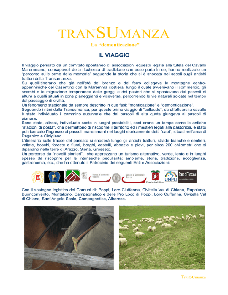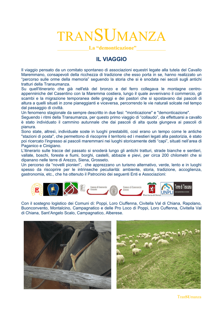 TRANSUMANZA ______________La “demonticazione”_____________ IL VIAGGIO Il viaggio pensato da un comitato spontaneo di associazioni equestri legate alla tutela del Cavallo Maremmano, consapevoli della ricchezza di tradizione che esso porta in se, hanno realizzato un “percorso sulle orme della memoria” seguendo la storia che si è snodata nei secoli sugli antichi tratturi della Transumanza. Su quell'itinerario che già nell'età del bronzo e del ferro collegava le montagne centroappenniniche del Casentino con la Maremma costiera, lungo il quale avvenivano il commercio, gli scambi e la migrazione temporanea delle greggi e dei pastori che si spostavano dai pascoli di altura a quelli situati in zone pianeggianti e viceversa, percorrendo le vie naturali solcate nel tempo dal passaggio di civiltà. Un fenomeno stagionale da sempre descritto in due fasi: "monticazione" e "demonticazione". Seguendo i ritmi della Transumanza, per questo primo viaggio di “collaudo”, da effettuarsi a cavallo è stato individuato il cammino autunnale che dai pascoli di alta quota giungeva ai pascoli di pianura. Sono state, altresì, individuate soste in luoghi prestabiliti, così erano un tempo come le antiche "stazioni di posta", che permettono di riscoprire il territorio ed i mestieri legati alla pastorizia, è stato poi ricercato l’ingresso ai pascoli maremmani nei luoghi storicamente detti “capi”, situati nell’area di Paganico e Cinigiano. L’itinerario sulle tracce del passato si snoderà lungo gli antichi tratturi, strade bianche e sentieri, vallate, boschi, foreste e fiumi, borghi, castelli, abbazie e pievi, per circa 200 chilometri che si dipanano nelle terre di Arezzo, Siena, Grosseto. Un percorso da “novelli pionieri”, che apprezzano un turismo alternativo, verde, lento e in luoghi spesso da riscoprire per le intrinseche peculiarità: ambiente, storia, tradizione, accoglienza, gastronomia, etc., che ha ottenuto il Patrocinio dei seguenti Enti e Associazioni: Con il sostegno logistico dei Comuni di: Poppi, Loro Ciuffenna, Civitella Val di Chiana, Rapolano, Buonconvento, Montalcino, Campagnatico e delle Pro Loco di Poppi, Loro Cuffenna, Civitella Val di Chiana, Sant’Angelo Scalo, Campagnatico, Alberese. TranSUmanza TRANSUMANZA ______________La “demonticazione”_____________ Un percorso nella memoria l'itinerario della Transumanza, si sviluppa su un tracciato di circa 200 km dal Pratomagno alla Maremma nei giorni 27 settembre - 4 ottobre LE TAPPE I° tappa Sabato 27 settembre Arrivo alle ore 17.00 a Poppi in loc. Memmenano per accreditamento dimostrazione dei Butteri sistemazione cavalli in box, bicchiere della staffa, cena della Transumanza pernottamento libero II° tappa Domenica 28 settembre Ore 8.30 partenza da Poppi Ore 12.30 pranzo in località Borgo Carda Ore 18.00 arrivo al Borro Visita guidata del borgo e degli antichi mestieri dimostrazione dei Butteri sistemazione cavalli in box, dimostrazione dei mestieri legati alla pastorizia, cena della Transumanza, pernottamento libero III° tappa Lunedì 29 settembre Ore 8.30 partenza dal Borro Ore 12.30 pranzo in località Pergine Valdarno Fattoria Montelucci Ore 18.00 arrivo a Civitella Val di Chiana Loc.Albergo sistemazione cavalli in box, cena, pernottamento libero IV° tappa Martedi 30 settembre Ore 8.30 partenza da Albergo Ore 12.30 pranzo in località Calcione Castello di Modanella Ore 18.00 arrivo a Serre di Rapolano passeggiata a cavallo nel centro storico, sistemazione cavalli in box, cena, pernottamento libero TranSUmanza V° tappa Mercoledi 1 ottobre Ore 8.30 partenza da Rapolano Terme Ore 12.30 pranzo in località Belvedere di Chiusure Ore 18.00 arrivo a Buonconvento sistemazione cavalli in box nel paese, visita guidata al Museo della Mezzadria cena, pernottamento libero VI° tappa Giovedì 2 ottobre Ore 8.30 partenza da Buonconvento Ore 12.30 pranzo a Castelnuovo dell’Abate Abbazia di Sant’Antimo Ore 18:00 arrivo a Sant’Angelo Scalo sistemazione cavalli in box, cena, pernottamento libero VII° tappa Venerdi 3 ottobre Ore 8.30 partenza da Sant’Angelo Scalo Ore 12.30 pranzo a Paganico Ore 18.00 arrivo a Campagnatico sistemazione cavalli in box, cena, pernottamento libero VIII° tappa Sabato 4 ottobre Ore 8.30 partenza da Campagnatico Ore 12.30 pranzo a Istia d’Ombrone Ore 18.00 arrivo ad Alberese cerimonia di benvenuto, dimostrazione dei Butteri sistemazione cavalli in box, cena della Transumanza, pernottamento libero Domenica 5 ottobre Saluti ed un arrivederci per la “monticazione”di primavera TranSUmanza TRANSUMANZA ______________La “demonticazione”_____________ REGOLAMENTO CONDIZIONI D’ISCRIZIONE PER TUTTI I PARTECIPANTI ANCHE AD UNA SINGOLA TAPPA ● Equipaggiamento tradizionale e leggero, essenziale e ridotto all’indispensabile. ● Cavallo e cavaliere in buona forma fisica e allenamento. ● Tutti i cavalli iscritti dovranno essere presentati in condizioni generali sufficienti ad affrontare il viaggio ed esenti da zoppie, malattie infettive, od altre, in atto. ● Regolare passaporto identificativo, riconosciuto da L.G. o Ministero. ● Vaccinazione antinfluenzale di richiamo negli ultimi 12 mesi alla data del 30 Agosto 2014, certificata sul passaporto dal Medico Veterinario. ● Dalla documentazione è escluso il Coggin's Test, come comunicato dal Ministero della Salute. ● Autorizzazione a montare, nel caso in cui il cavaliere ne fosse sprovvisto può farne richiesta sul posto all’organizzazione a proprie spese. SERVIZI OFFERTI ● Sistemazione in box per cavalli ● Acqua, fieno e mangime ● Guida equestre-ambientale ● Guida equestre volontaria per provincia attraversata ● Pranzi al sacco e cene ● Camion trasporto cavalli 9 posti al seguito ● Pulmino 9 posti al seguito per servizio navetta, trasferimenti, recupero trailer, ● Pick up con trailer ● Maniscalco al seguito ● Assistenza ● Reperibilità veterinaria di zona TranSUmanza TRANSUMANZA ______________La “demonticaz