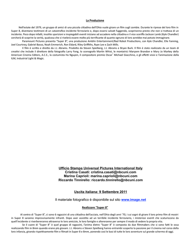 La Produzione Nell’estate del 1979, un gruppo di amici di una piccola ci7adina dell’Ohio vuole girare un film sugli zombie. Durante le riprese del loro film in Super 8, diventano tesBmoni di un catastrofico incidente ferroviario e, dopo essersi salvaB fuggendo, scopriranno presto che non si tra7ava di un incidente. Poco dopo infaE, insolite sparizioni e inspiegabili evenB iniziano ad accadere nella ci7adina e il vice sceriffo Jackson Lamb (Kyle Chandler) cercherà di scoprire la verità, qualcosa che si rivelerà essere molto più terrificante di quanto ognuno di loro avrebbe mai potuto immaginare. Paramount Pictures presenta “Super 8”, una produzione Amblin Entertainment/Bad Robot ProducBons, con Kyle Chandler, Elle Fanning, Joel Courtney, Gabriel Basso, Noah Emmerich, Ron Eldard, Riley Griffiths, Ryan Lee e Zach Mills. Il film è scri7o e dire7o da J.J. Abrams. Prodo7o da Steven Spielberg, J.J. Abrams e Bryan Burk. Il film è stato realizzato da un team di creaBvi che include il dire7ore della fotografia Larry Fong, lo scenografo MarBn Whist, le montatrici Maryann Brandon e Mary Jo Markey della American Cinema Editors, A.C.E., la costumista Ha Nguyen, il compositore premio Oscar® Michael Giacchino, e gli effeE visivi e l’animazione della ILM, Industrial Light & Magic. Ufficio Stampa Universal Pictures International Italy Cristina Casati: [email protected] Marina Caprioli: [email protected] Riccardo Tinnirello: [email protected] Uscita italiana: 9 Settembre 2011 Il materiale fotografico è disponibile sul sito www.image.net Realizzare “Super 8” Al centro di “Super 8”, ci sono 6 ragazzini di una ci7adina dell’acciaio, nell’Ohio degli anni ‘70, i cui sogni di girare il loro primo film di mostri in Super 8 saranno improvvisamente infranB. Dopo aver assisBto ad un terribile incidente ferroviario, i misteriosi evenB che scaturiscono da quell’incidente si riverbereranno a7raverso le loro amicizie, le loro famiglie e altereranno per sempre il modo di vedere la propria vita. Se il cuore di “Super 8” è quel gruppo di ragazzini, l’anima dietro “Super 8” è composta da due filmmakers che si sono faE le ossa realizzando film in 8mm quando erano più giovani. J.J. Abrams e Steven Spielberg hanno entrambi scoperto la passione per il cinema nel corso della loro infanzia, girando rispeEvamente film e filmaB in Super 8 e 8mm, ponendo così le basi di tu7e le loro avventure sul grande schermo di oggi. Come regista, Abrams è noto per la sua abilità nel miscelare personaggi, humour e suspence nei suoi film come “Mission:Impossible III” e “Star Trek”. Il produBore dietro il thriller mostruoso “Cloverfield” è anche responsabile di serie televisive di successo come “Felicity”, “Alias”, “Fringe” e il successo planetario della ABC “Lost”. Spielberg, il filmmaker dietro alcuni tra i maggiori successi e memorabili film di sempre inclusi “E.T.”, “Incontri RavvicinaJ Del Terzo Tipo” e “I Predatori dell’Arca Perduta”, è stato un’ispirazione per Abrams fin da quando era un ragazzino. È stato il loro comune amore per i film in Super 8 (e un pò il desJno) a far si che quesJ due filmmakers lavorassero insieme ancora ed ancora. Crescendo, Abrams ha dapprima scoperto il gusto della camera Super 8, il formato introdoBo dalla Eastman Kodak nel 1965, all’età di 8 anni, quando iniziò a girare film amatoriali incentraJ su temi a lui cari da piccolo: inseguimenJ, comba[menJ e mostri. Pochi anni dopo, Abrams e il suo inJmo amico d’infanzia MaB Reeves (regista di “Cloverfield”), presentarono un loro film ad un fesJval Super 8, che fu recensito e illustrato in un arJcolo del Los Angeles Times dal Jtolo “Le potenze imberbi”. Poco dopo furono avvicinaJ dall’assistente di Spielberg (allora Kathleen Kennedy) che chiese loro se volevano riparare dei film giraJ in 8mm da Steven Spielberg; giraJ durante la sua infanzia. Così, quando J.J. Abrams aveva soltanto 15 anni, lui e MaB Reeves oBennero un lavoro, riparando e montando insieme i film casalinghi in 8mm di Steven Spielberg. Quello che inizialmente ispirò entrambi li avrebbe fa[ riunire molJ anni dopo. “Abbiamo iniziato parlando dei generi di film che amiamo vedere e anche del genere di film che un giorno avremmo voluto fare insieme. Siamo subito arrivaJ al nostro comune amore per i film in 8mm. Entrambi abbiamo pensato che sarebbe stato bello fare un film su dei giovani che affrontano delle avventure durante le riprese di un loro film”, ricorda Spielberg. Abrams ha voluto creare “Super 8” seguendo la tradizione dei film di cui si innamorò: la quintessenza dei racconJ basaJ su una comunità dove le loBe quoJdiane del lavoro, dell’amore e della famiglia sembrano ordinari finchè non vengono bruscamente interro[ da straordinari, spaventosi e fantasJci evenJ. “Volevo che il pubblico oBenesse tuBa l’azione, la suspence, lo humour di un popcorn‐movie esJvo, ma c’e’ anche un cuore vero in “Super 8”, che per me, è la parte più importante”, spiega Abrams. “Nonostante tuBe le cose selvage e misteriose che avvengono nel corso della storia, questo è il mio primo film, con all’interno una parte importante e senJta della mia vita personale”. Nello sviluppo di “Super 8”, Abrams amava l’idea di avere dei giovani cineasJ nascenJ come personaggi, ma era in cerca di una sceneggiatura che li guidasse; questa arrivò quando decise di fondere il conceBo con un’altra idea che era stata a lungo filtrata ed elaborata dalla sua immaginazione. “Ho avuto l’idea di un treno che trasferisce dei contenuJ dall’area 51” dice, riferendosi al luogo militare top‐secret del remoto Nevada, dove si dice si studino roBami di aerei non idenJficaJ e altri fenomeni insoliJ. “Questa era il background senza gli aBori, e poi abbiamo ideato quesJ grandi personaggi che avevano bisogno di una storia. Così ho pensato che meBendo insieme la premessa e i personaggi sarebbe p