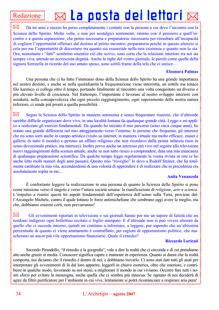 Redazione Da tre anni e mezzo ho perso completamente i contatti con la persona a cui devo l’incontro con la Scienza dello Spirito. Molte volte, e non per nostalgici sentimenti, ritorno con il pensiero a quell’incontro e a questa separazione, che penso necessaria e preparatoria: necessaria per rimediare all’incapacità di cogliere l’opportunità offertaci dal destino al primo incontro; preparatoria perché in questo silenzio si cela per me l’opportunità di discernere tra quanto sia essenziale nella mia esistenza e quanto non lo sia. Ora, nonostante i “fatti” sembrino smentire ciò che scrivo, sono certa che la relazione interiore tra noi sia sempre viva, attenda un accresciuta degnità. Anche le righe del vostro giornale, le parole come quelle della signora Serenella in ricordo del suo amato sposo, sono sottili trame della tela che ci unisce… Eleonora Palmas Una persona che ci ha fatto l’immenso dono della Scienza dello Spirito ha una grande importanza nel nostro destino, e anche se nella quotidianità la frequentazione viene interrotta, un sottile ma tenace filo karmico ci collega oltre il tempo, portando fatalmente al rincontro una volta conquistato un diverso e piú elevato livello di coscienza. Nel frattempo, l’importante è lavorare al nostro sviluppo interiore con assiduità, nella consapevolezza che ogni piccolo raggiungimento, ogni superamento della nostra natura inferiore, ci rende piú pronti a quella possibilità. Seguo la Scienza dello Spirito in maniera autonoma e senza frequentare riunioni, che d’altronde sarebbe difficile organizzare dove vivo, in una località lontana da qualunque grande città. Leggo e mi applico a realizzare gli esercizi fondamentali. Da quando ho iniziato il mio percorso (sono circa cinque anni), ho notato una grande differenza nel mio atteggiamento verso l’esterno, le persone che frequento, gli interessi che mi sono sorti anche in campo artistico (visito su internet, in maniera virtuale ma molto efficace, musei e gallerie di tutto il mondo) e persino un afflato religioso che non ricordavo dalla prima infanzia (non in senso devozionale pratico, ma interiore). Inoltre provo anche un interesse piú vivo nel seguire alla televisione nuovi raggiungimenti della scienza attuale, anche se non tutto riesco a comprendere, data una mia mancanza di qualunque preparazione scientifica. Da qualche tempo leggo regolarmente la vostra rivista in rete (e ho anche letto molti numeri degli anni passati). Questo mio “risveglio” lo devo a Rudolf Steiner, che ha totalmente cambiato la mia vita, accendendomi di una volontà di apprendere e di realizzare che in precedenza era assolutamente sopita in me… Anita Venanzola È confortante leggere la realizzazione in una persona di quanto la Scienza dello Spirito si pone come missione verso il singolo e verso l’intera società umana: la riunificazione di religione, arte e scienza. L’impulso a riunire questi tre aspetti fondamentali dell’esperienza dell’uomo sulla Terra, proviene dall’Arcangelo Michele, contro il quale lottano le forze antimicheliane che sembrano oggi avere la meglio, ma che, dobbiamo esserne certi, non prevarranno! Gli avvenimenti riportati in televisione o sui giornali hanno per me un sapore di falsità che mi rendono indigesto ogni bollettino recitato o foglio stampato. E d’altronde non si può vivere alienati da quello che ci succede intorno, quindi mi continuo a informare, a leggere, pur sapendo che un’altissima percentuale di quanto ci viene ammannito è contraffatto, per ragioni di opportunismo politico, che mascherano un ancor piú vile opportunismo finanziario. Quale il rimedio? Riccardo Loricati Secondo Pirandello, “il rimedio è la geografia”, vale a dire la realtà che ci circonda e di cui prendiamo atto anche grazie ai media. Conoscere significa capire e maturare in esperienza. Quanto ai danni che la realtà comporta, noi diciamo che il rimedio è dentro di noi, e dobbiamo trovarlo. Ci sono stati dati tutti gli aiuti per interpretare gli avvenimenti di là dal loro apparire, leggerli in chiave esoterica, oltre che esteriore, e contribuire in qualche modo, lavorando su noi stessi, a migliorare il mondo in cui viviamo. Occorre fare tutti i nostri sforzi per evitare la menzogna, anche quella che ci sembra piú innocua. Se ognuno di noi deciderà di agire da filtro purificatore per l’ambiente in cui vive, lentamente si potrà ricominciare a respirare aria pura! 34 L’Archetipo – agosto 2007 Mi interesso a diverse discipline, tra cui l’antroposofia, per cercare di risvegliare in me quel senso del sacro che ricordo vagamente appartenuto ai primi anni della mia vita, naturalmente allora in modo ingenuo e infantile. Invece oggi, pur frequentando gruppi di vario genere, tutti orientati al “risveglio interiore”, non riesco a recuperare il credo in una sopravvivenza dell’anima, e resto nella convinzione che ci siamo nei millenni raccontati delle belle favole… Alberto Trebisacce Un aneddoto racconta che a New York, sulla porta della Società Nietzsche, era stata posta una lavagna d’ardesia dove era possibile, per chi trovava la porta chiusa, lasciare con il gesso un messaggio. Un giorno un visitatore vi riportò per scherzo le parole del filosofo dell’Anticristo: «Dio è morto. Firmato: Nietzsche». Un altro vi aggiunse poi queste parole: «Nietzsche è morto. Firmato: Dio». Ci è data la facoltà di aderire al primo o al secondo dei due paradossi: questa è la nostra libertà. Ma la vita ci porta continuamente incontro la possibilità di comprendere quanto esiste oltre la fisicità e tesse la trama del divenire del mondo. Sta a noi aderirvi, per ampliare i ristretti orizzonti delle conclamate conoscenze materialistiche. Osservando il comportamento di molti, ormai troppi, personaggi che affollano la cronaca, viene fatto di pensare che non esista piú, se mai è realmente esistito, l’uomo capace di vivere veramente nello spirituale, di “angelica
