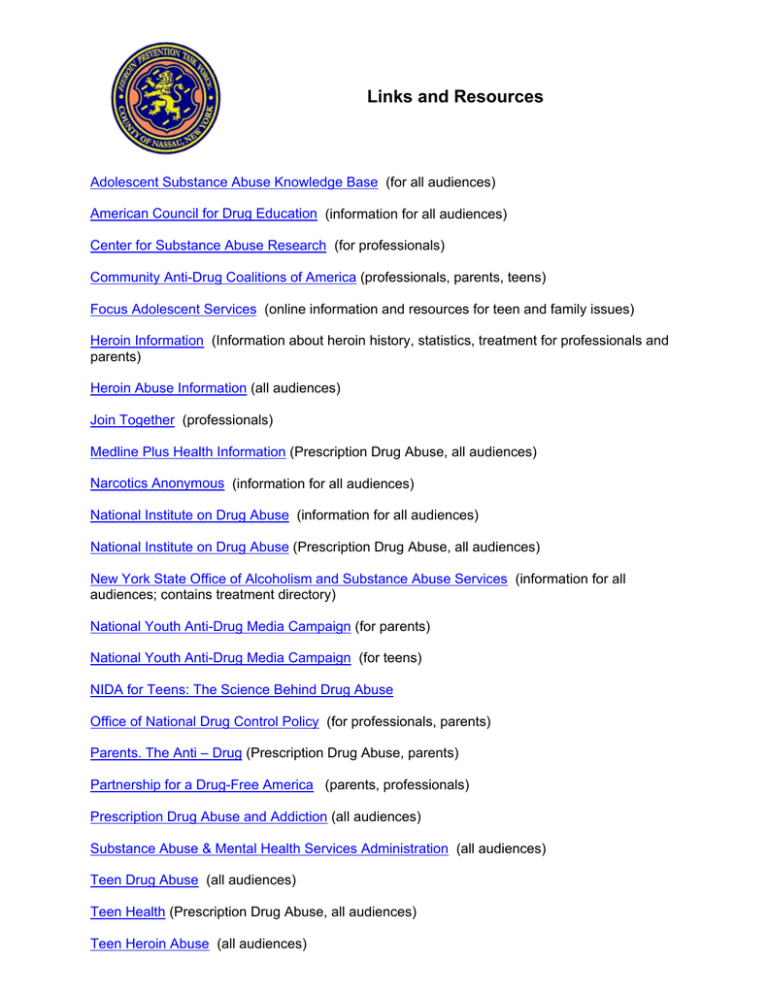 Links and Resources Adolescent Substance Abuse Knowledge Base (for all audiences) American Council for Drug Education (information for all audiences) Center for Substance Abuse Research (for professionals) Community Anti-Drug Coalitions of America (professionals, parents, teens) Focus Adolescent Services (online information and resources for teen and family issues) Heroin Information (Information about heroin history, statistics, treatment for professionals and parents) Heroin Abuse Information (all audiences) Join Together (professionals) Medline Plus Health Information (Prescription Drug Abuse, all audiences) Narcotics Anonymous (information for all audiences) National Institute on Drug Abuse (information for all audiences) National Institute on Drug Abuse (Prescription Drug Abuse, all audiences) New York State Office of Alcoholism and Substance Abuse Services (information for all audiences; contains treatment directory) National Youth Anti-Drug Media Campaign (for parents) National Youth Anti-Drug Media Campaign (for teens) NIDA for Teens: The Science Behind Drug Abuse Office of National Drug Control Policy (for professionals, parents) Parents. The Anti – Drug (Prescription Drug Abuse, parents) Partnership for a Drug-Free America (parents, professionals) Prescription Drug Abuse and Addiction (all audiences) Substance Abuse & Mental Health Services Administration (all audiences) Teen Drug Abuse (all audiences) Teen Health (Prescription Drug Abuse, all audiences) Teen Heroin Abuse (all audiences) The Drug & Alcohol Scene (The Latest Drug & Alcohol News from the Partnership for a DrugFree America) (all audiences) Time to Talk (tools for parents to keep kids drug-free) Tips for Teens: The Truth about Heroin (young people)
