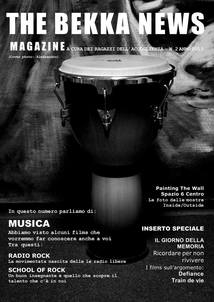 THE BEKKA NEWS M A G A Z I N E A CURA DEI RAGAZZI DELL’ACCOGLIENZA - N.2 ANNO 2013 (Cover photo: Alessandro) Painting The Wall Spazio 6 Centro Le foto delle mostre Inside/Outside In questo numero parliamo di: MUSICA Abbiamo visto alcuni films che vorremmo far conoscere anche a voi Tra questi: RADIO ROCK La movimentata nascita delle le radio libere SCHOOL OF ROCK Un buon insegnante è quello che scopre il talento che c’è in noi INSERTO SPECIALE IL GIORNO DELLA MEMORIA Ricordare per non rivivere I films sull’argomento: Defiance Train de vie SCHOOL OF ROCK Immaginate una jam session di 110 minuti in cui l'intera storia del rock viene rivisitata. Un musicista, bravo ma incontrollabile, viene cacciato dalla band da lui stesso creata e, grazie ad un inganno, si sostituisce all'amico professore nella scuola più prestigiosa dello stato; seguono varie peripezie che lo portano a far scoprire negli annoiati studenti l'amore per la musica ed il senso della vita. School of Rock è un film spassoso, con una colonna sonora semplicemente epocale. I ragazzi della classe, anzi della “scuola del rock”, sono assolutamente strabilianti, sia dal punto di vista musicale (tutti i pezzi sono in “presa diretta") che di presenza scenica e danno un plus di vitalità e freschezza al film. Hip-Hop L'Hip-Hop è un genere di musica fantastica. L'Hip Hop è basato sulle rime e si può fare anche “freestyle”, consistente nel "rappare" su una base improvvisando rime a tempo della stessa. Con alcuni miei amici ho composto una canzone: “La libertà non ha prezzo”. Su questo giornale verrà pubblicato un mio pezzo, anche se parzialmente tagliato per questioni di eleganza!!! Io sono “Fabio” e il mio amico di Rap è Daniel (testo non pervenuto - N.d.R.). L' Hip-Hop è nato a New York e a Los Angeles, nei quartieri malfamati. E’ nato così uno stile di vita, un modo di vestirsi. E’ anche un ballo bellissimo direi acrobatico - e ci vuole un fisico davvero bestiale. Un'altra pratica è quella delle “Tag”, cioè scrivere sui muri senza farsi vedere. Oggi questo genere di musica è diffuso in tutto il mondo. Anche in Italia ci sono cantanti famosi come “Mondo Marcio”, il bravissimo “Ensi”, “Uanamayl” di Torino e “Emis Kila”. In Romania c'è un gruppo chiamato “Para Zizi”, e anche i “Bug mafia”, mentre in Albania i “Noizy”, e “Stresi”. Questo film ci ha fatto venir voglia di parlare di musica… per come la viviamo NOI. Una mattina ti svegli ed è scomparsa la musica… Che fai? Se una mattina dovessi svegliarmi senza musica penso che sarebbe proprio una brutta sensazione, perché senza musica impazzirei… Però forse invece di impazzire incomincerei a produrre dei testi con amici miei - cosa che già ogni tanto facevamo - e potremo trasmettere la nostra musica e il nostro messaggio a tante persone. FABIO La musica e il Rap GABRIELE Per me la musica serve tanto nella vita, soprattutto il rap. Perché i rappers ti raccontano la loro vita e ti danno molti consigli per evitare guai. Io ascolto il rap perché per me è l'unico genere di musica che ti trasmette qualcosa; viaggiando con la tua mente quelle canzoni ti danno anche una lezione di vita. Spesso ascoltandola ti dimentichi dei problemi che hai e ti tira su di morale. OMAR 1 Il Rap romano Il rap al giorno d'oggi è conosciuto in tutto il mondo e sempre più artisti incominciano a produrre testi per emergere e farsi conoscere. Lo stile rap di cui voglio scrivere oggi è il “rap romano”. Il “rap romano” da 2-3 anni a questa parte è stato riscoperto dai ragazzi grazie a Noyz Narcos del Truceklan che piano piano si è fatto strada nel mondo dell'Hip-hop ed è diventato una star di grande successo. Con il successo del Truceklan tanti altri artisti di Roma sono emersi: GENTE DE BORGATA, IN THE PANCHINE, BROKEN SPEAKERS, COLLE DER FOMENTO e tanti altri ancora… LA MUSICA BRASILIANA Secondo me, la musica brasiliana più che una musica è uno stile di vita. Ogni anno a febbraio, quando arriva il carnevale, la mia città, Rio de Janeiro, si trasforma. Le persone cambiano dal bianco al nero e la cosa principale che le fa cambiare è la musica. In questa musica penso che ognuno ci metta la passione, la voglia di divertirsi e di festeggiare tutti insieme e metta da parte qualsiasi sentimento e pensiero brutto. Il rap romano di questi giorni è il più seguito tra noi ragazzi perché secondo me è uno stile di fare musica diverso dagli altri e quello che è scritto nei testi è qualcosa di vero che rispecchia le loro parole, tante vite di ragazzi come me. Il “ rap” mi ha sempre appassionato, infatti ne ascolto un po’ di tutto, anche straniero. Il rap italiano, a mio parere, sta diventando sempre più commerciale ed è quindi finto, fatto solo per fare soldi. La maggior parte degli artisti romani produce musica per il gusto e il piacere di farlo; il che rende i testi e il messaggio che li racchiude musica “vera”. Quindi se dovessi dare un consiglio ad altri ragazzi direi di “supportare” di più il rap romano, invece che buttare soldi nei dischi di artisti come i CLUB DOGO, EMIS KILLA e tutti gli altri artisti milanesi. Ci si sfoga ballando la samba, la danza tipica nazionale; dal più brutale criminale al sindaco, tutti si cimentano nelle sfilate della città famose in tutto il mondo, insieme ai milioni di turisti che vengono ad assistere al “carnevale più famoso del mondo.” Questa musica rende tutto più bello, esprime la felicità, l'ospitalità e l'allegria del popolo brasiliano, che ne va orgoglioso. Ha un ritmo incredibile ed inimitabile che fa muovere anche “il più pezzo di legno”. Ti entra nel sangue e ti arriva fino dentro al cervello e, anche se magari non sei capace, il tuo corpo si muove da solo e ti lanci in mezzo ai fiumi di gente per strade di Rio in festa. E' un stile di musica che ti accompagna, ti coinvolge e fa divertire anche il più depresso. Io la consiglierei come terapia p