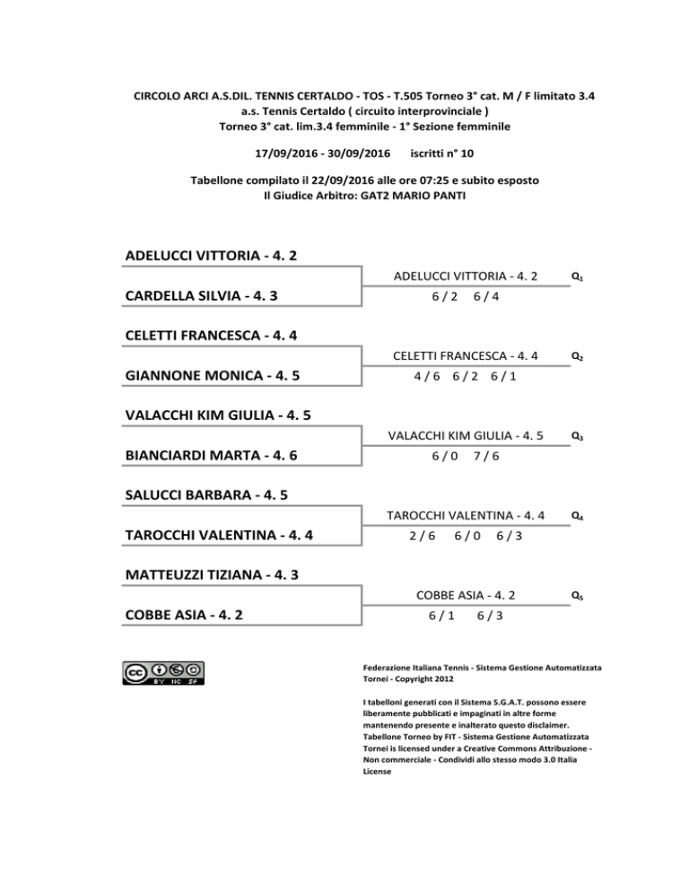 CIRCOLO ARCI A.S.DIL. TENNIS CERTALDO - TOS - T.505 Torneo 3° cat. M / F limitato 3.4 a.s. Tennis Certaldo ( circuito interprovinciale ) Torneo 3° cat. lim.3.4 femminile - 1° Sezione femminile 17/09/2016 - 30/09/2016 iscritti n° 10 Tabellone compilato il 22/09/2016 alle ore 07:25 e subito esposto Il Giudice Arbitro: GAT2 MARIO PANTI ------------------------------- ------------------------------- ADELUCCI VITTORIA - 4. 2 ADELUCCI VITTORIA - 4. 2 CARDELLA SILVIA - 4. 3 6/2 Q1 6/4 CELETTI FRANCESCA - 4. 4 CELETTI FRANCESCA - 4. 4 GIANNONE MONICA - 4. 5 Q2 4/6 6/2 6/1 VALACCHI KIM GIULIA - 4. 5 VALACCHI KIM GIULIA - 4. 5 BIANCIARDI MARTA - 4. 6 6/0 Q3 7/6 SALUCCI BARBARA - 4. 5 TAROCCHI VALENTINA - 4. 4 TAROCCHI VALENTINA - 4. 4 2/6 6/0 Q4 6/3 MATTEUZZI TIZIANA - 4. 3 COBBE ASIA - 4. 2 COBBE ASIA - 4. 2 6/1 Q5 6/3 Federazione Italiana Tennis - Sistema Gestione Automatizzata Tornei - Copyright 2012 I tabelloni generati con il Sistema S.G.A.T. possono essere liberamente pubblicati e impaginati in altre forme mantenendo presente e inalterato questo disclaimer. Tabellone Torneo by FIT - Sistema Gestione Automatizzata Tornei is licensed under a Creative Commons Attribuzione Non commerciale - Condividi allo stesso modo 3.0 Italia License