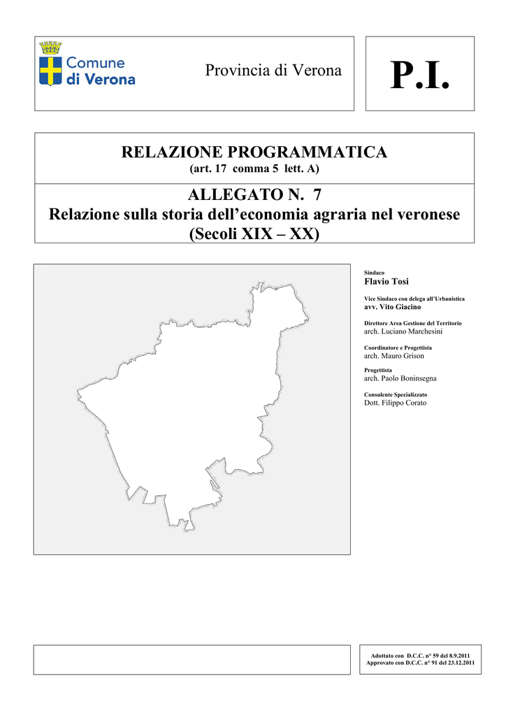 P.I. Provincia di Verona RELAZIONE PROGRAMMATICA (art. 17 comma 5 lett. A) ALLEGATO N. 7 Relazione sulla storia dell’economia agraria nel veronese (Secoli XIX – XX) Sindaco Flavio Tosi Vice Sindaco con delega all’Urbanistica avv. Vito Giacino Direttore Area Gestione del Territorio arch. Luciano Marchesini Coordinatore e Progettista arch. Mauro Grison Progettista arch. Paolo Boninsegna Consulente Specializzato Dott. Filippo Corato Adottato con D.C.C. n° 59 del 8.9.2011 Approvato con D.C.C. n° 91 del 23.12.2011 Focalizzare l’attenzione sulla graduale evoluzione di un settore economico comporta, soprattutto se in relazione ad un territorio da sempre particolarmente dinamico e strategico come il Veronese, una valutazione globale della realtà in cui tale sviluppo si è concretizzato nel tempo. Quando infatti i protagonisti principali di un processo produttivo millenario coinvolgono una svariata molteplicità di istanze, si pone come necessaria un’approfondita analisi delle condizioni in cui tali attori recitano. Componenti fondamentali per questo particolare studio, sebbene non esauriente, risultano infatti la cornice storico – istituzionale di riferimento, le condizioni economiche generali del periodo, la manodopera e gli spazi territoriali coinvolti; infine i risultati quantitativamente e qualitativamente raggiunti. Per comprensibili motivazioni, la ricerca verrà condotta attraverso valutazioni, stime ed ipotesi nel medio – lungo periodo, in riferimento alle principali cesure politico – istituzionali che hanno contraddistinto la realtà veronese nel corso dei secoli XIX e XX. Inoltre verranno analizzate le principali correnti produttive, in riferimento al settore primario veronese, soprattutto per quanto riguarda la frutticoltura, l’orticoltura e l’allevamento. La struttura della relazione cercherà il più possibile di mantenere in stretta simbiosi la realtà cittadina, centro decisionale per eccellenza, ed il territorio circostante, dove la copiosità di terreni destinati alla produzione agraria risulta comprensibilmente più rilevante. L’età moderna E’ tuttavia doveroso tracciare una breve introduzione di carattere storico – urbanistico relativa ai quattro secoli di dominazione veneziana nel centro scaligero, arco cronologico in cui la città ha subito profonde trasformazioni in svariati settori: da quello politico a quello edilizio; da quello economico a quello militare. A questo proposito è necessario sottolineare come tecnici quali Michele Sanmicheli si siano attivati per fornire la città di una solida cinta muraria, essenzialmente per scopi difensivi, vista la funzione eminentemente militare che la Dominante assegnava al centro scaligero 1 . Ma ciò che più contraddistingue tale intervento è sicuramente l’intenzione di ottenere un elemento nuovo all’interno dell’ambito urbanistico cittadino: la Spianà. Definita infatti da un decreto del 18 novembre 1517, tale progetto prevede l’eliminazione, per il raggio di circa 1,6 km (funzionale alla gittata dell’artiglieria in 1 Sull’imponente opera di fortificazione attuata nello Stato da Terra veneto nel corso dell’età moderna, cfr. E. CONCINA, La macchina territoriale. La progettazione della difesa nel Cinquecento veneto. Bari: Laterza, 1983 e J. R. HALE, Terra Ferma Fortifications in the Cinquecento, in Florence and Venice: Comparisons and Relations, Acts of two Conferences at Villa I Tatti in 1976 – 1977, a cura di S. BERTELLI, N. RUBINSTEIN, C. H. SMITH, II. Firenze: Nuova Italia, 1980, pp. 170 – 187. 2 uso), di edifici, alberi e coltivazione a vite, l’estirpazione di siepi, il trasferimento delle colture di canapa e sorgo, in modo tale che la detta fascia rimanga del tutto deserta. Si tratta di una ferita non tralasciabile, una netta cesura tra l’area urbana (a carattere spiccatamente amministrativo e commerciale) e la campagna circostante. In realtà, all’interno delle mura scaligere sopravvivevano ancora, soprattutto nei cortili privati e nelle proprietà ecclesiastiche, orti botanici, giardini, piccoli frutteti, utili alla sussistenza della popolazione. L’estensione delle aree destinate alla coltivazione, tuttavia, risultava comprensibilmente limitata nella circoscrizione amministrativa cittadina, rispetto ai vastissimi appezzamenti di terreno controllati soprattutto da nobili locali e veneziani distribuiti nel contado. Alcune preziose fonti fiscali relative alla metà del XVII secolo, le polizze redatte dai contribuenti, permettono tuttavia di segnalare alcune significative proprietà agricole nei pressi della Campagnola (zona nord) e di Montorio. In generale, comunque, lungo tutto l’arco cronologico relativo all’età moderna (che corrisponde sostanzialmente al periodo veneziano del territorio veronese), i limiti maggiori per la ricostruzione storica sono rappresentati dall’alta problematicità delle fonti. Pur in presenza di una copiosa molteplicità di dati, ricavabili essenzialmente da archivi privati ed ecclesiastici o atti notarili, la difficoltà maggiore risulta l’estrema eterogeneità delle informazioni 2 . Innanzitutto si pone il problema delle condizioni delle campagne e delle relative rese agrarie che, facendo riferimento alle attente indicazioni fornite dai rettori veneziani, sembrerebbero rimanere costanti lungo i secoli XVI e XVII. In questo periodo, infatti, l’agricoltura veronese presenta i caratteri di una intrinseca povertà, di una prolungata stagnazione. In secondo luogo è necessario indagare la percentuale di occupati nel settore primario, la manodopera realmente coinvolta sui terreni agricoli, soprattutto in una economia di tipo preindustriale. Anche in questo caso si rivelano illuminanti le indicazioni dei rettori in loco, che testimoniano sicuramente un’età media bassissima (circa il 90% non raggiungeva i 16 anni) e, a livello quantitativo, stando alla rilevazione del 1616 di Giovanni Contarini, la popolazione complessiva si aggirava s
