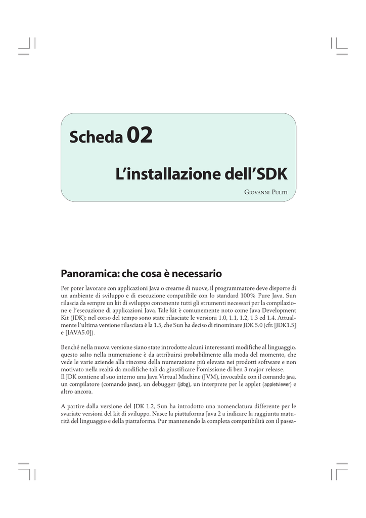 Scheda 02 L’installazione dell’SDK GIOVANNI PULITI Panoramica: che cosa è necessario Per poter lavorare con applicazioni Java o crearne di nuove, il programmatore deve disporre di un ambiente di sviluppo e di esecuzione compatibile con lo standard 100% Pure Java. Sun rilascia da sempre un kit di sviluppo contenente tutti gli strumenti necessari per la compilazio ne e l’esecuzione di applicazioni Java. Tale kit è comunemente noto come Java Development Kit (JDK): nel corso del tempo sono state rilasciate le versioni 1.0, 1.1, 1.2, 1.3 ed 1.4. Attual mente l’ultima versione rilasciata è la 1.5, che Sun ha deciso di rinominare JDK 5.0 (cfr. [JDK1.5] e [JAVA5.0]). Benché nella nuova versione siano state introdotte alcuni interessanti modifiche al linguaggio, questo salto nella numerazione è da attribuirsi probabilmente alla moda del momento, che vede le varie aziende alla rincorsa della numerazione più elevata nei prodotti software e non motivato nella realtà da modifiche tali da giustificare l’omissione di ben 3 major release. Il JDK contiene al suo interno una Java Virtual Machine (JVM), invocabile con il comando java, un compilatore (comando javac), un debugger (jdbg), un interprete per le applet (appletviewer) e altro ancora. A partire dalla versione del JDK 1.2, Sun ha introdotto una nomenclatura differente per le svariate versioni del kit di sviluppo. Nasce la piattaforma Java 2 a indicare la raggiunta matu rità del linguaggio e della piattaforma. Pur mantenendo la completa compatibilità con il passa to, Java 2 offre finalmente maggiore stabilità, performance, ottimizzazione dell’uso della me moria, sicurezza e altro ancora. Con la Java 2 nasce il concetto di SDK: non più un Java Development Kit ma un Software Development Kit: il linguaggio Java può essere considerato finalmente uno strumento potente general purpose. La notazione di JDK non è stata eliminata: il JDK è formalmente una release dell’SDK Java 2. Con Java 2, Sun ha suddiviso l’SDK in tre grandi categorie, per organizzare e raccogliere me glio le molte tecnologie che costituiscono ormai la piattaforma: • Java 2 Standard Edition (J2SE): questa edition contiene la JVM standard più tutte le librerie necessarie per lo sviluppo della maggior parte delle applicazioni Java. • Java 2 Enterprise Edition (J2EE): questa edizione contiene in genere le API enterprise, ovvero quelle rivolte alla realizzazione di applicazioni di dimensioni medie e grandi, quali EJB, JDBC 2.0, Servlet e così via. La JVM normalmente è la stessa della SE, per cui lavorare direttamente con l’SDK in bundle spesso non è molto utile: molto meglio partire dalla versione J2SE ed aggiungere l’ultima versione delle API EE a seconda delle proprie esigenze. • Java 2 Micro Edition (J2ME): Java è nato come linguaggio portabile in grado di essere eseguito con ogni tipo di dispositivo. La J2ME include una JVM e un set di API e libre rie appositamente limitate per poter essere eseguite su piccoli dispositivi embedded, telefoni cellulari e altro ancora. Questa configurazione deve essere scelta solo se effet tivamente si vogliono scrivere applicazioni per questa tipologia di apparecchiature. Il processo di installazione è in genere molto semplice, anche se sono necessarie alcune accortezze per poter permettere un funzionamento ottimale della JVM e dei programmi Java. Si limiterà l’attenzione alla distribuzione J2SE: per chi fosse interessato a scrivere programmi J2EE non ci sono particolari operazioni aggiuntive da eseguire, se non quelle di scaricare le librerie in grado di fornire il supporto per le API utilizzate; per la J2ME le operazioni sono sostanzial mente analoghe anche se si deve seguire un procedimento particolare a seconda del dispositivo scelto e della versione utilizzata. I file per l’installazione possono essere trovati direttamente sul sito della Sun come indicato in [SDK]. Altri produttori rilasciano JVM diverse per piattaforme particolari (molto note ed ap prezzate quelle di IBM). Per la scelta di JVM differenti da quelle prodotte da Sun si possono seguire le indicazioni della casa produttrice o del particolare sistema operativo utilizzato. Chi non fosse interessato a sviluppare applicazioni Java, ma solo a eseguire applicazioni già finite, invece dell’SDK potrà scaricare il Java Runtime Environment (JRE) che in genere segue le stesse edizioni e release dell’SDK. Ma non sempre il JRE è sufficiente: ad esempio, se si volessero eseguire applicazioni JSP già pronte, potrebbe essere necessario ugualmente mettere 6 MokaCode a disposizione di Tomcat (o di un altro motore servlet-JSP) un compilatore Java necessario per la compilazione delle pagine JSP. Esempio: installazione Su Windows In ambiente Windows in genere il file di installazione è un eseguibile autoinstallante che guida l’utente nelle varie fasi della procedura. Non ci sono particolari aspetti da tenere in considerazione a parte quelli relativi alla directory di installazione e alle variabili d’ambiente da configurare. Per il primo aspetto, a volte installa re nella directory c:\program files può portare a problemi di esecuzione di alcuni applicativi Java che utilizzano la JVM di sistema (ad esempio Tomcat o JBoss). Per questo si consiglia di instal lare in una directory con un nome unico e senza spazi o altri caratteri speciali (c:\programs, c:\programmi o semplicemente c:\java sono buoni esempi). Per poter funzionare, una qualsiasi applicazione Java necessita di sapere dove è installato il JDK, vale a dire di conoscere il path degli eseguibili java (l’interprete), javac (il compilatore Figura 1 — In Windows, il pannello di controllo permette di impostare le diverse variabili d’ambiente. Scheda 02 ☞ L’installazione dell’SKD 7 Figura 2 — Impostare la variabile JAVA_HOME in modo che punti alla directory di installazione del JDK. necessario ad esempio a Tomcat per compilare le pagine JSP), e di altri programmi che sono inclusi n