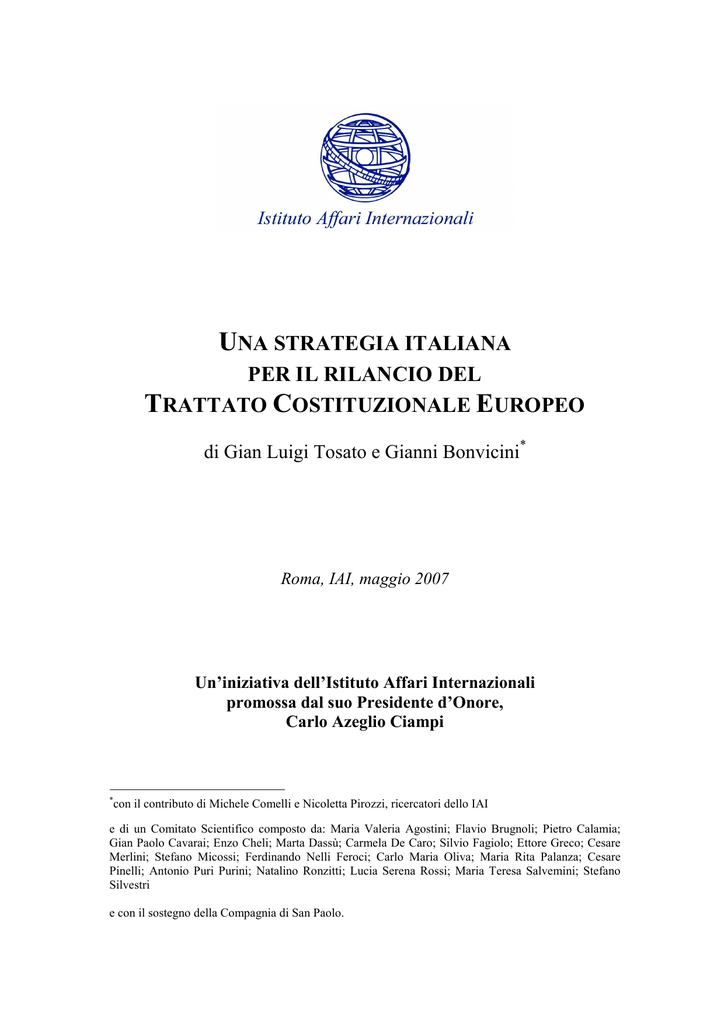 UNA STRATEGIA ITALIANA PER IL RILANCIO DEL TRATTATO COSTITUZIONALE EUROPEO di Gian Luigi Tosato e Gianni Bonvicini* Roma, IAI, maggio 2007 Un’iniziativa dell’Istituto Affari Internazionali promossa dal suo Presidente d’Onore, Carlo Azeglio Ciampi * con il contributo di Michele Comelli e Nicoletta Pirozzi, ricercatori dello IAI e di un Comitato Scientifico composto da: Maria Valeria Agostini; Flavio Brugnoli; Pietro Calamia; Gian Paolo Cavarai; Enzo Cheli; Marta Dassù; Carmela De Caro; Silvio Fagiolo; Ettore Greco; Cesare Merlini; Stefano Micossi; Ferdinando Nelli Feroci; Carlo Maria Oliva; Maria Rita Palanza; Cesare Pinelli; Antonio Puri Purini; Natalino Ronzitti; Lucia Serena Rossi; Maria Teresa Salvemini; Stefano Silvestri e con il sostegno della Compagnia di San Paolo. 1. Un’esigenza di chiarezza Il tema del futuro istituzionale dell’Europa è di nuovo al centro dell’agenda europea: ad esso sarà dedicato il Consiglio europeo del prossimo giugno; è anche fissata una scadenza (le elezioni del Parlamento europeo nel 2009) entro la quale le nuove regole dovrebbero entrare in vigore. La riapertura del confronto su questo tema risponde ad un’ineludibile esigenza di chiarezza. A quasi sette anni dalla dichiarazione di Nizza sul futuro dell’Europa, sei dalla analoga e più articolata dichiarazione di Laeken, cinque dall’inizio dei lavori della Convenzione di Bruxelles, quasi tre dalla solenne sottoscrizione del Trattato costituzionale a Roma da parte di tutti gli Stati membri, e dopo che diciotto di loro lo hanno anche ratificato, è tempo ormai di uscire da una situazione di ambiguità e incertezza. Che dopo lo shock dei no francese e olandese si sia optato per una pausa di riflessione, lo si comprende; ma la pausa non può prolungarsi sine die bloccando nel frattempo qualsiasi alternativa. Senza le riforme di cui ha urgente bisogno, l’Unione non è in grado di corrispondere alle attese dei suoi cittadini e tenere il passo con le sfide globali contemporanee. Risultano inoltre assai problematici ulteriori allargamenti. Di più: sarebbe sbagliato considerare come definitivamente acquisiti ed irreversibili i risultati fin qui conseguiti. Una situazione prolungata di stallo rischia di innescare un processo di involuzione, se non anche di disgregazione, della costruzione europea. Si impone dunque a questo punto un confronto aperto e leale sul futuro dell’Europa, da esaurirsi in tempi brevi. Lo esige un basilare obbligo di buona fede e correttezza che fa carico a tutti gli Stati membri, specie a quelli che non hanno ancora ratificato il Trattato costituzionale. Dal confronto emergerà, auspicabilmente, un progetto di casa comune condiviso da tutti. Le premesse per un accordo generale sicuramente esistono; ma se dovessero prevalere le difficoltà, occorrerà prenderne realisticamente atto e pensare a soluzioni alternative. Non c’è da meravigliarsi che sul futuro dell’Europa (ora a ventisette) si manifestino divergenze. Ma è nell’interesse di tutti superare una fase di stallo, suscettibile di creare pericolose frustrazioni e tensioni. Ogni Stato è libero di aderire o meno al nuovo Trattato. Deve essere chiaro, però, agli Stati dissenzienti che essi non possono impedire agli altri Stati di perseguire l’obiettivo di “un’unione sempre più stretta”. Tanto più poi se si tratta di una larga maggioranza dei governi e popoli europei. È dunque auspicabile che, anche nel caso di divergenze insormontabili sul nuovo Trattato, si arrivi comunque ad un accordo tra Stati pro e contro, in modo da regolare con reciproca soddisfazione la posizione degli uni e degli altri rispetto all’Unione. 2. Un difficile compromesso Intorno alla sorte del Trattato costituzionale si delineano, per ragioni obiettive, due distinti schieramenti: i diciotto Stati ratificanti più i due (Portogallo e Irlanda) che si sono comunque dichiarati “Amici” della Costituzione europea, da una parte; gli Stati del no referendario (Francia e Olanda) e quelli (i rimanenti cinque) che hanno rinviato le procedure di ratifica, dall’altra. Per i primi la soluzione ideale sarebbe di lasciare il trattato così com’è; i secondi reclamano per contro sostanziali modifiche, e taluni di essi preferirebbero anzi accantonare il Trattato costituzionale in blocco. È chiaro che le posizioni contrapposte dei due gruppi si escludono a vicenda. Se si vuole raggiungere un accordo, un compromesso appare inevitabile; ma in quali termini? Hanno ragione i componenti del primo gruppo a dire che il maggiore sforzo negoziale deve venire da quelli del secondo, perché sono loro ad avere creato il problema. Ma non si potrà realisticamente prescindere dalle difficoltà degli Stati non ratificanti, se si vuole uno sbocco positivo della trattativa. Occorre dunque ricercare una soluzione che soddisfi una duplice esigenza: quella degli Stati ratificanti, che non possono rinunciare ai punti essenziali del Trattato costituzionale; e quella degli 2 Stati non ratificanti, per i quali è da escludere la riproposizione sostanzialmente inalterata di un testo già respinto dal voto popolare o comunque fortemente contrastato all’interno del Paese. Soluzioni che non tengano adeguatamente conto di questa duplice esigenza difficilmente potranno avere successo. Numerose sono le proposte avanzate negli ultimi mesi per superare lo stallo del processo di ratifica. Le diverse soluzioni individuate possono ricondursi sostanzialmente a quattro: - Nizza plus; Trattato costituzionale così com’è; Trattato costituzionale plus; Trattato costituzionale minus. 3. Due soluzioni non praticabili Nizza Plus. Ripartire dal Trattato di Nizza e costruirci sopra degli elementi aggiuntivi significherebbe negare due anni di negoziato all’interno della Convenzione sul Futuro dell’Europa e varie decisioni del Consiglio europeo, a cominciare da quella fondamentale di Laeken del 2001. Non bisogna poi dimenticare che il testo del Trattato costituzionale 